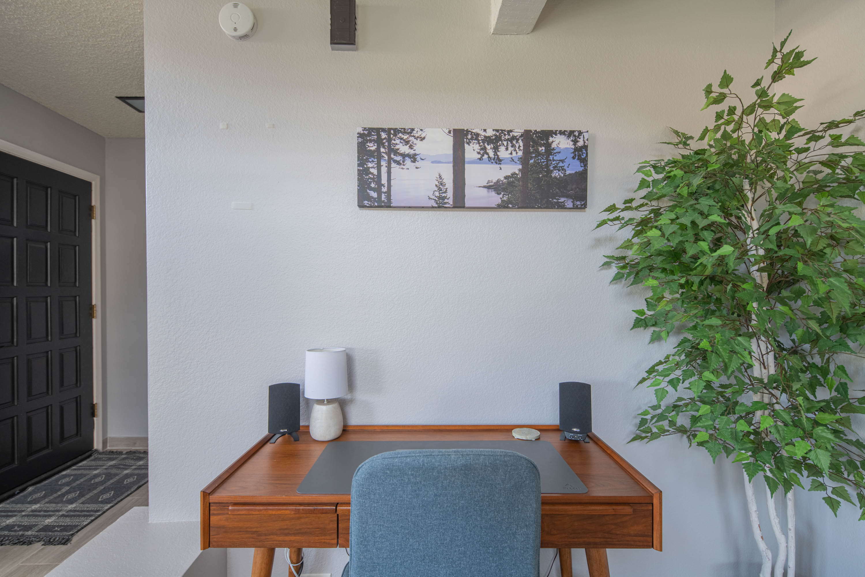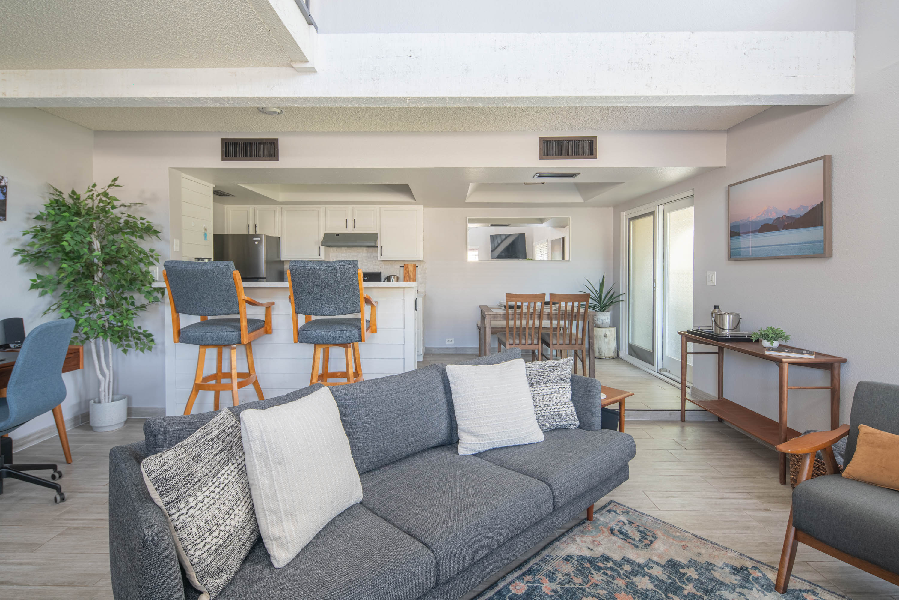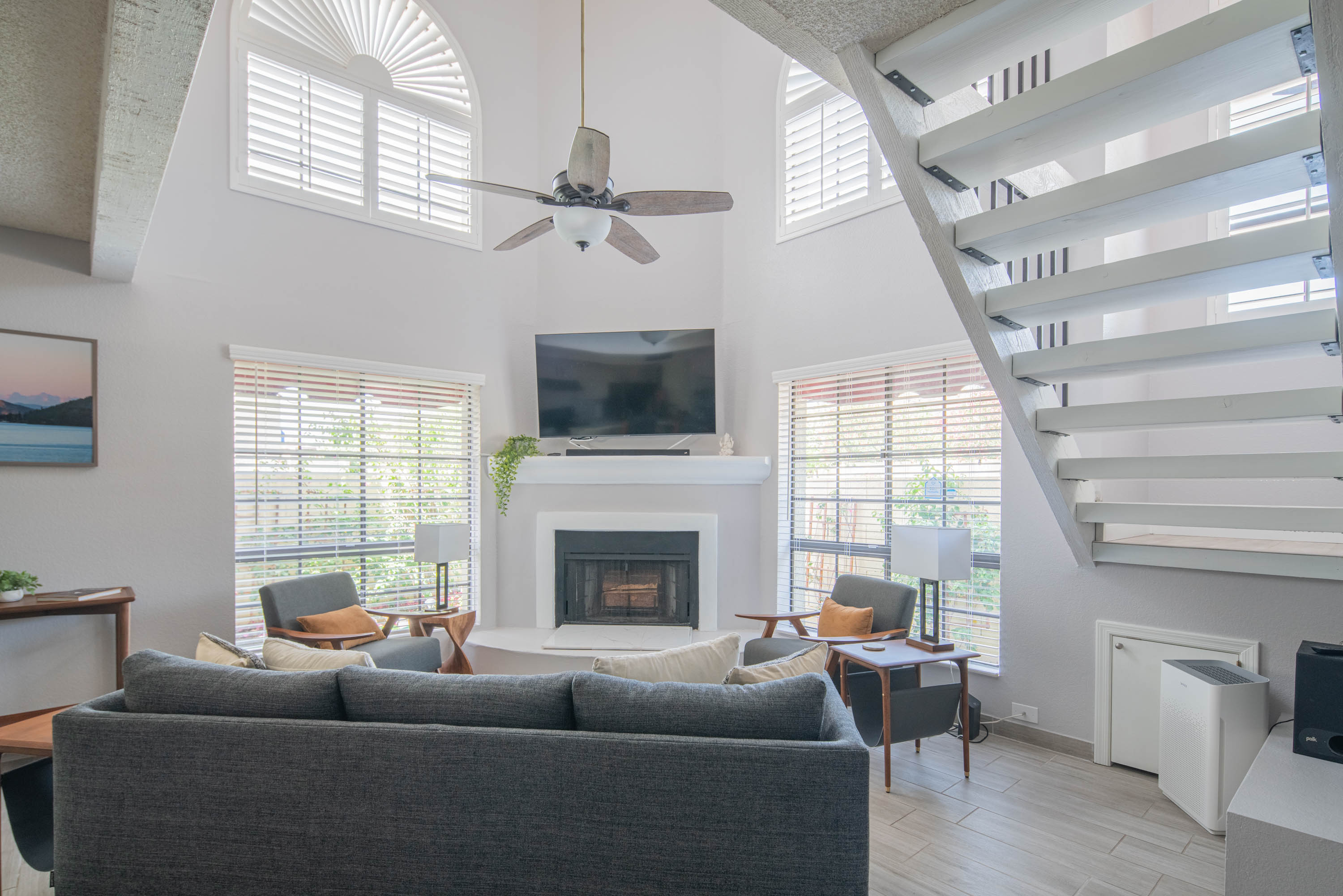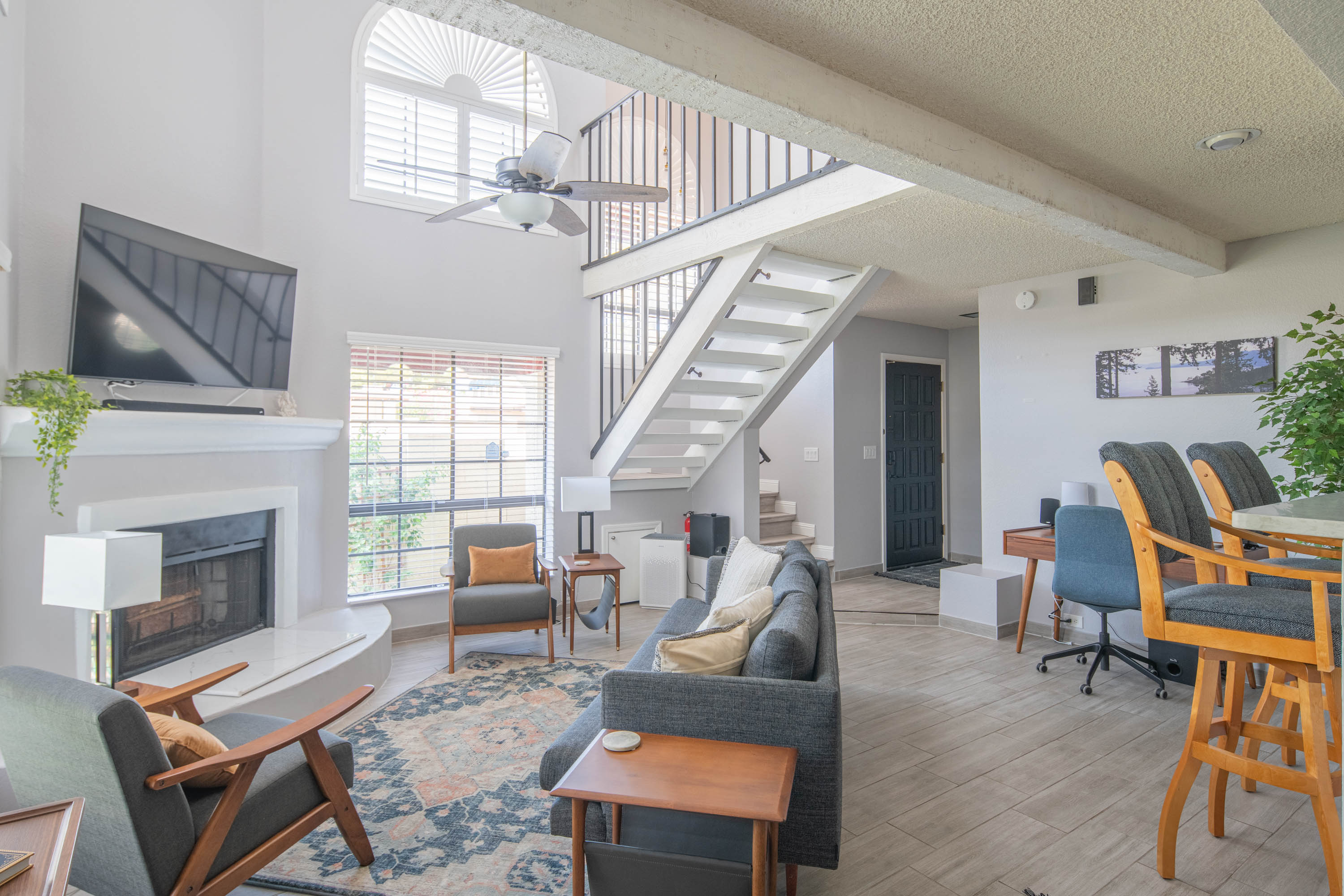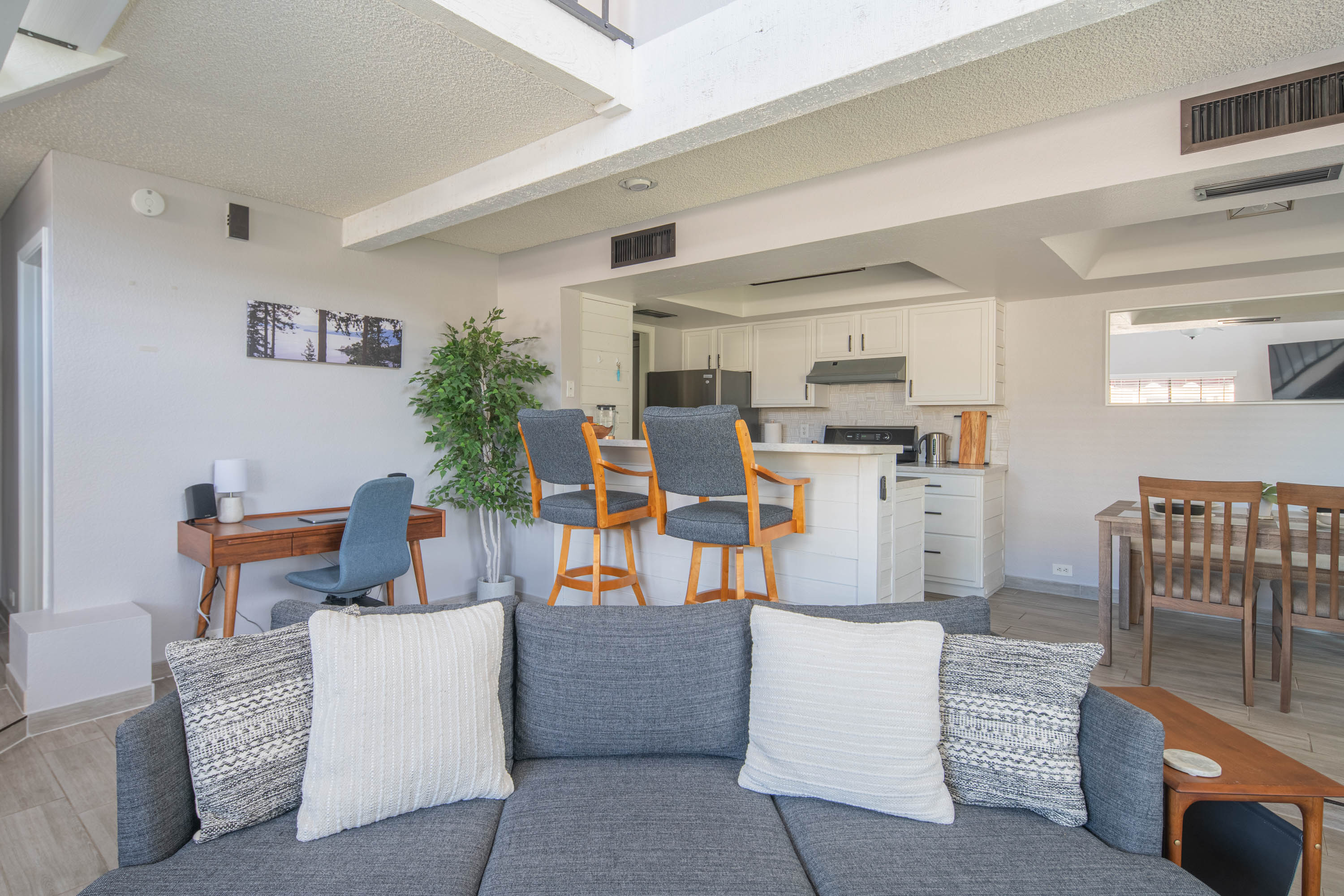 Our living room has a Crate and Barrel desk and comfortable furnishings from Scandinavian Design in Scottsdale. It also has a Samsung Smart TV, surround-sound speakers for entertainment, and an air purifier.