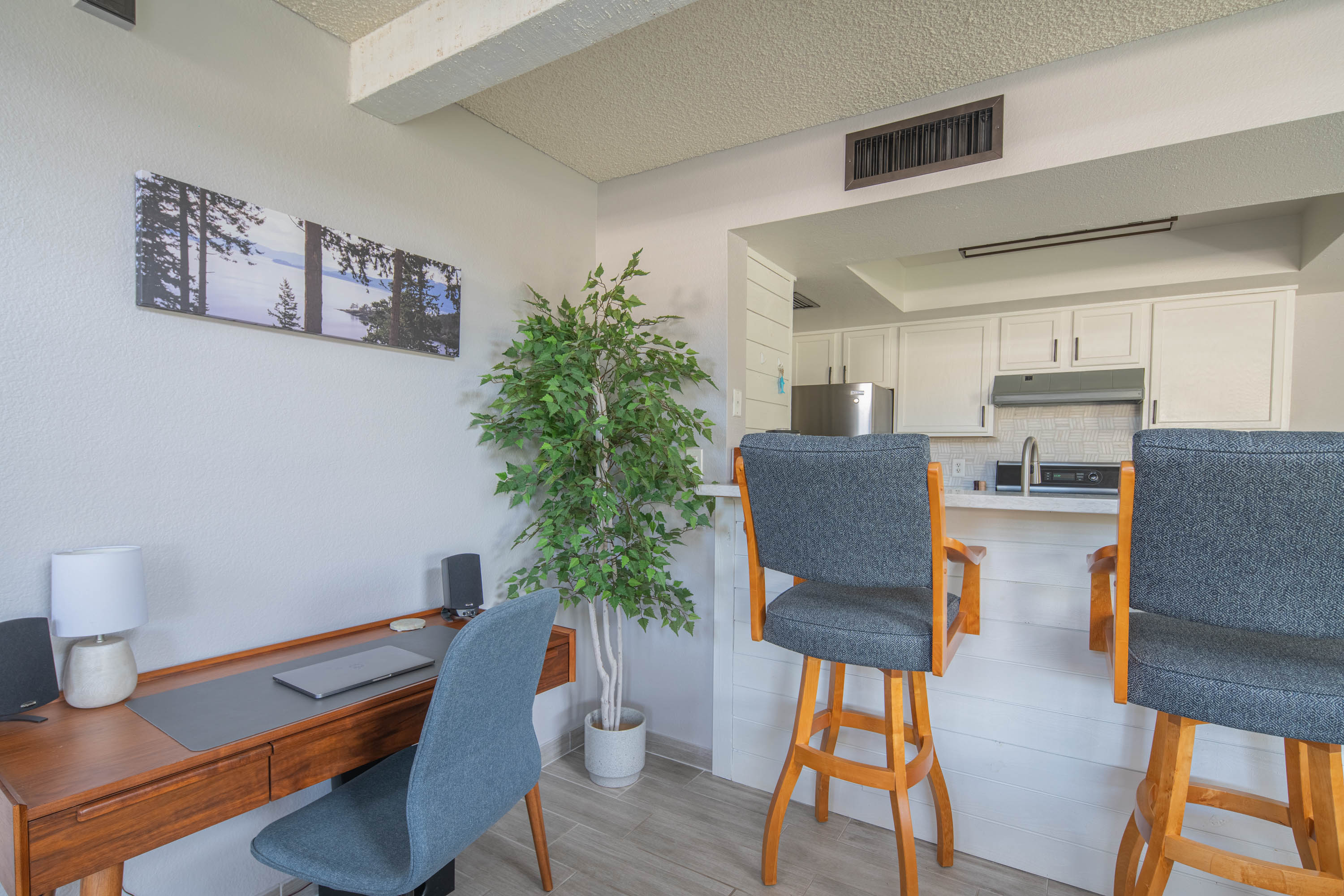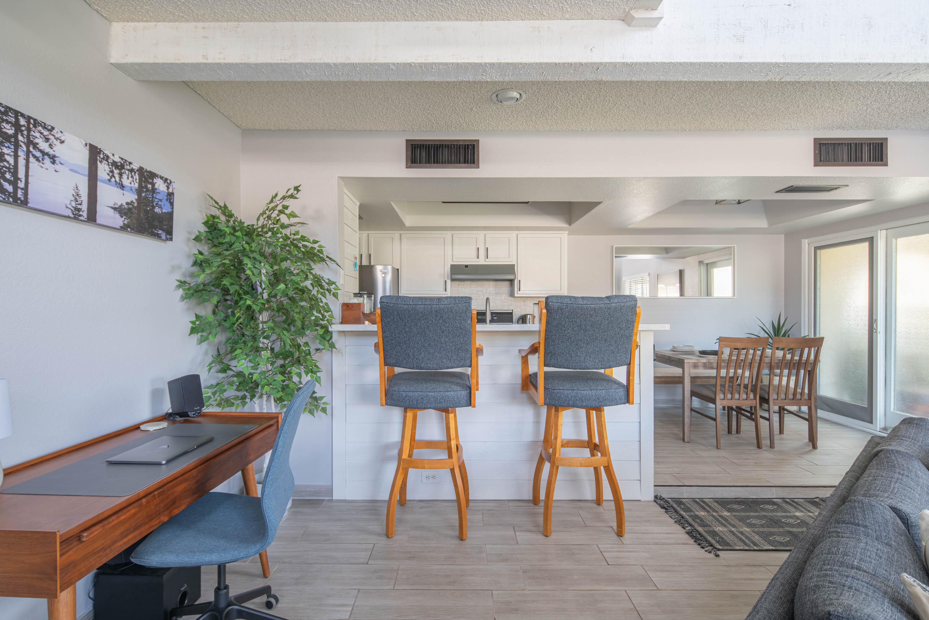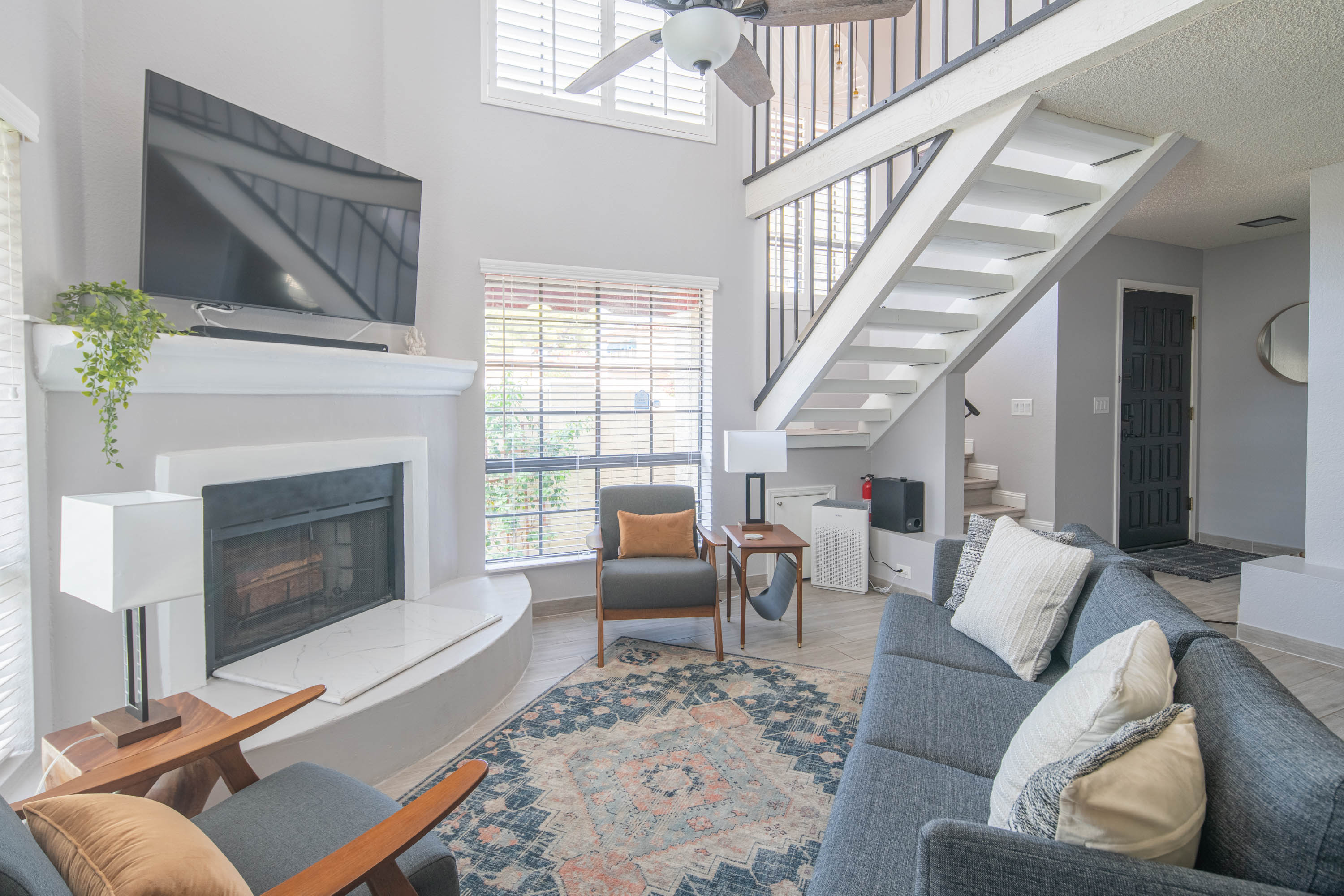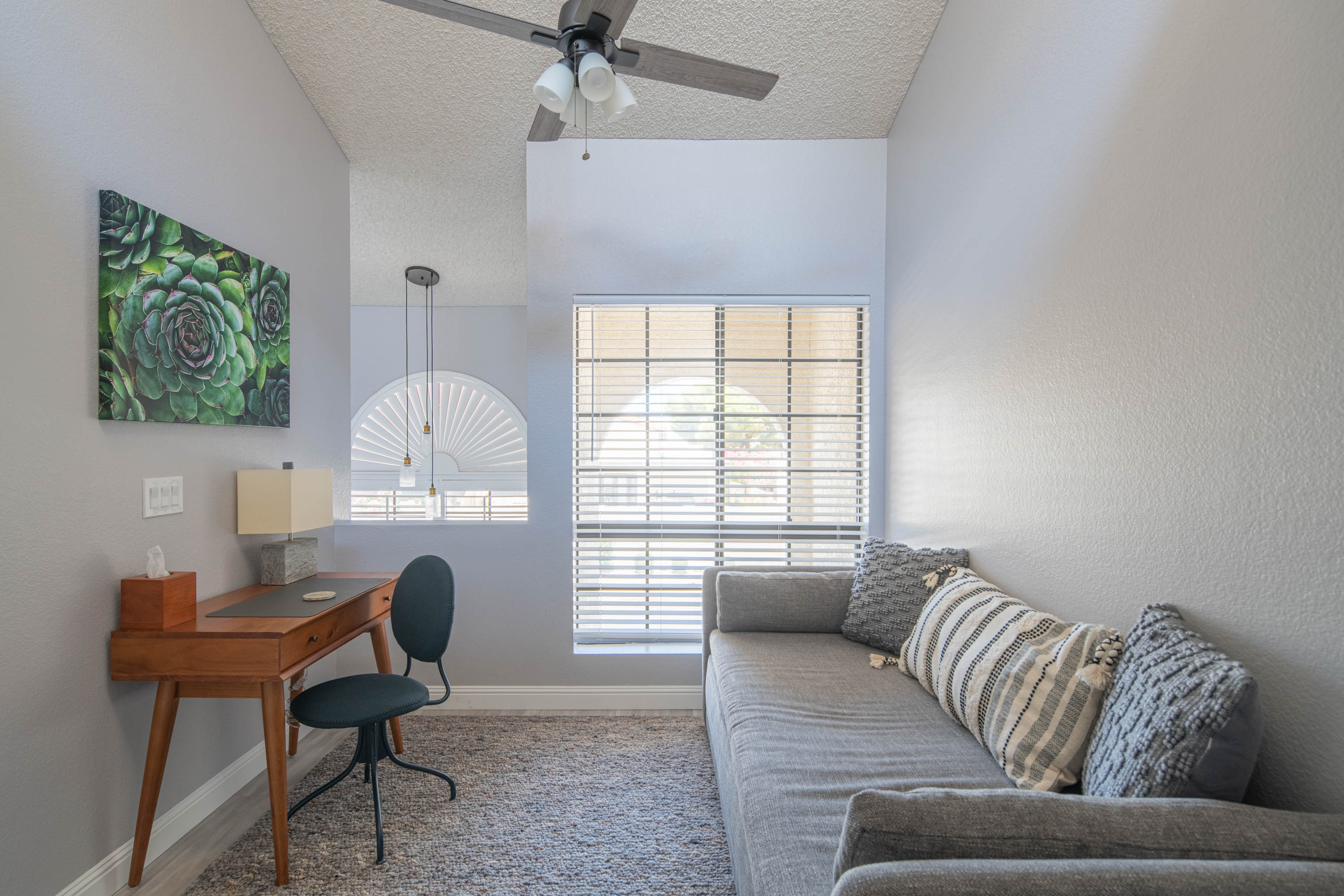 Our living room has a Crate and Barrel desk and comfortable furnishings from Scandinavian Design in Scottsdale. It also has a Samsung Smart TV, surround-sound speakers for entertainment, and an air purifier.