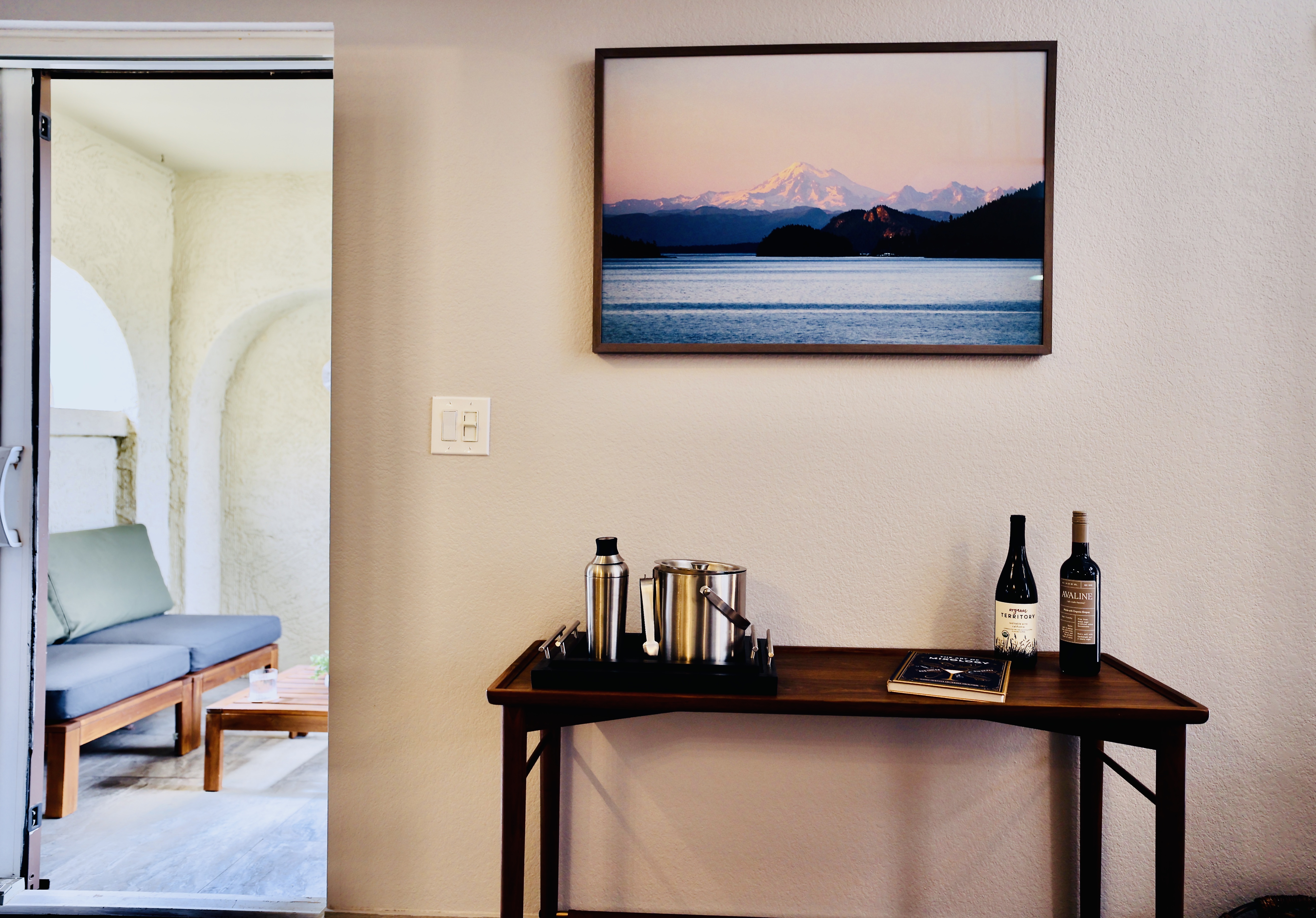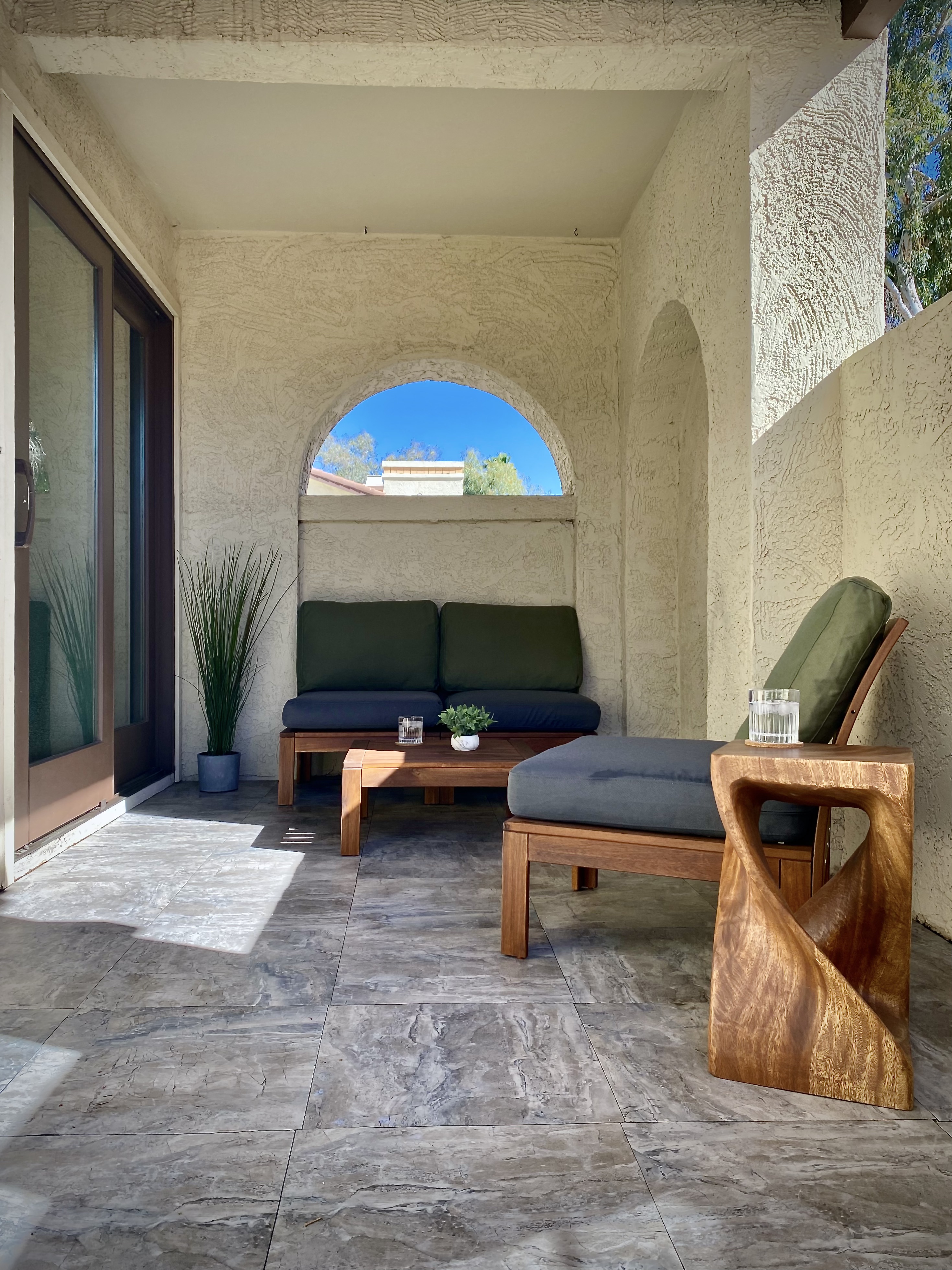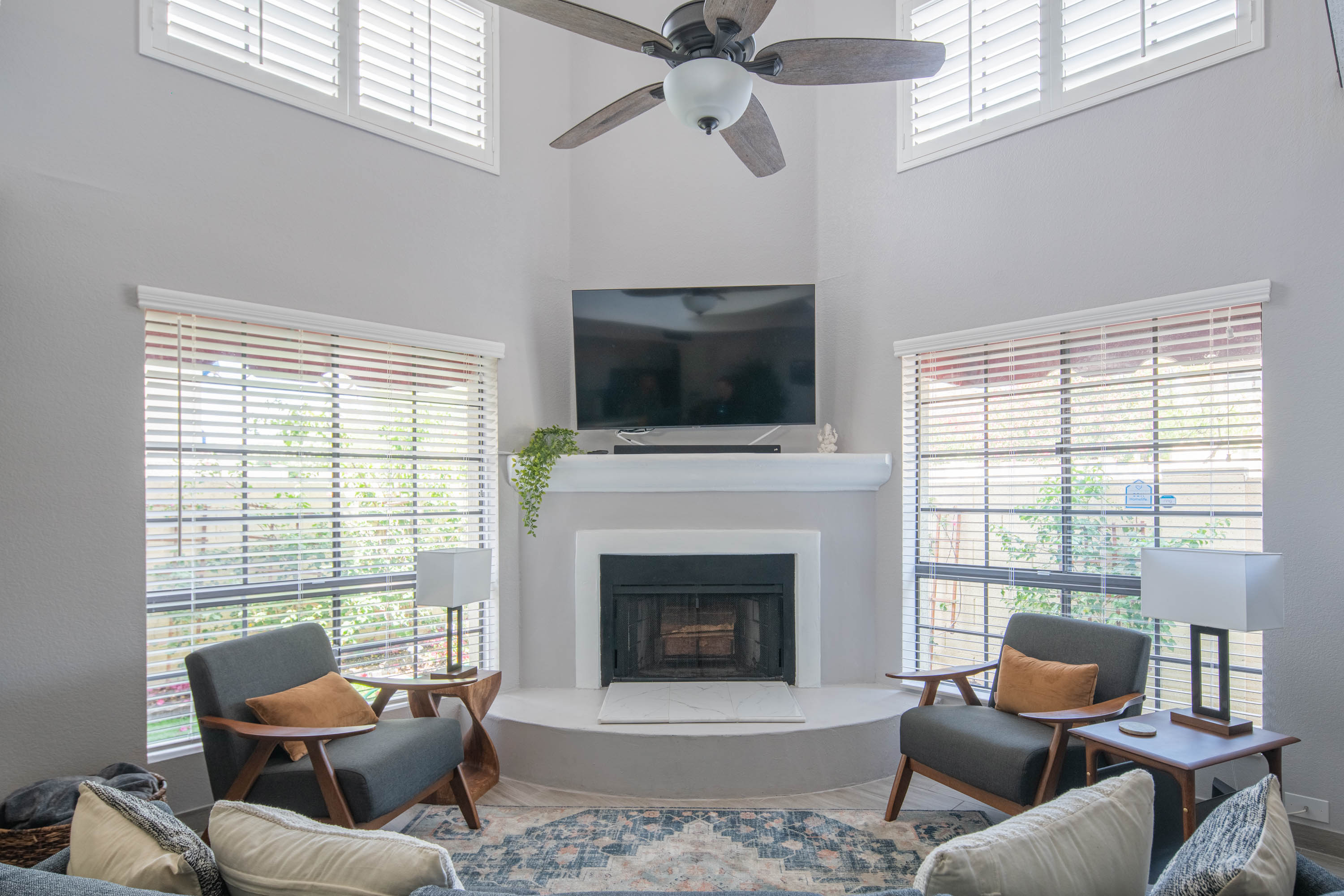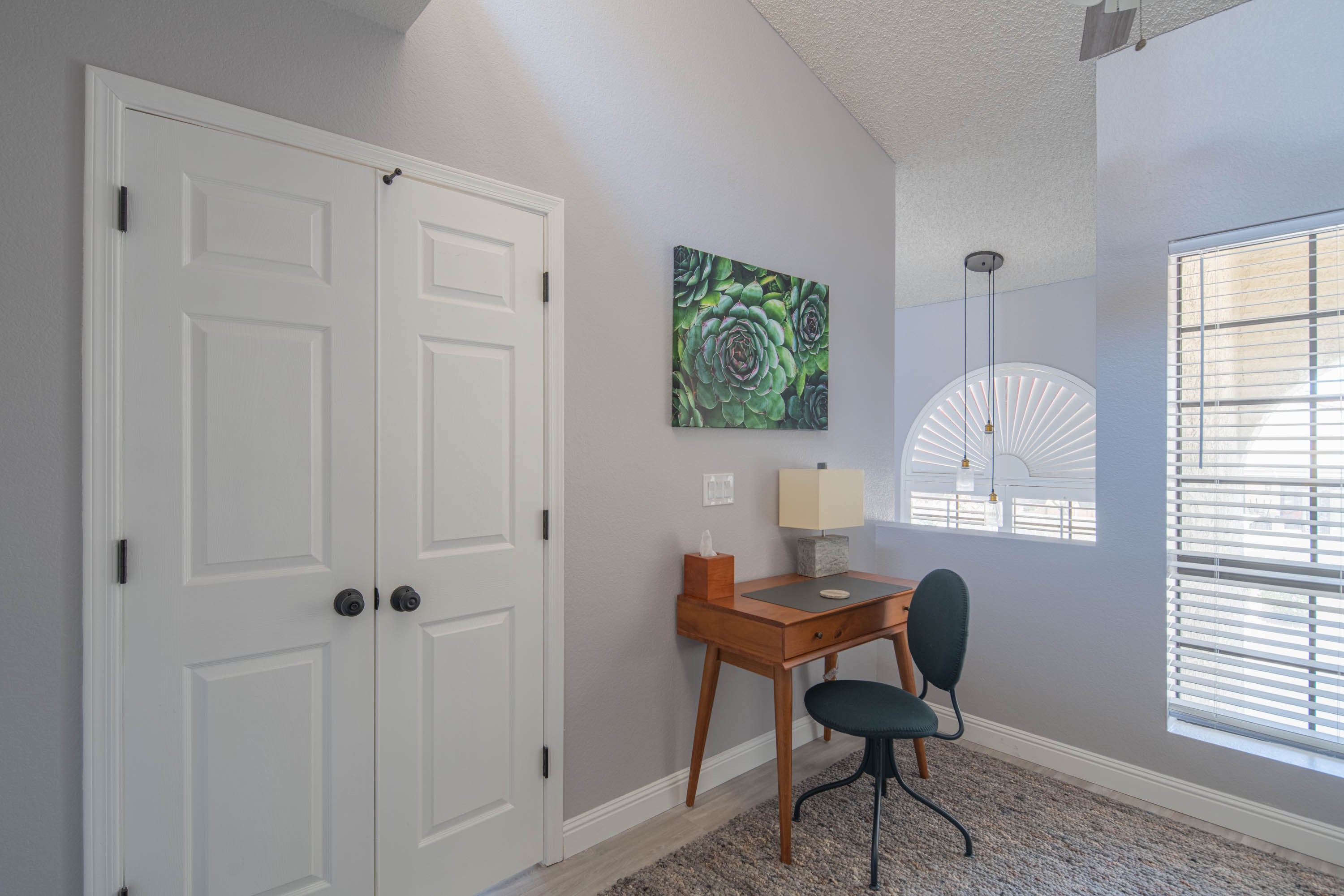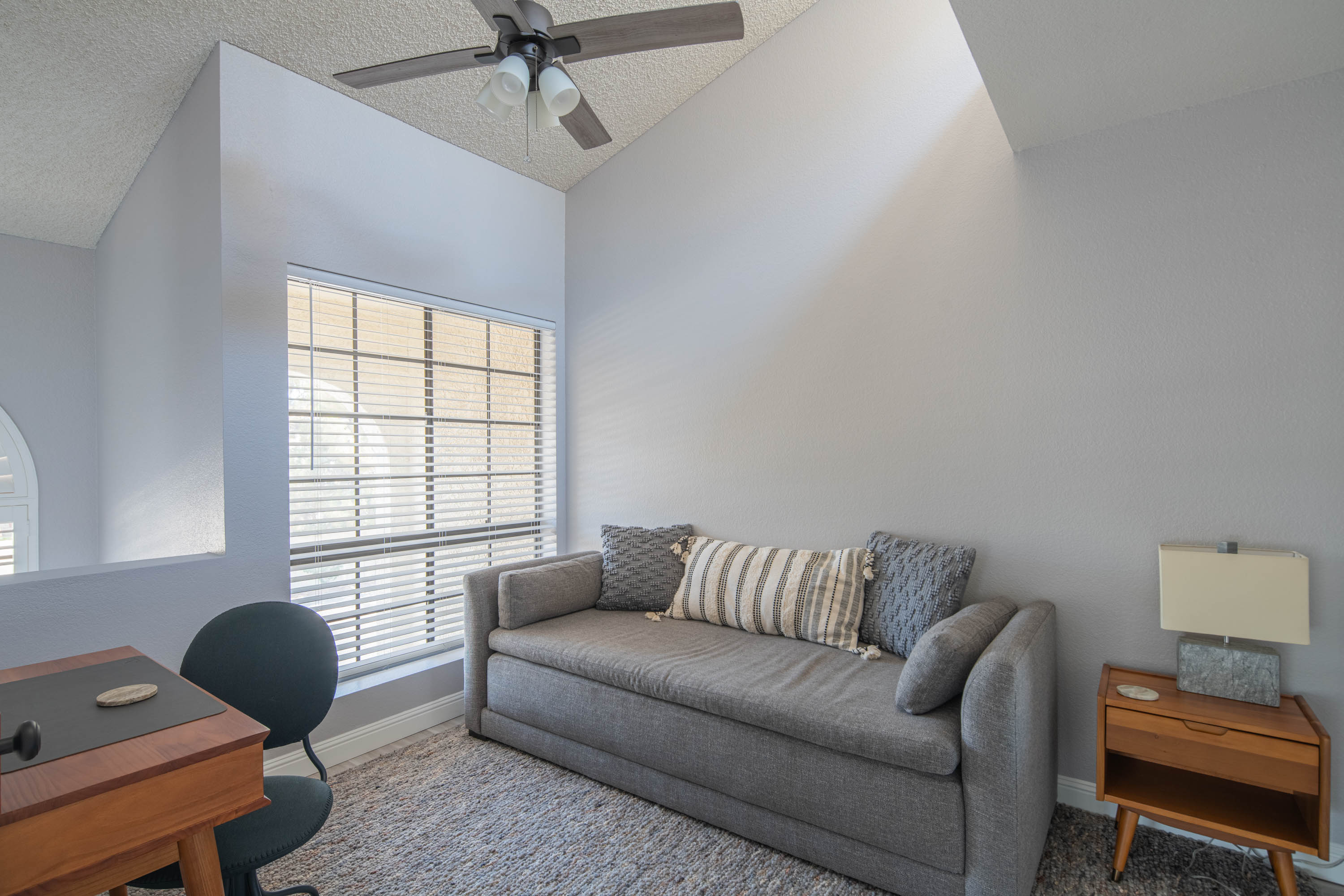 Our living room has a Crate and Barrel desk and comfortable furnishings from Scandinavian Design in Scottsdale. It also has a Samsung Smart TV, surround-sound speakers for entertainment, and an air purifier.