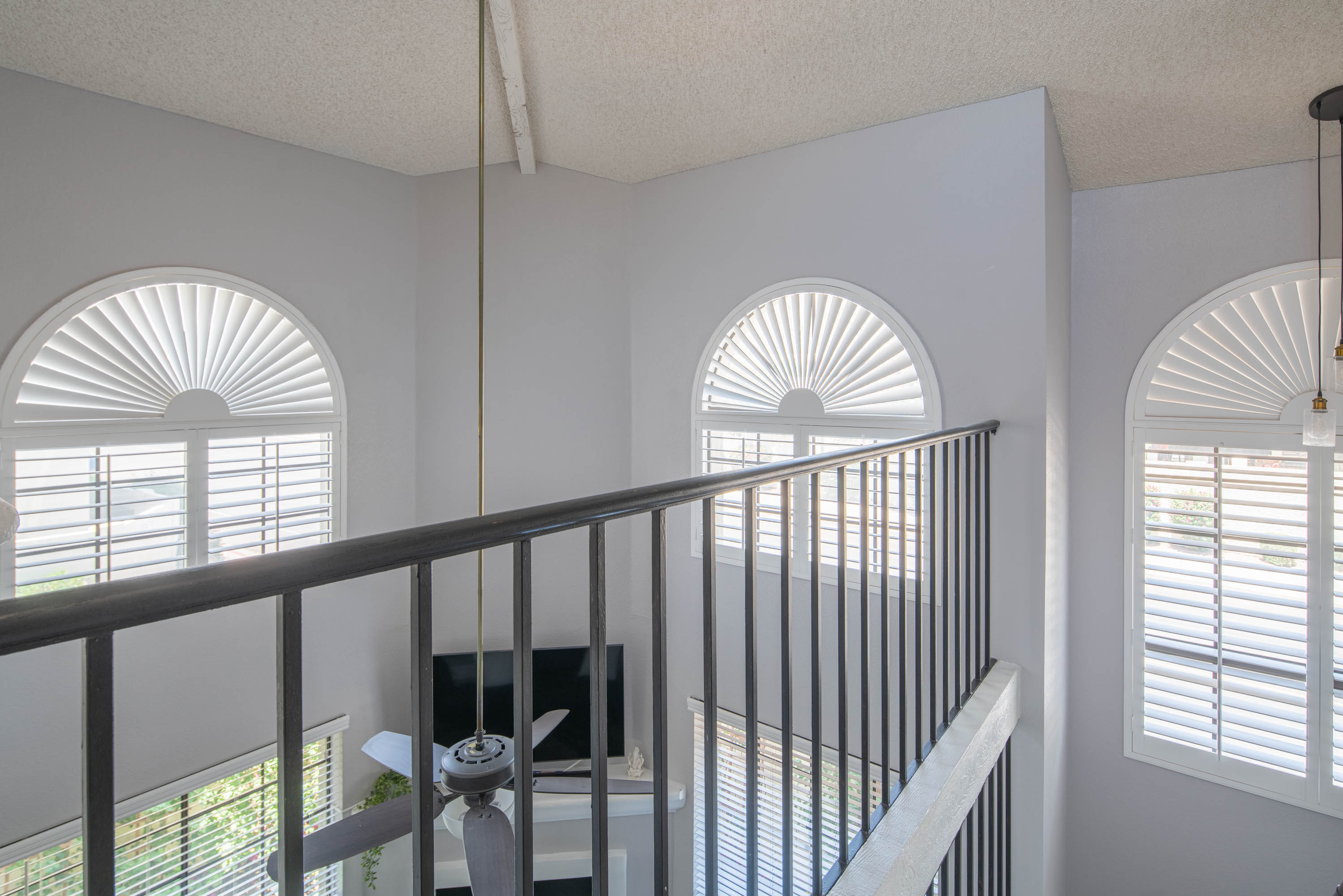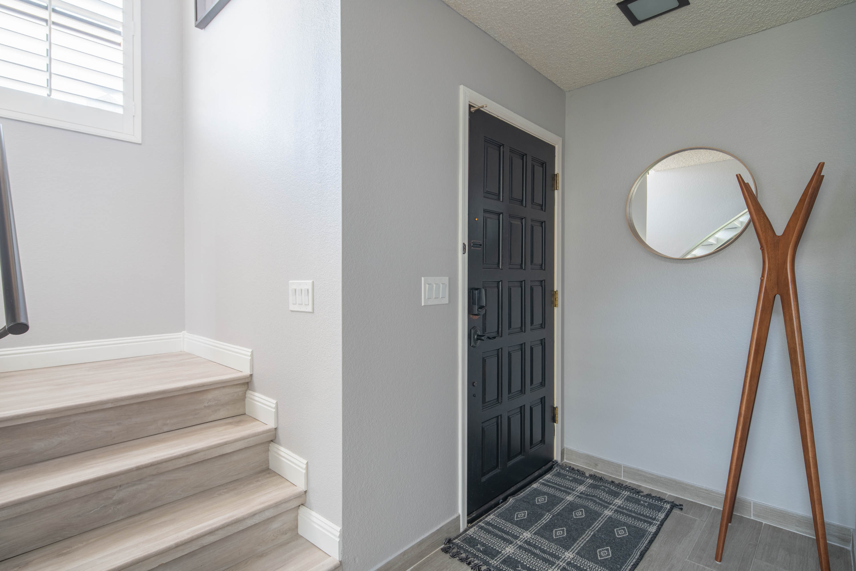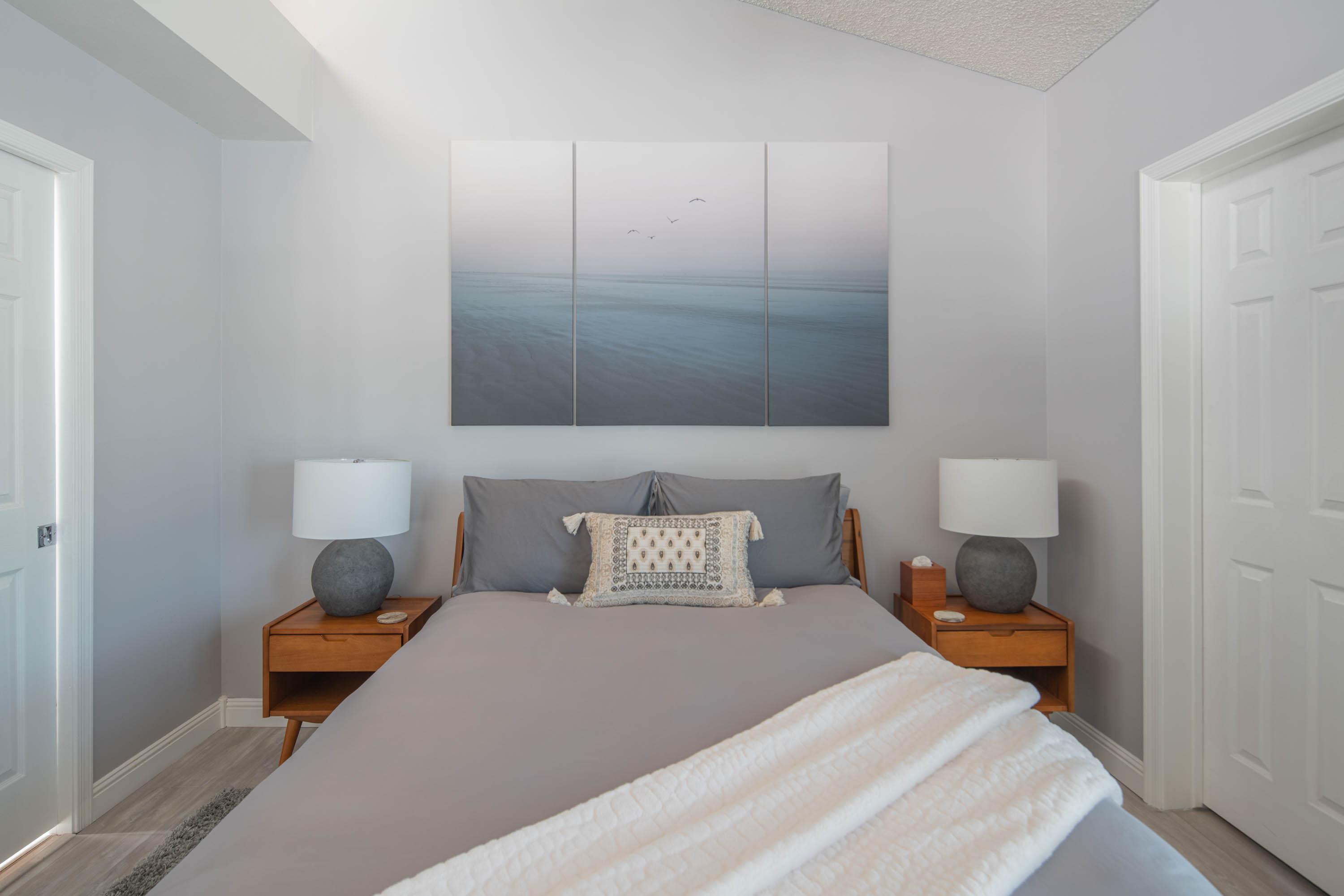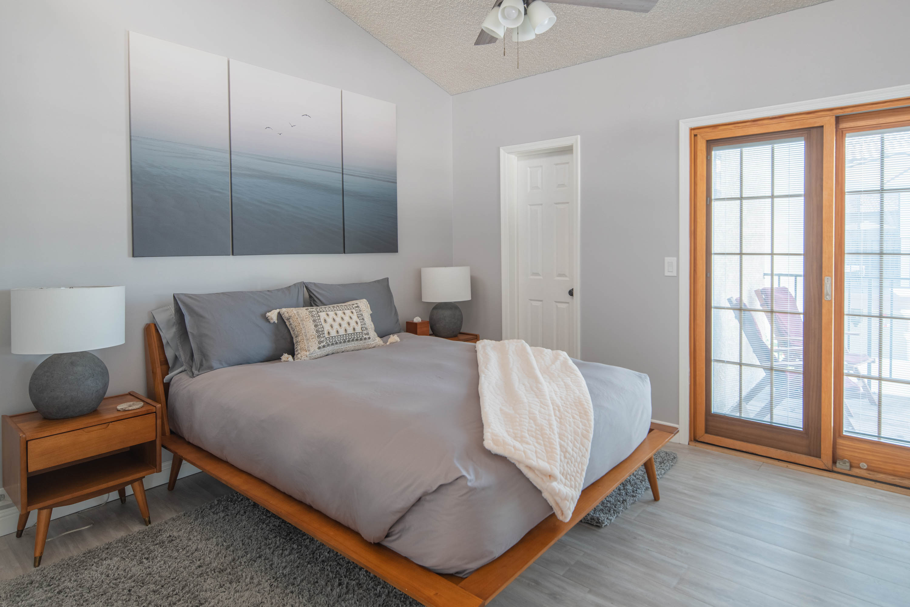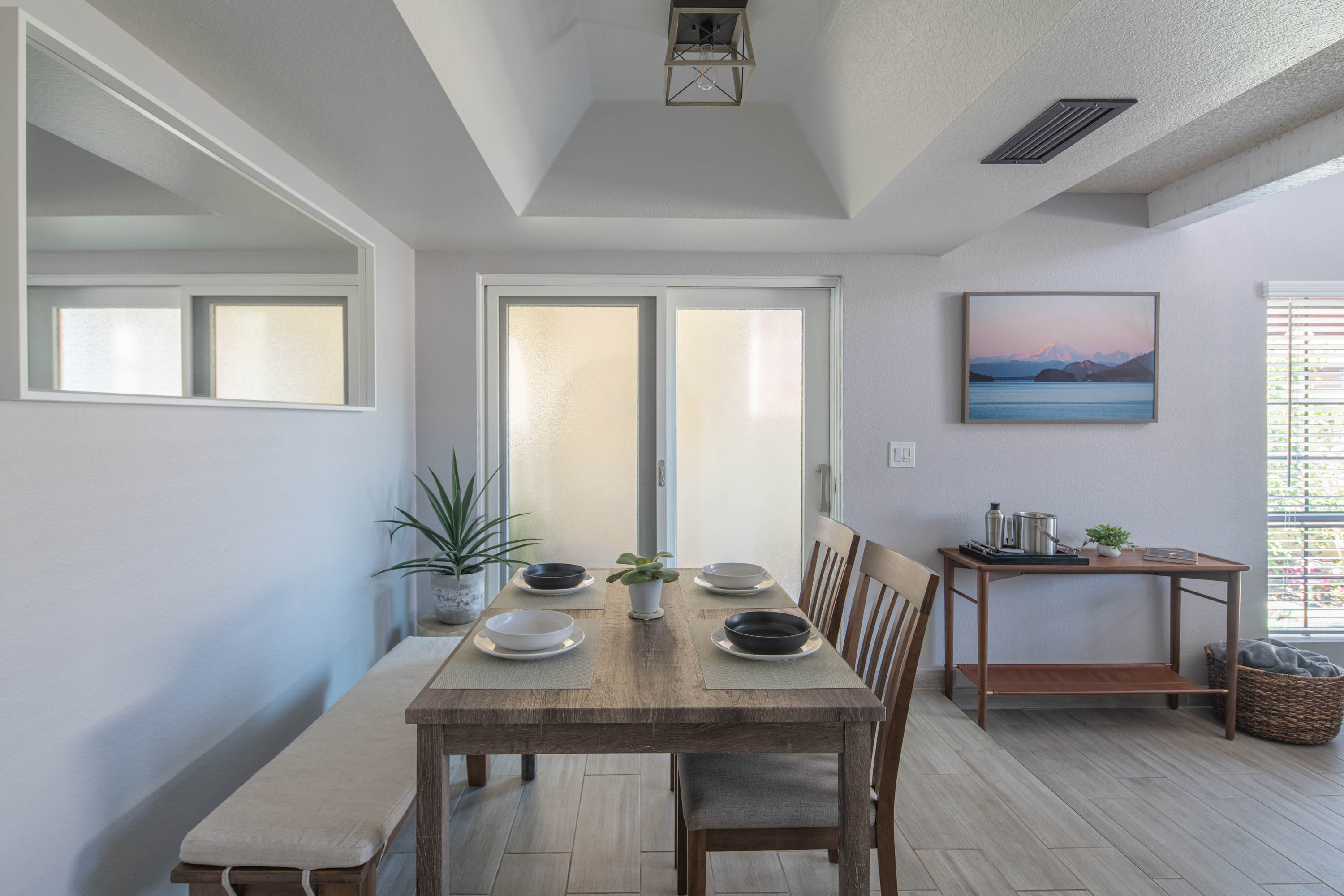 Our living room has a Crate and Barrel desk and comfortable furnishings from Scandinavian Design in Scottsdale. It also has a Samsung Smart TV, surround-sound speakers for entertainment, and an air purifier.