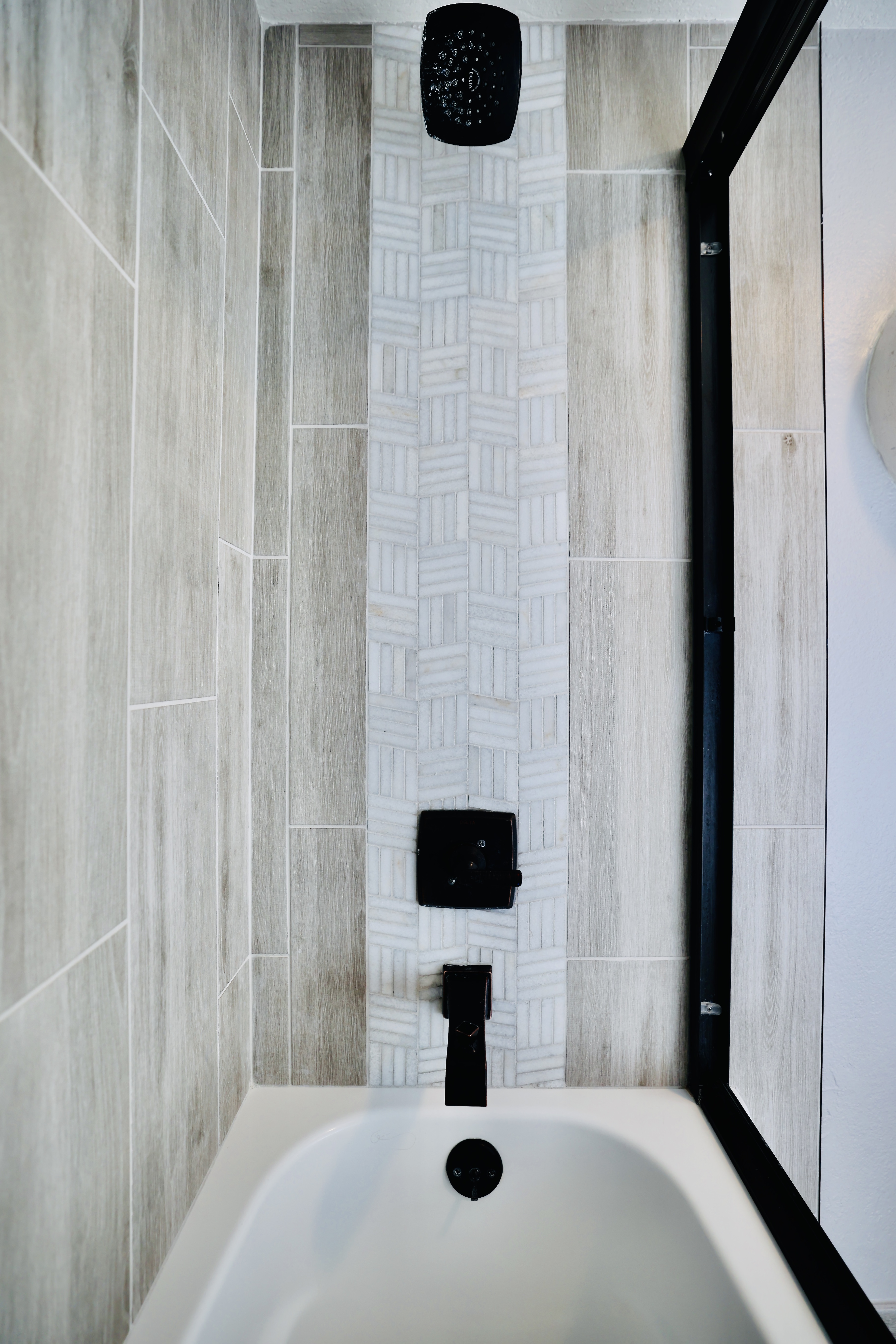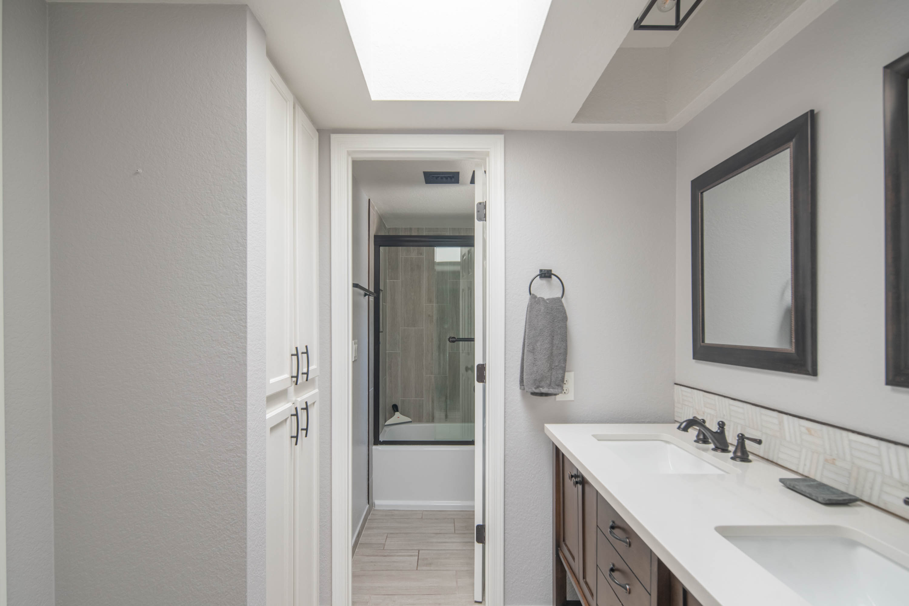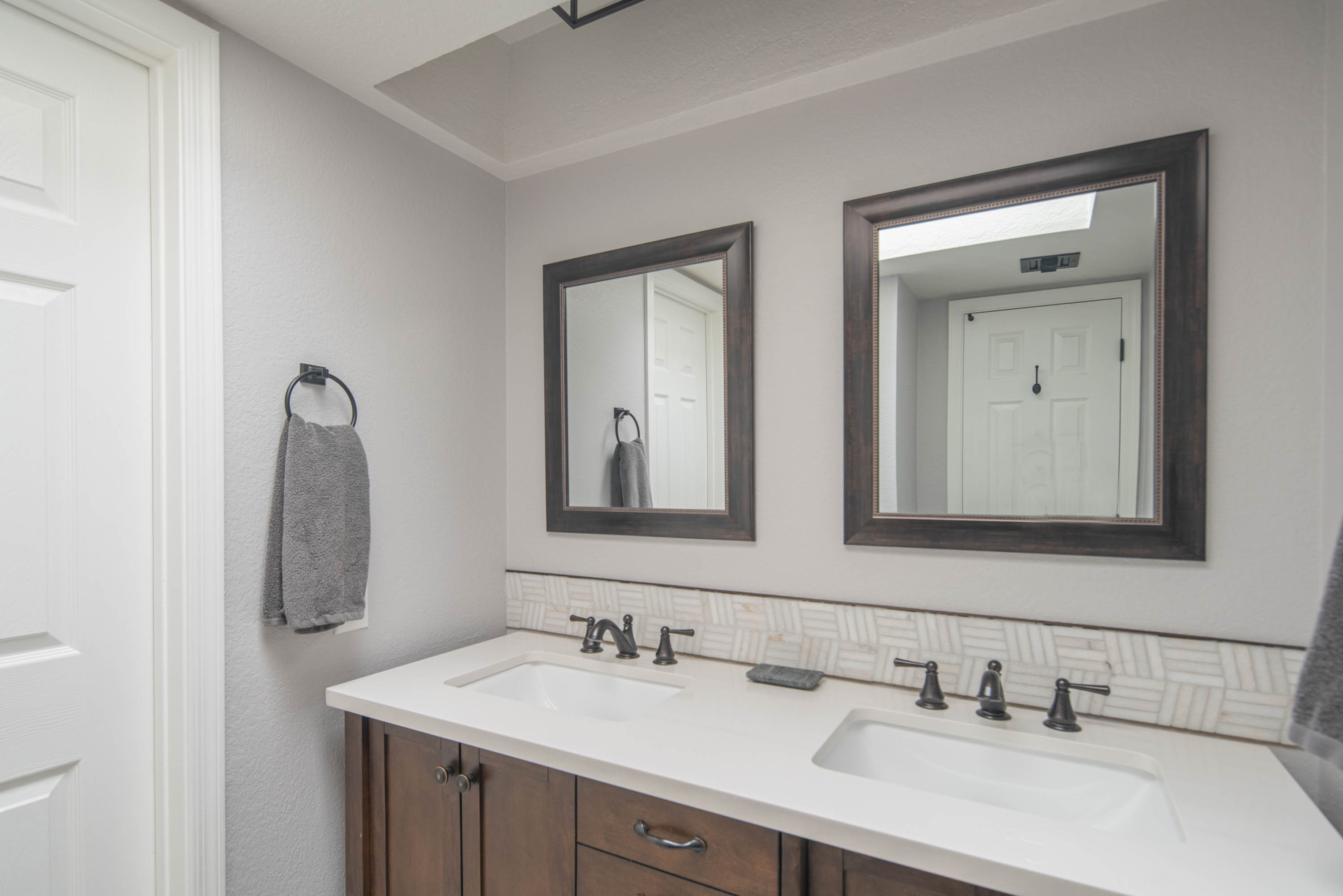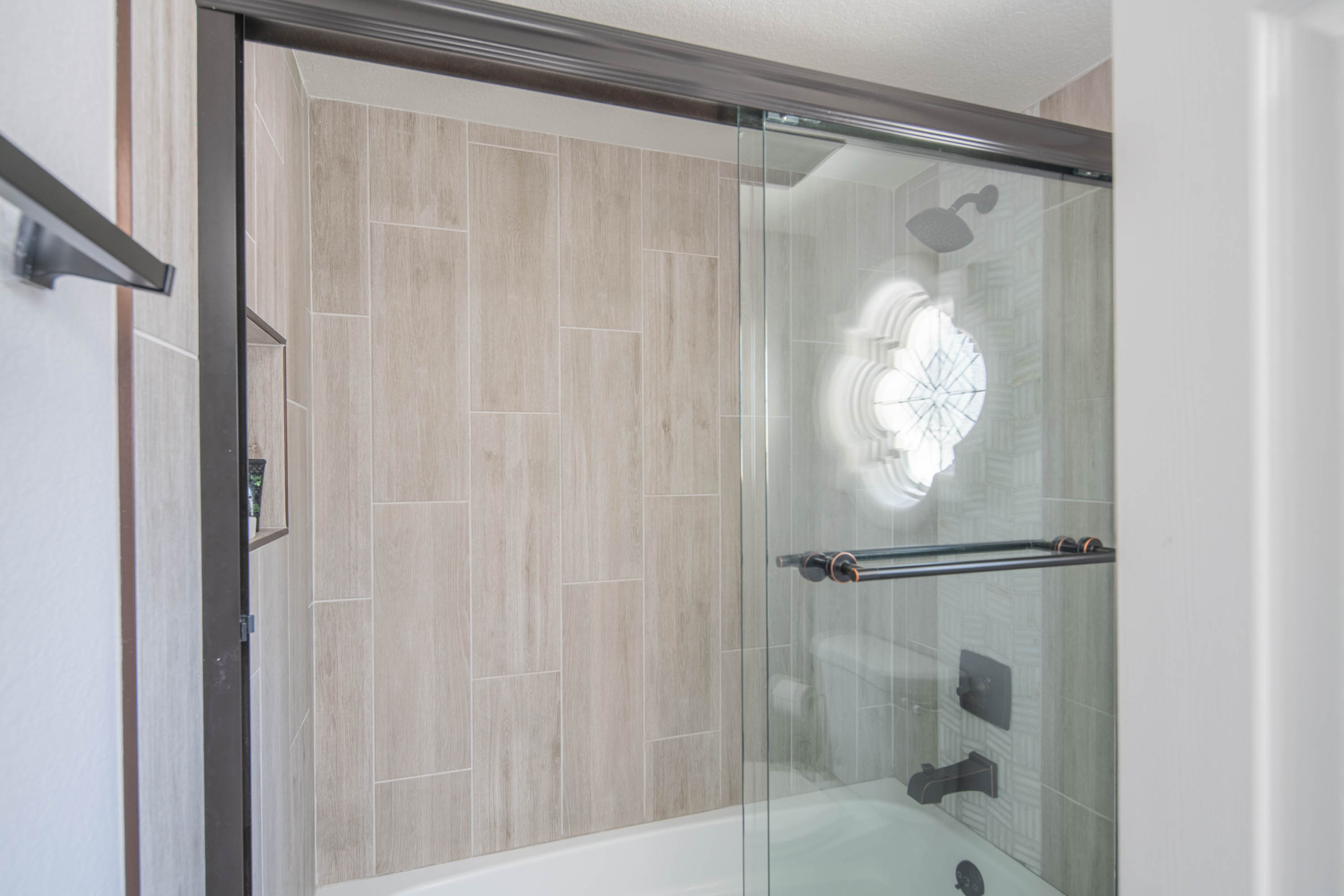 The custom-tiled bath shower/bathtub combo includes a double vanity. The powder room on the first floor has tile and all new updates.