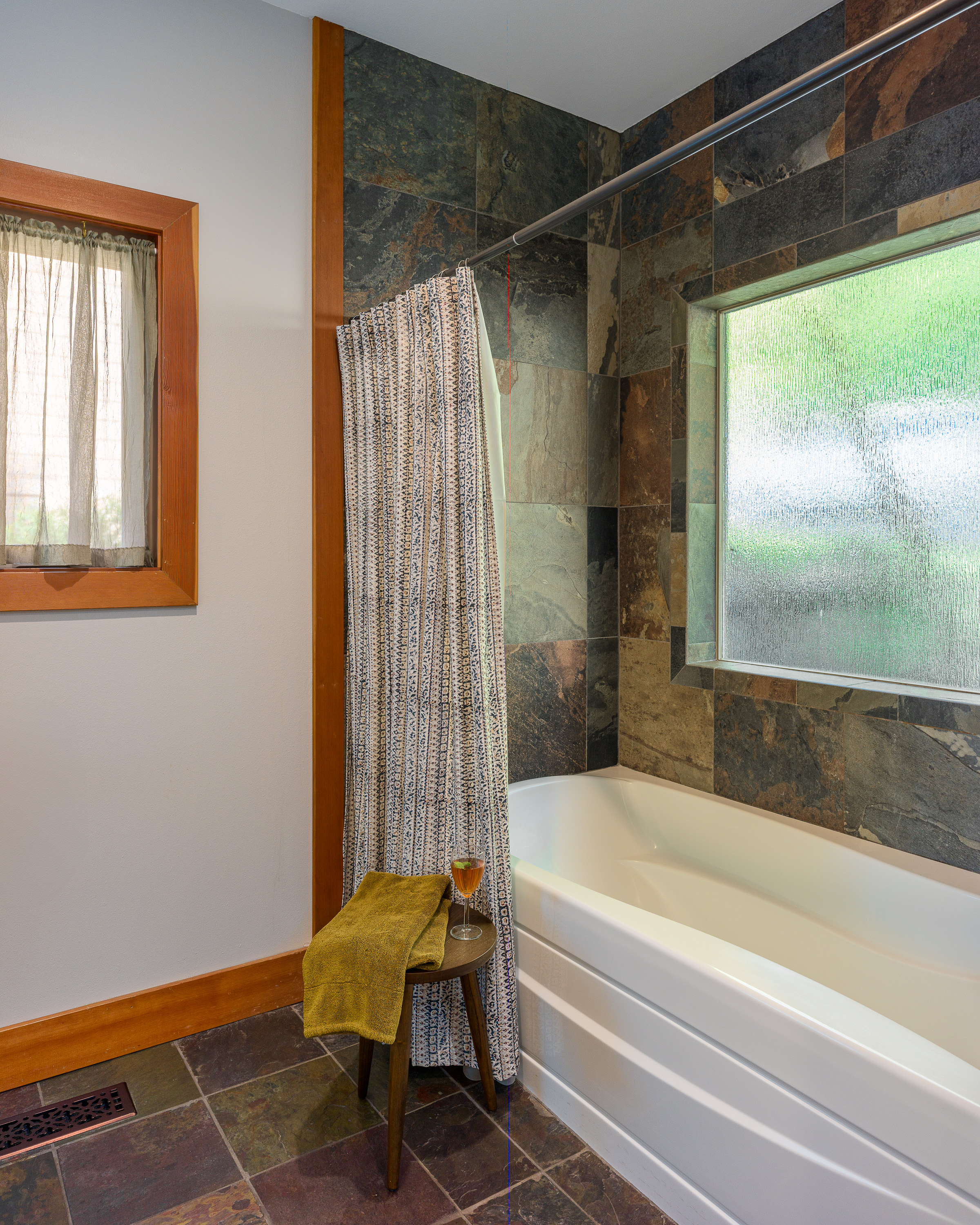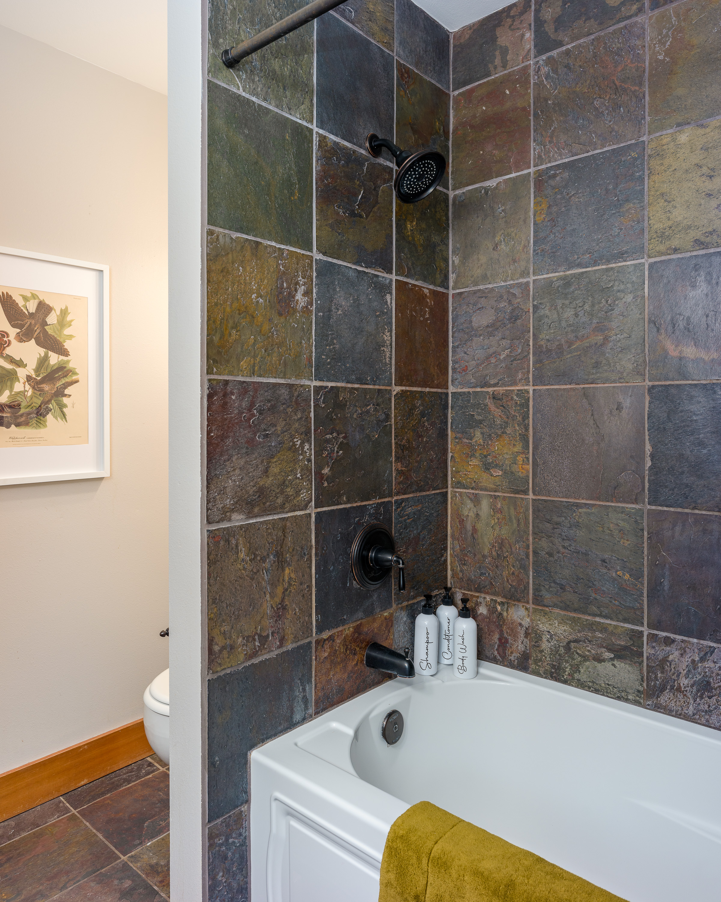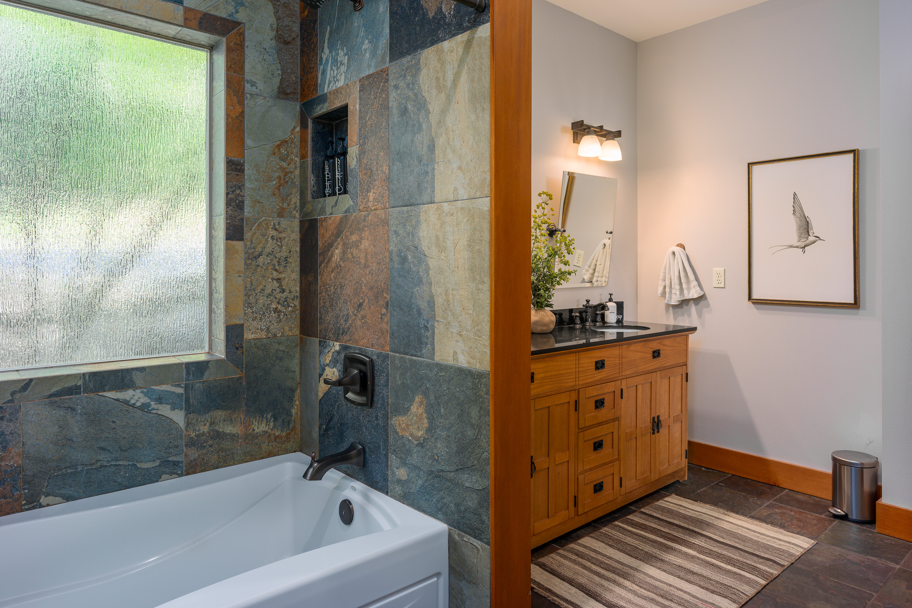 Head downstairs to discover two cozy guest bedrooms and an additional full bathroom. One guest room features a queen bed, while the other has two twin trundle beds, making it great for kids or friends. The shared bathroom boasts custom tiling and radiant floor heat, along with a relaxing shower/tub combo for those much-needed moments of tranquility. Plus, with a private entry downstairs, you can access a covered patio with seating and our lovely backyard.