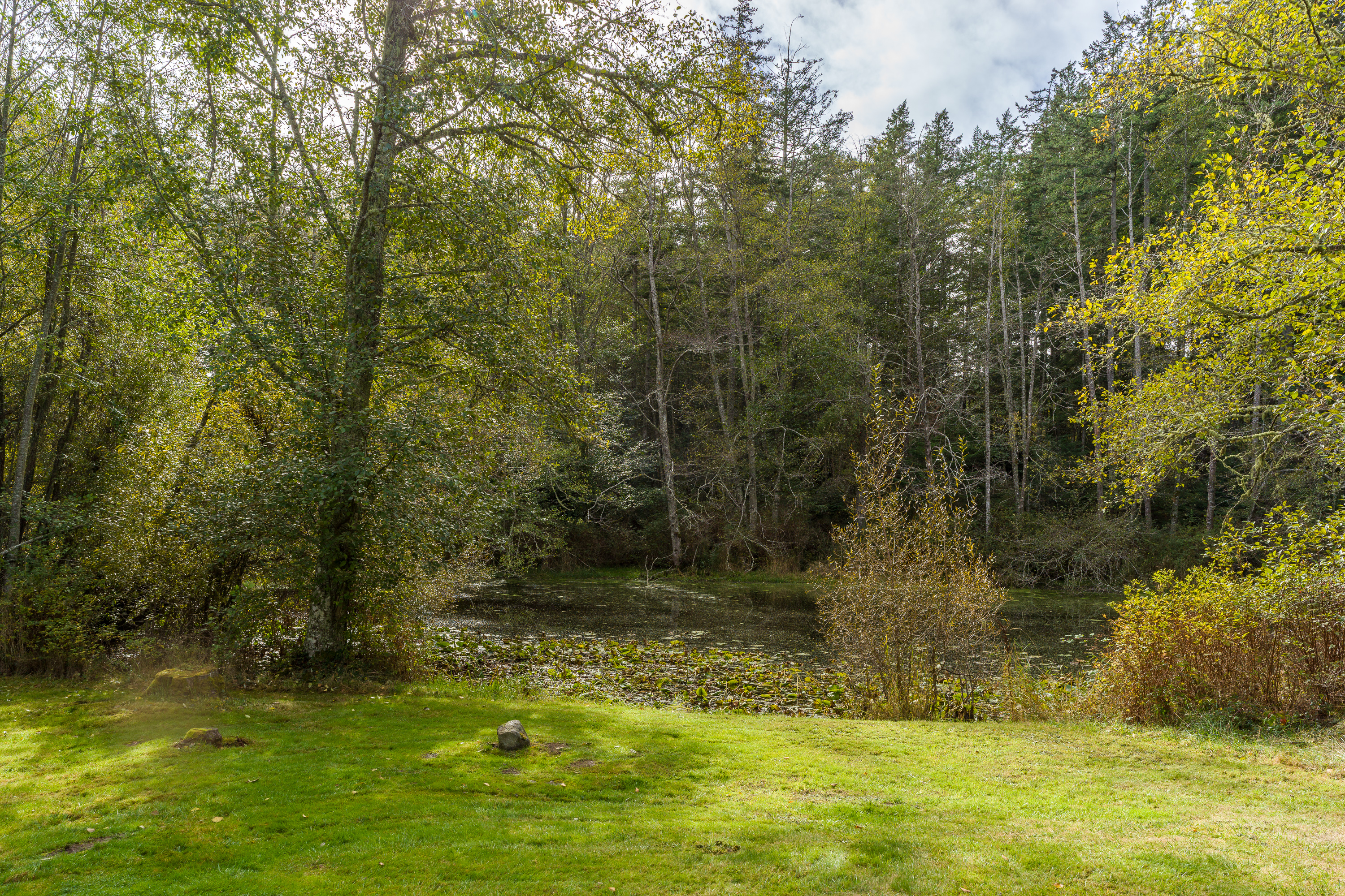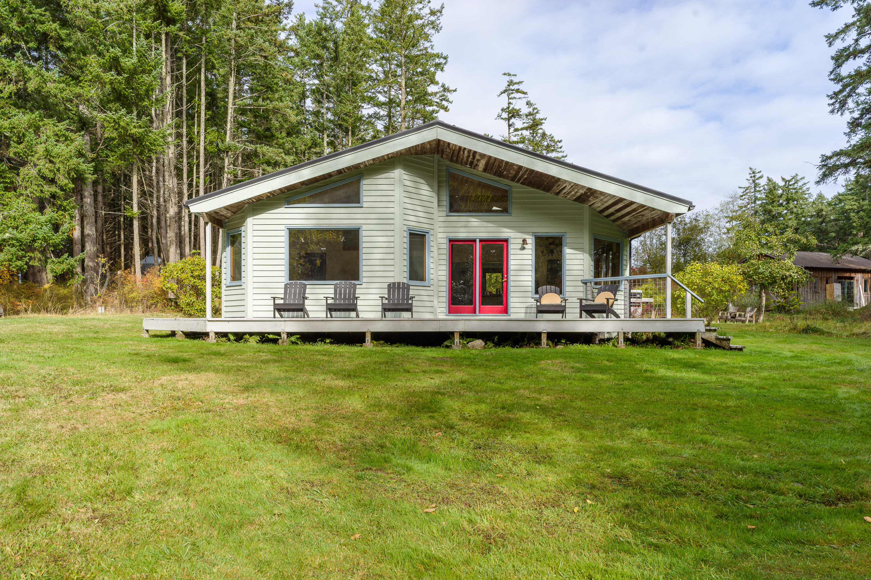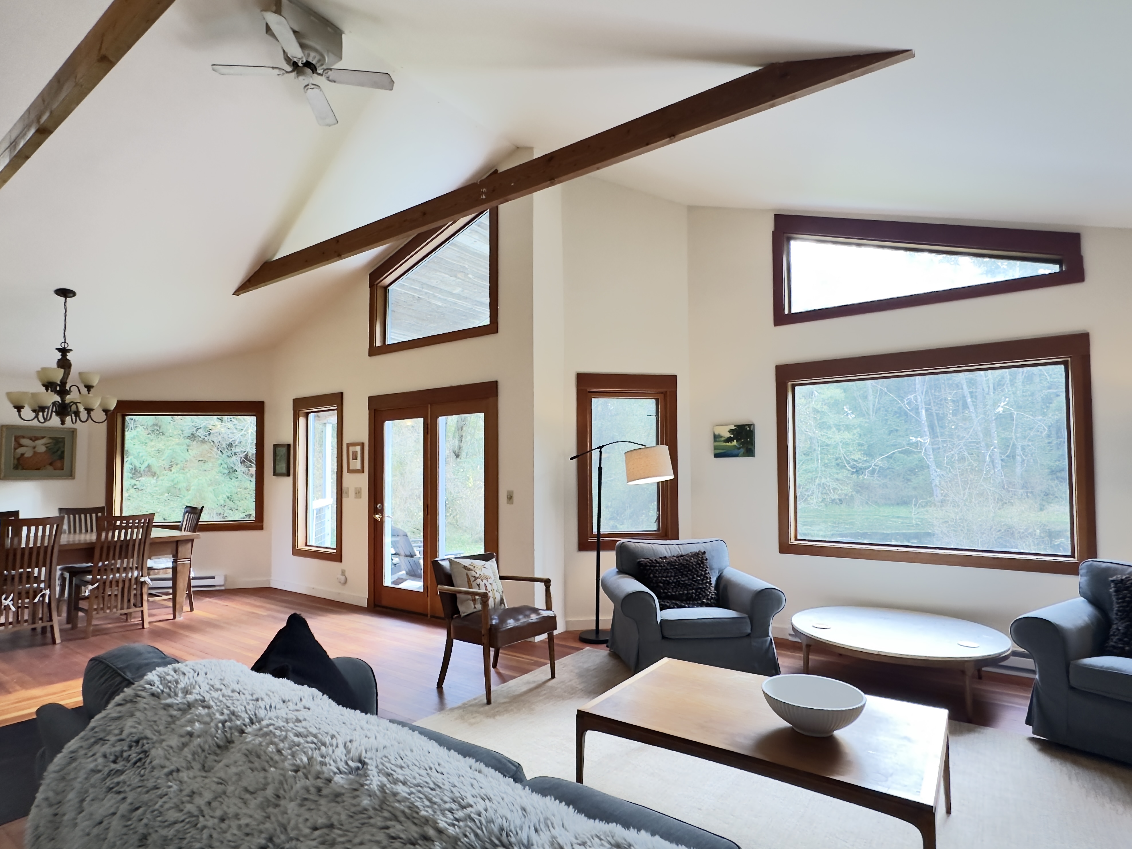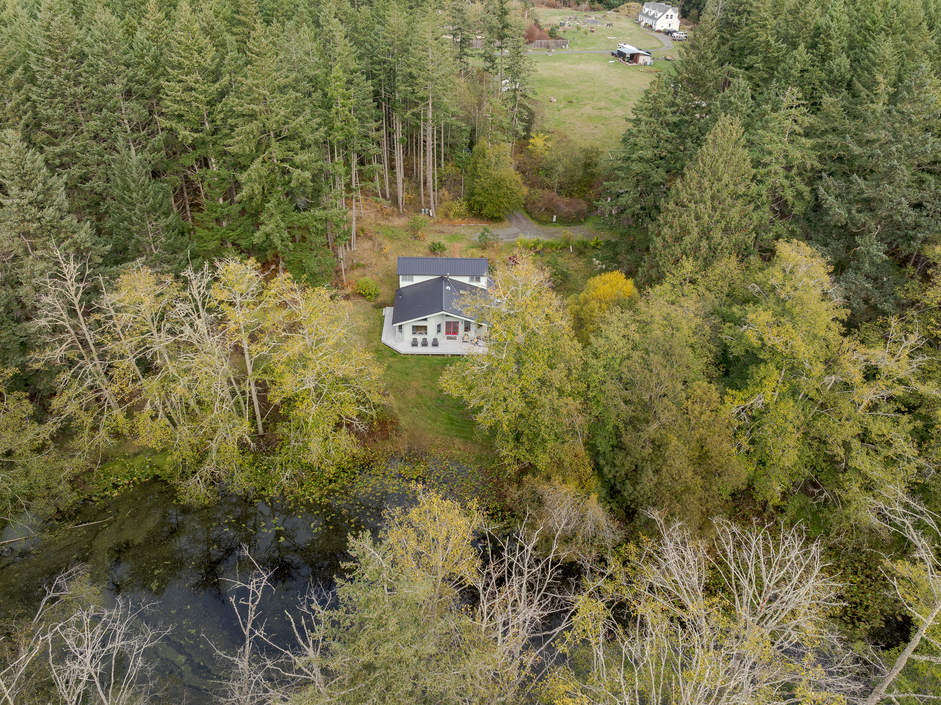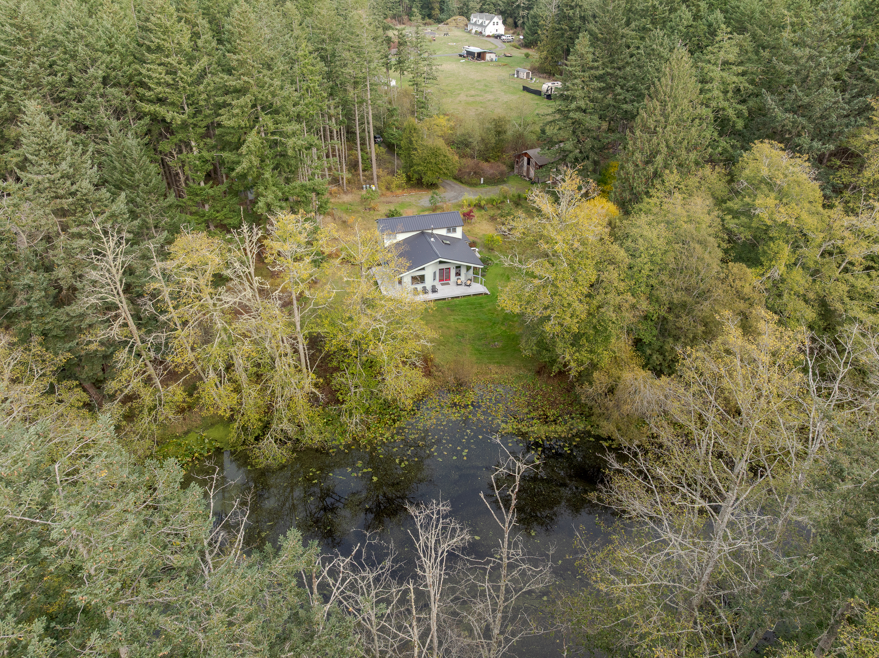 Dragonfly Pond house is a rustic, spacious, light-filled vacation rental home on Orcas Island with high ceilings overlooking a tranquil pond. Clean & comfy. Located in 7 acres of forest, it's peaceful and secluded. Close to town and the ferry. High-speed Internet.