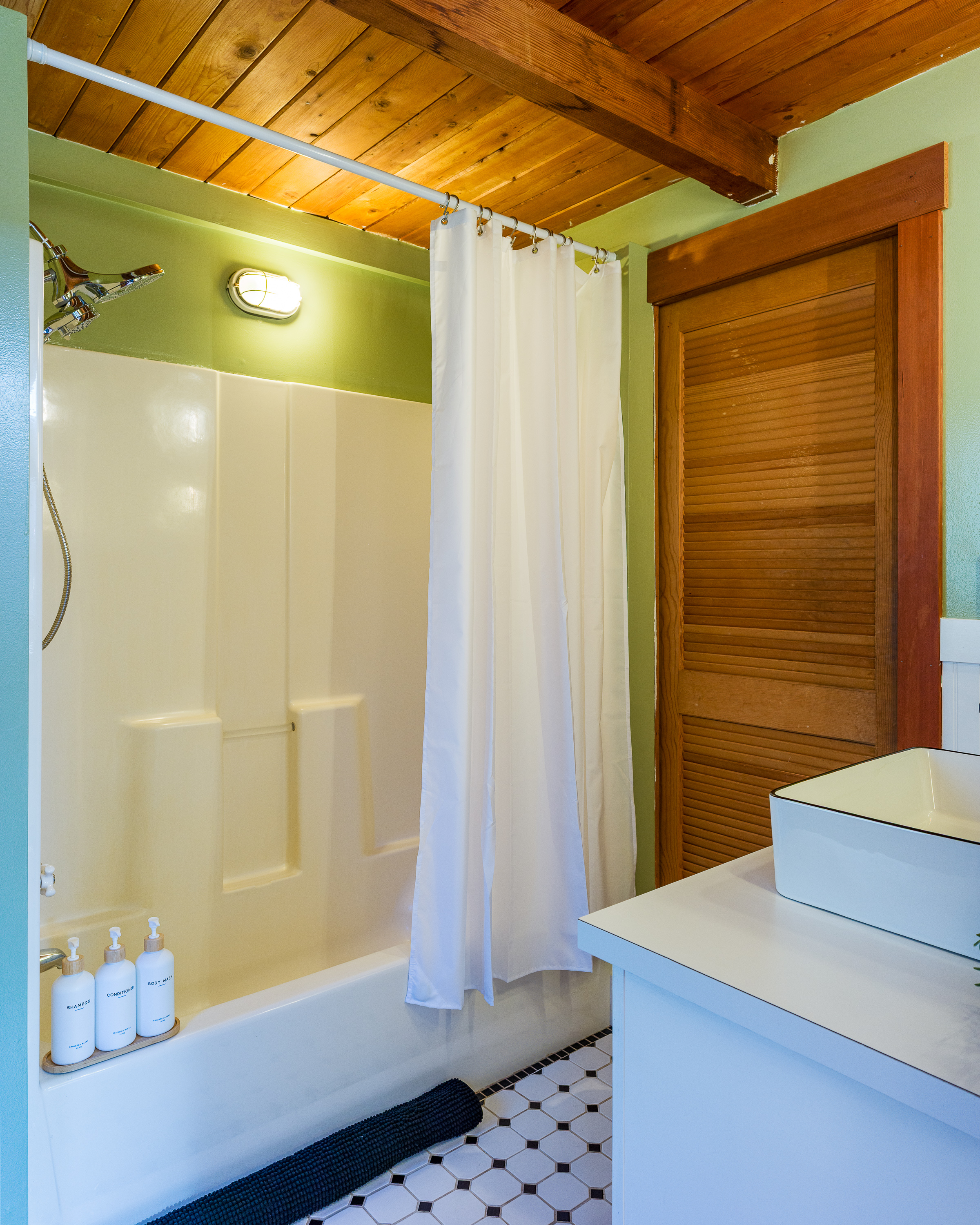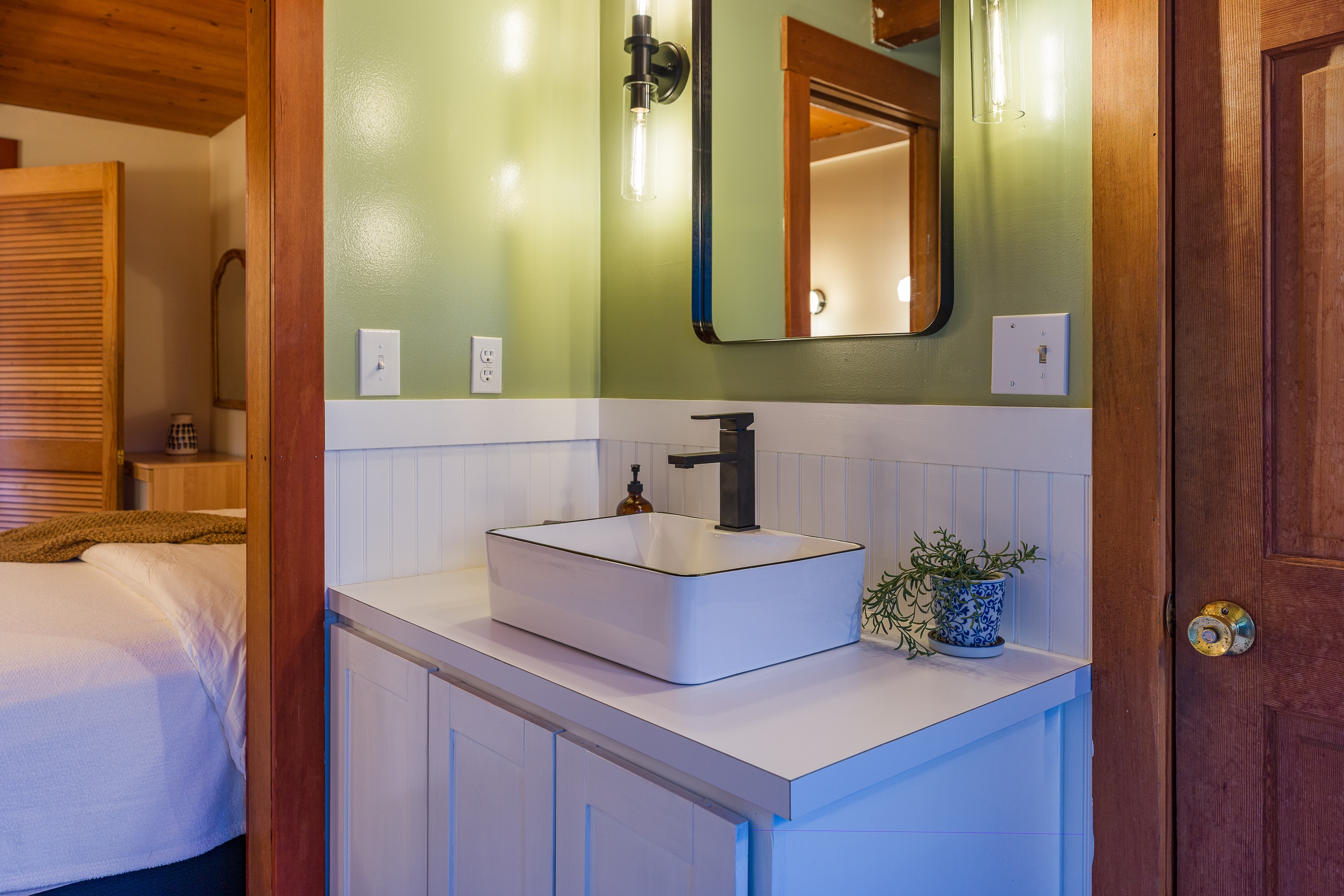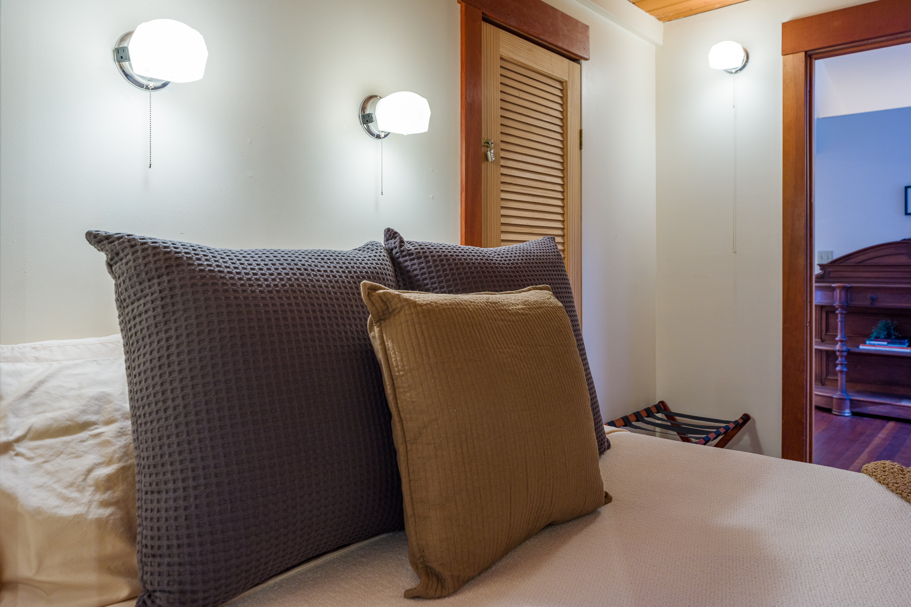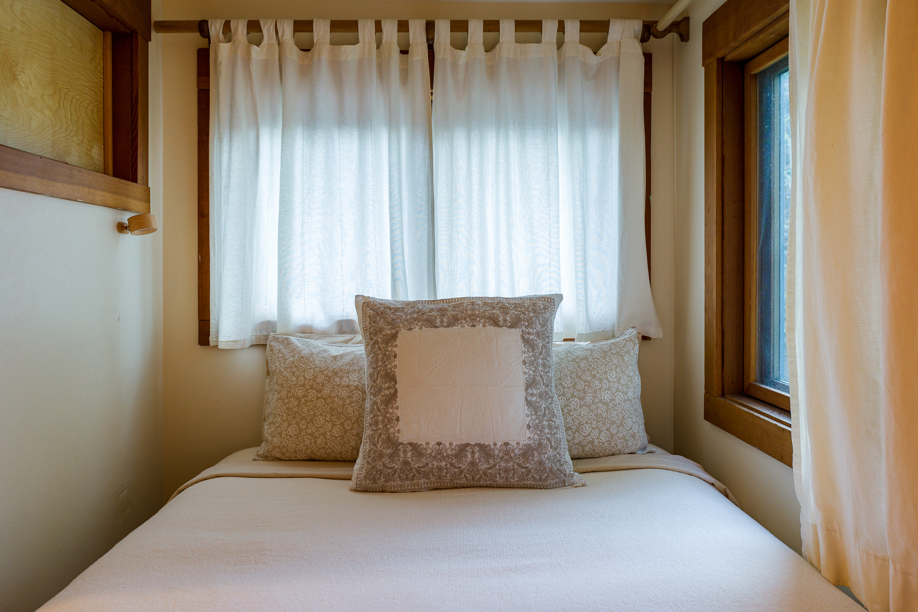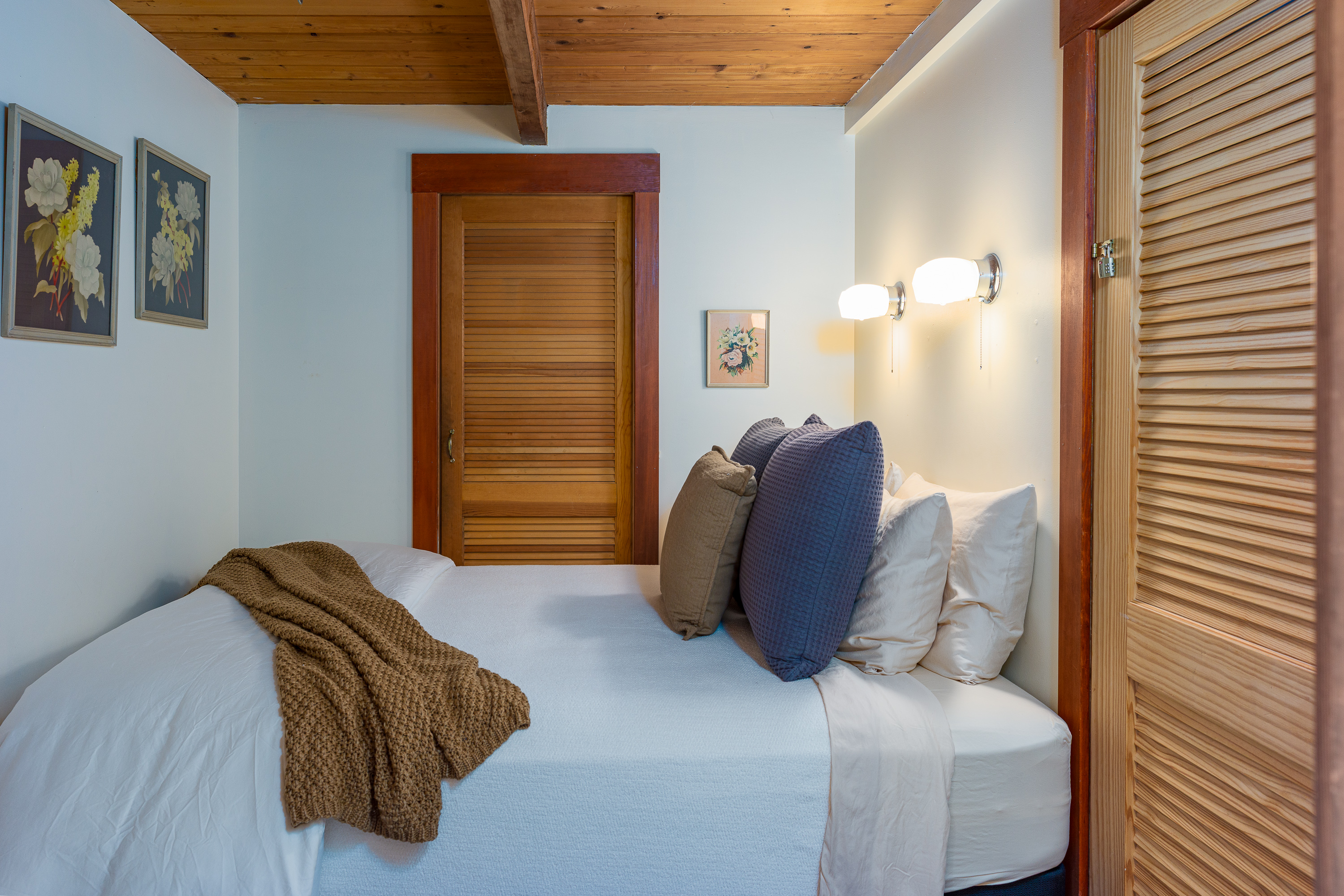 Located just off the dining room, this third bedroom includes a queen bed in a cozy enclosed space. It is partially separated with louver doors, offering comfort and privacy while maintaining the home’s open feel. This is a tiny room with a dresser and luggage rack for unpacking.
