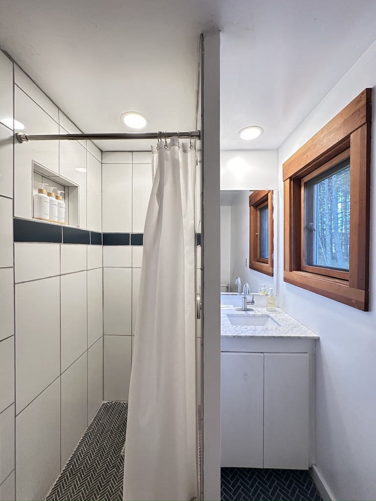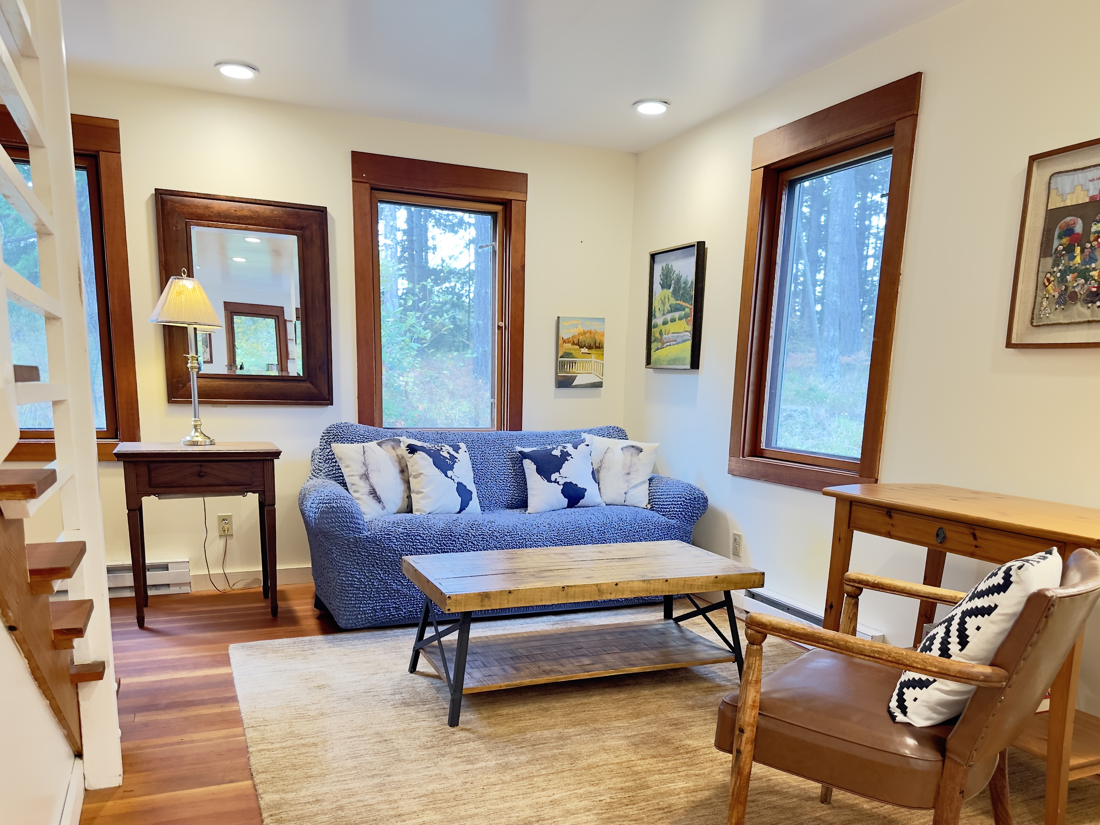 The house is heated with electricity and does not have air conditioning (most houses on Orcas don't.) It stays toasty in the cooler months and gets plenty of sunshine through the big south-facing windows. In the summer, the roof overhang keeps things from heating up too much, and the cool evenings mean you can get a breeze through the house. We have quiet fans in each bedroom and in the common area.
