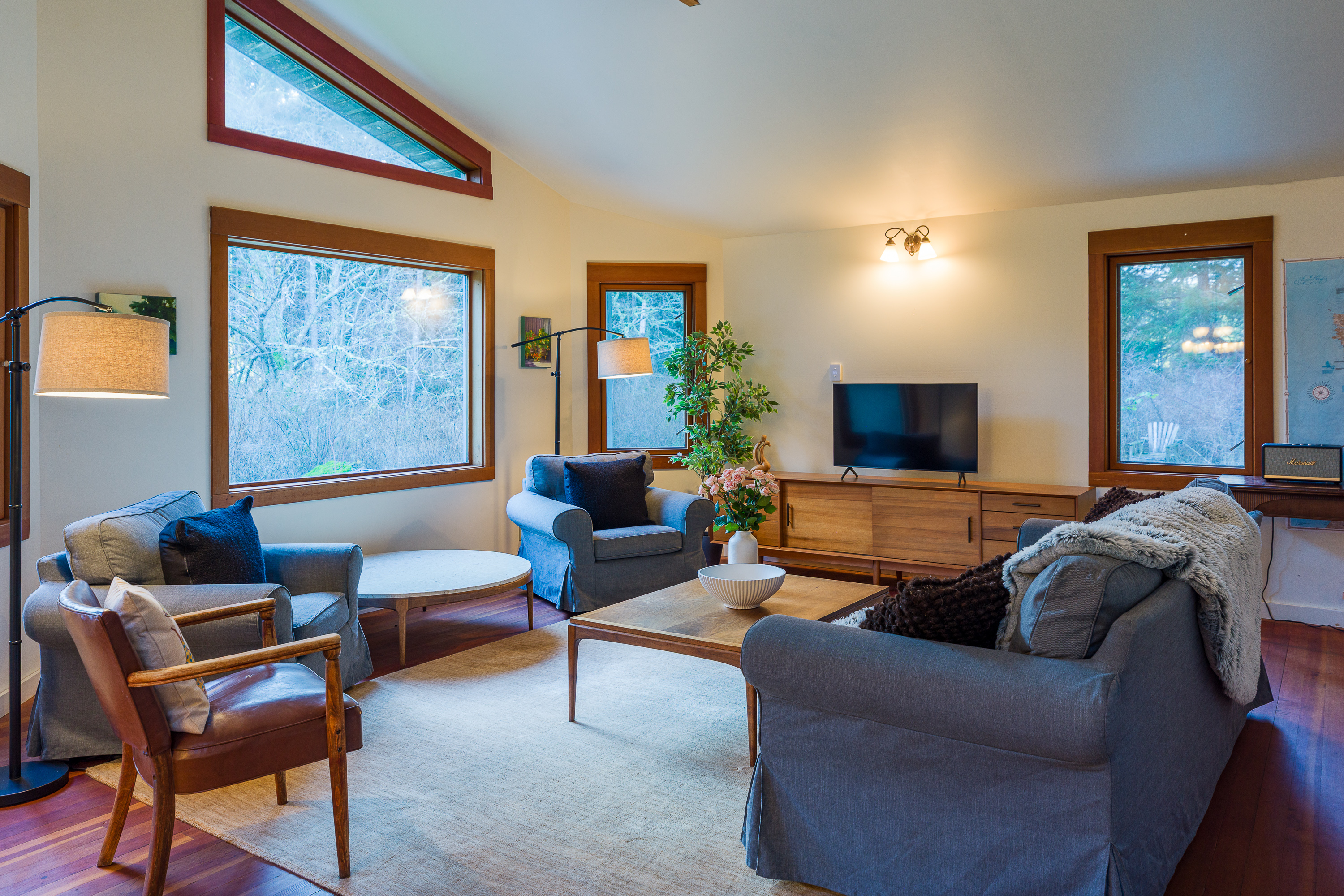 Light filled and open with high ceilings, the main living space overlooks the tranquil pond through large south facing windows. Comfortable seating creates an inviting place to relax after a day exploring Orcas Island. The layout flows seamlessly into the dining area and kitchen so everyone can stay connected while enjoying the peaceful forest setting.