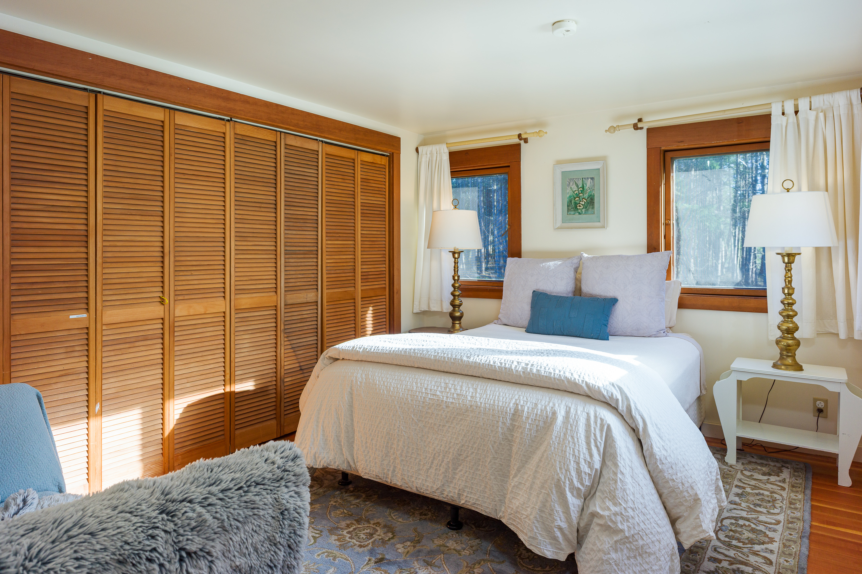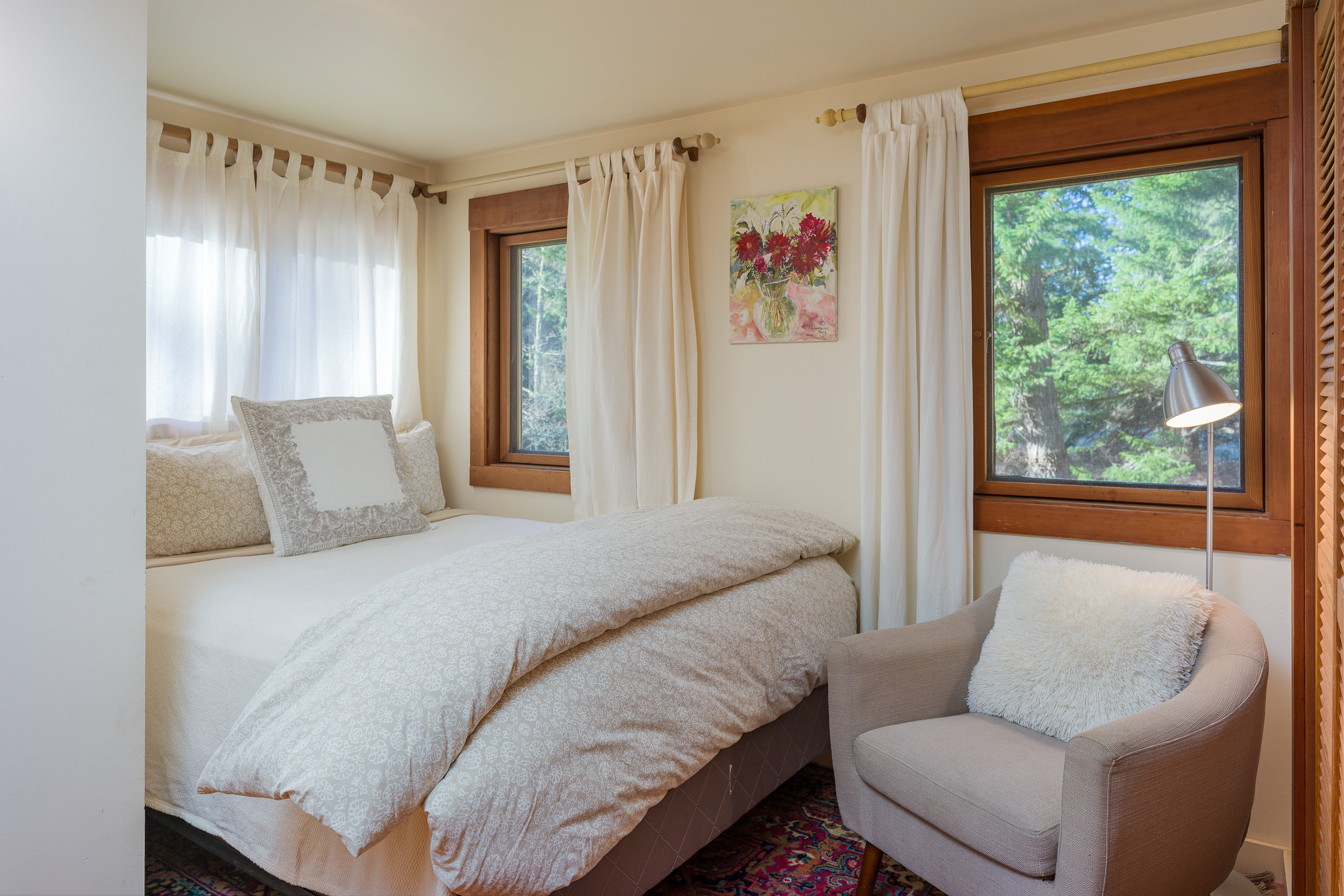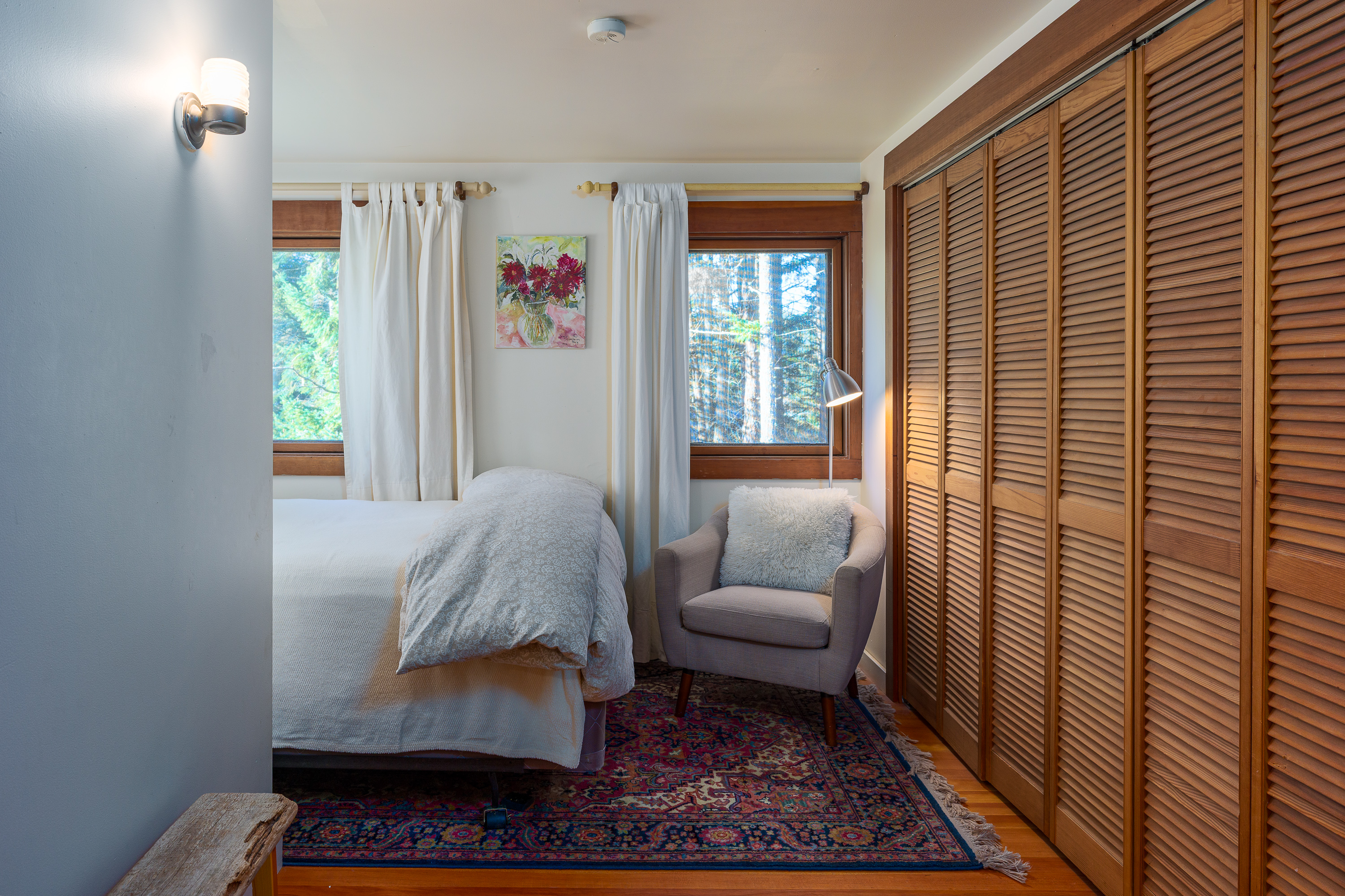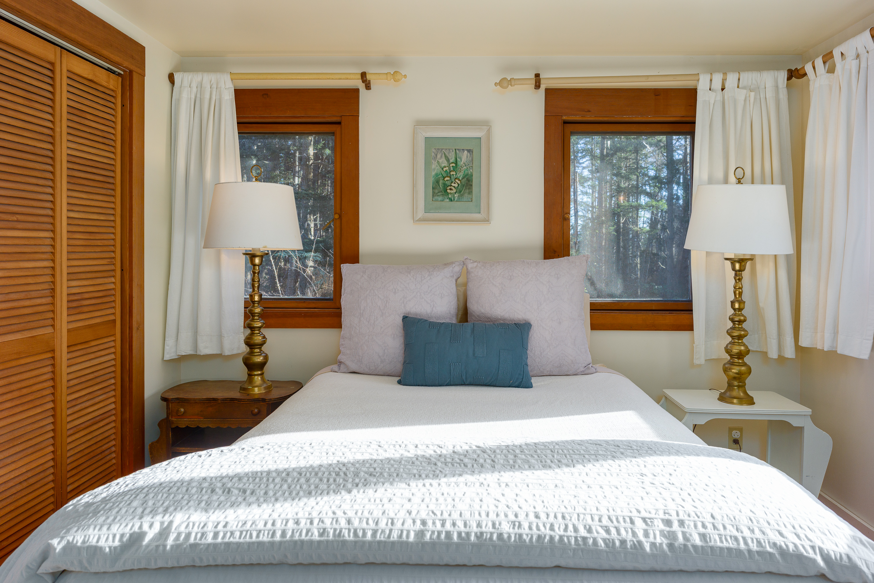 The second upstairs bedroom also features a queen bed and calming woodland views. It shares the upstairs bathroom and provides comfortable accommodations for couples or friends traveling together. Large closets with hangers, dresser and luggage racks allow to fully unpack and relax.