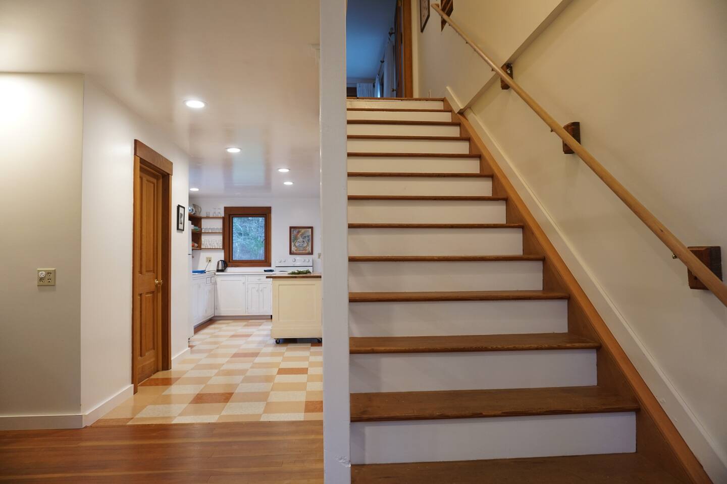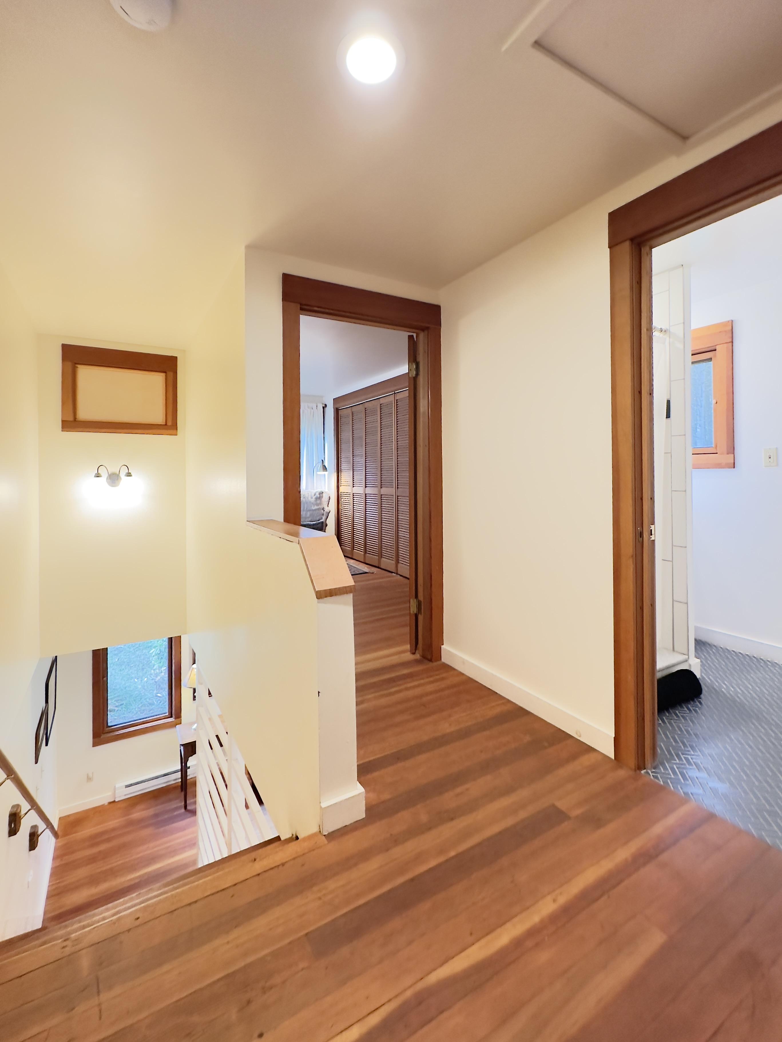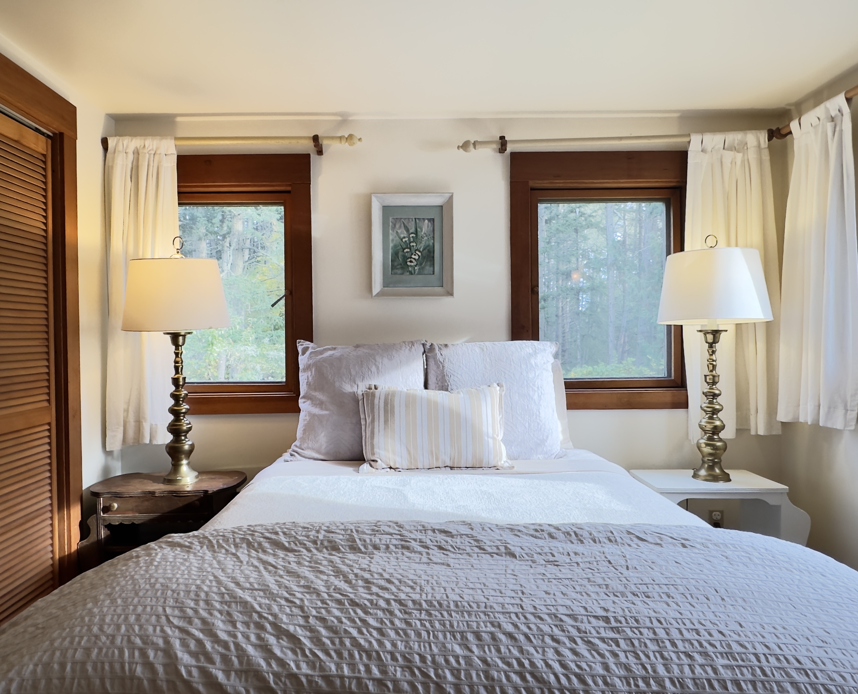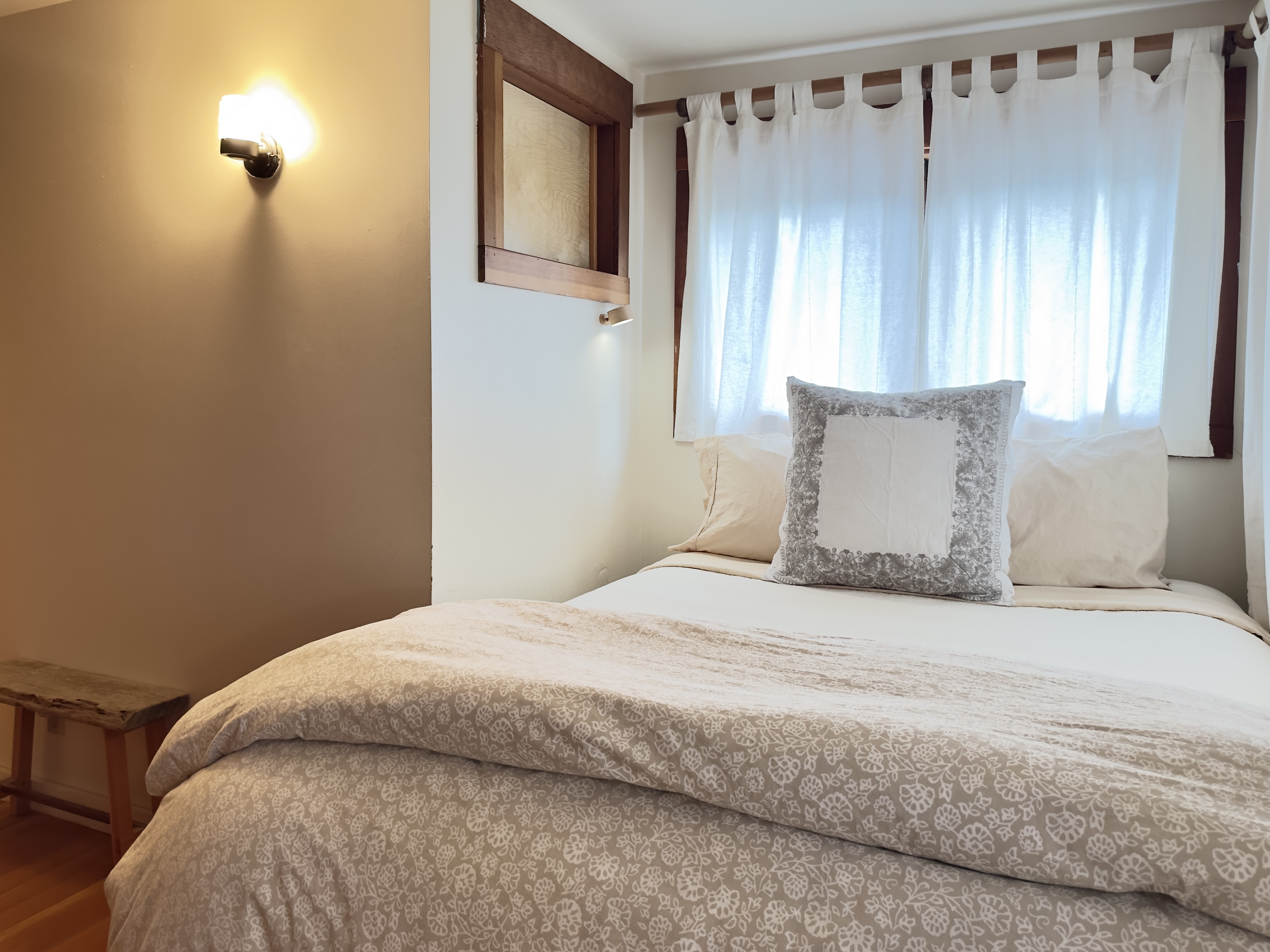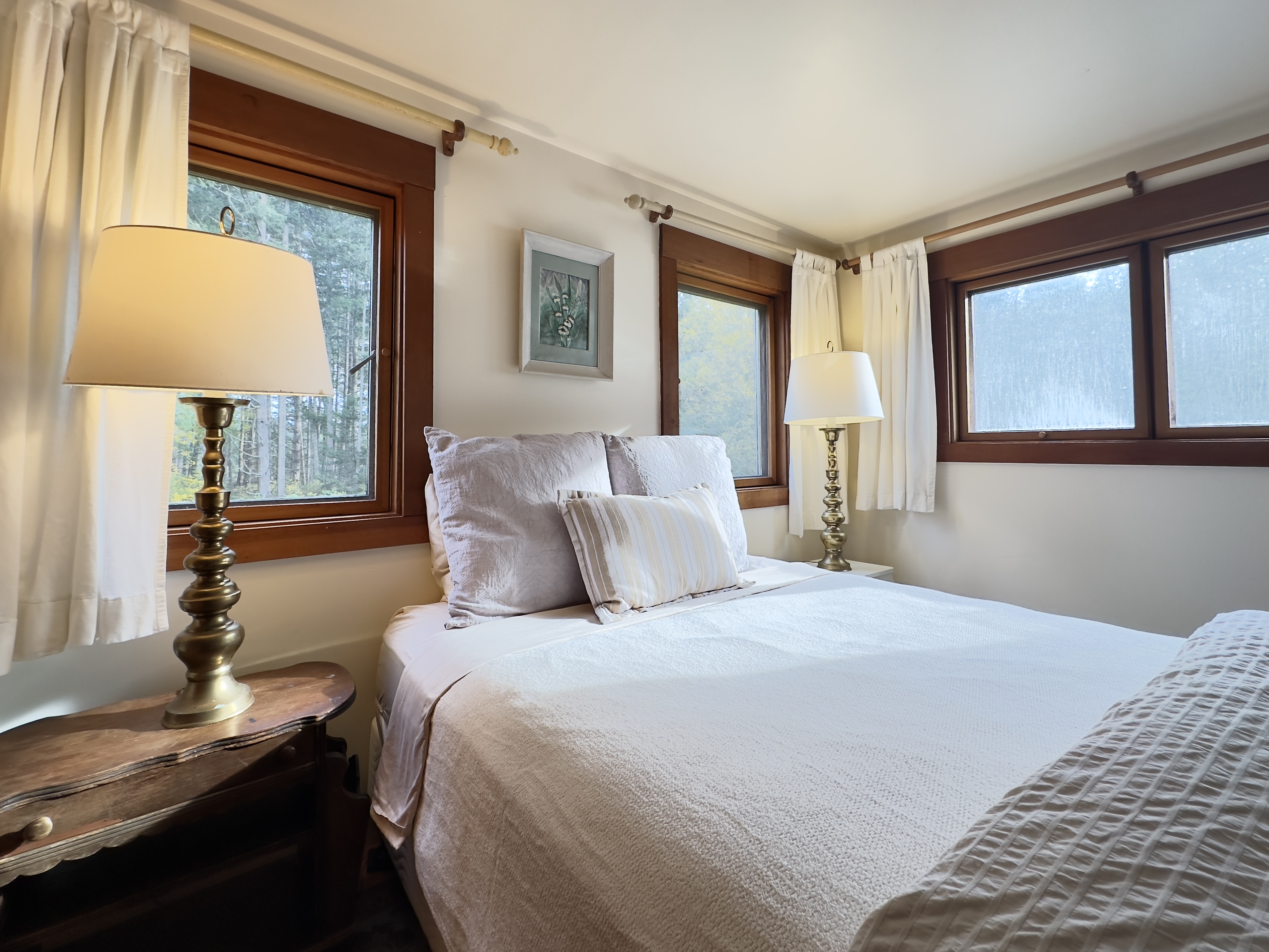 There are three queen beds, one in each upstairs bedroom and one in the little room off the dining room. (There are no windows in this room; it is separated from the bathroom and dining room with louver doors, so it's not exactly private, but it's super-cozy.)