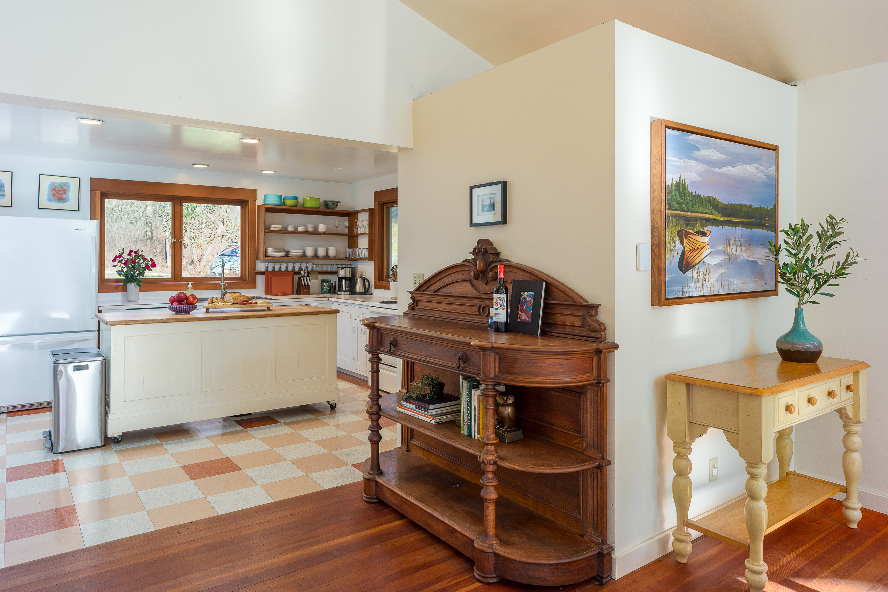 Located beside the kitchen and surrounded by natural light, the dining area offers a spacious table perfect for gathering together. Whether you are enjoying a celebration meal or a casual breakfast before heading into Eastsound, this space keeps you connected to the beauty outside.