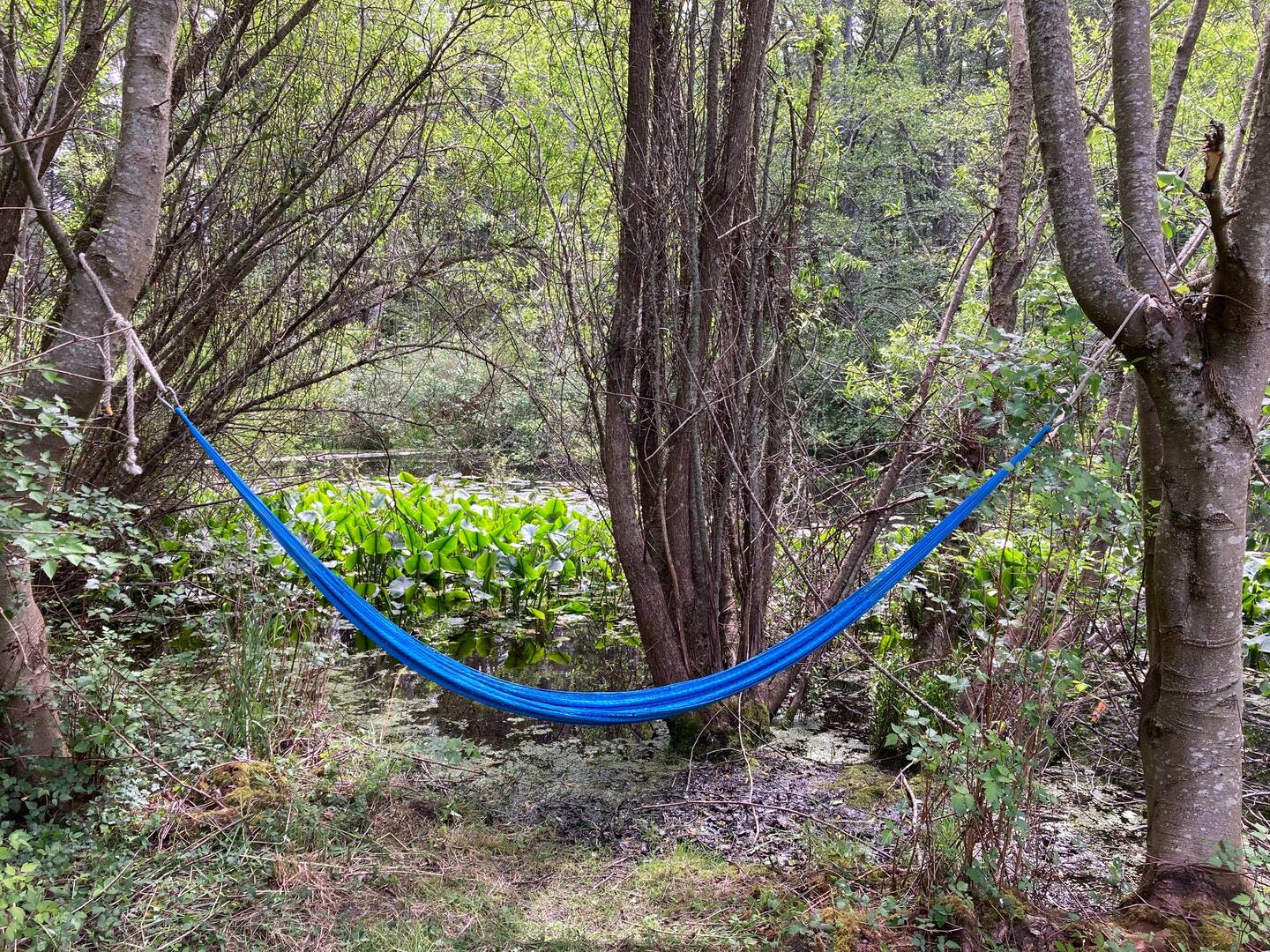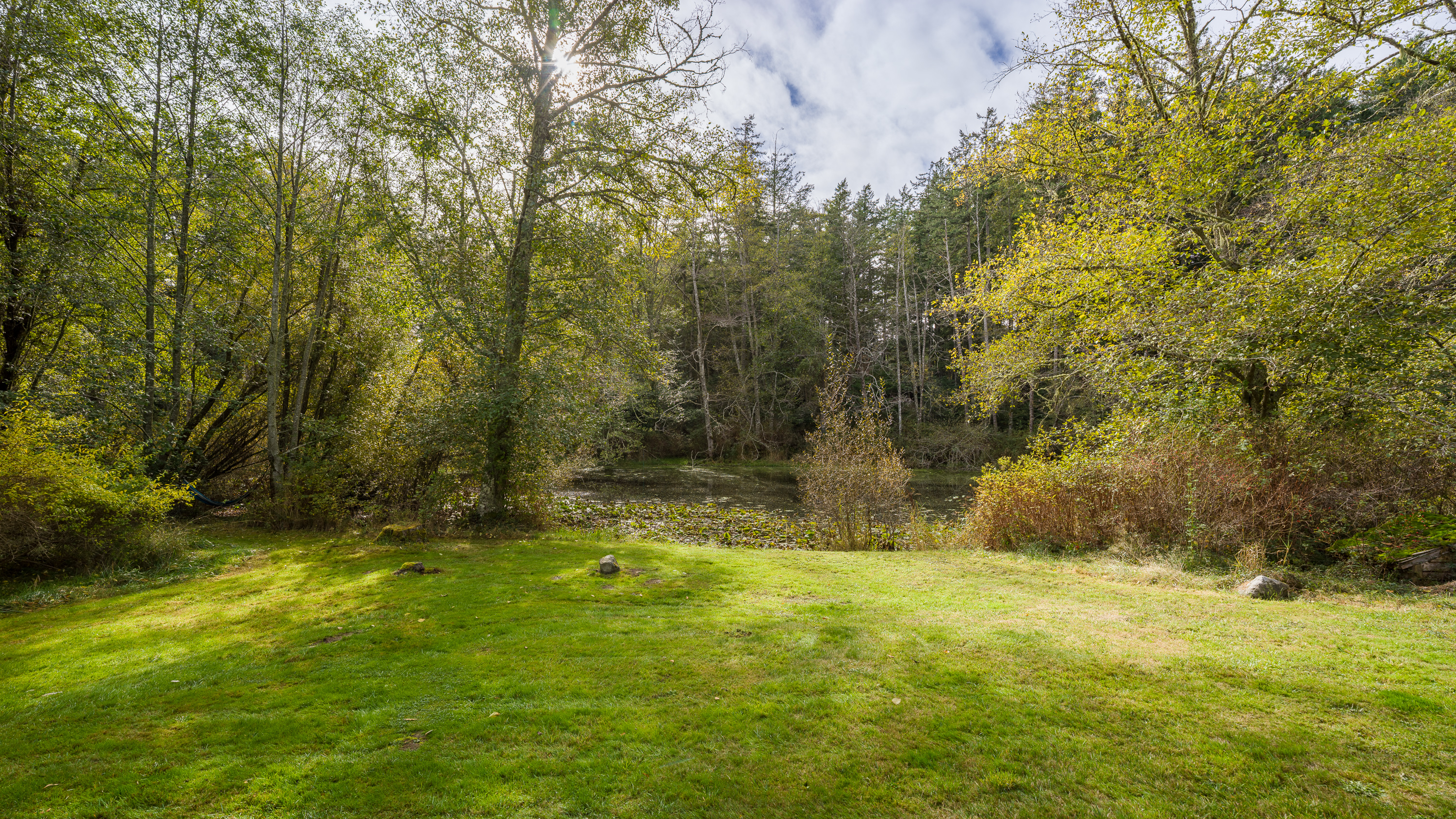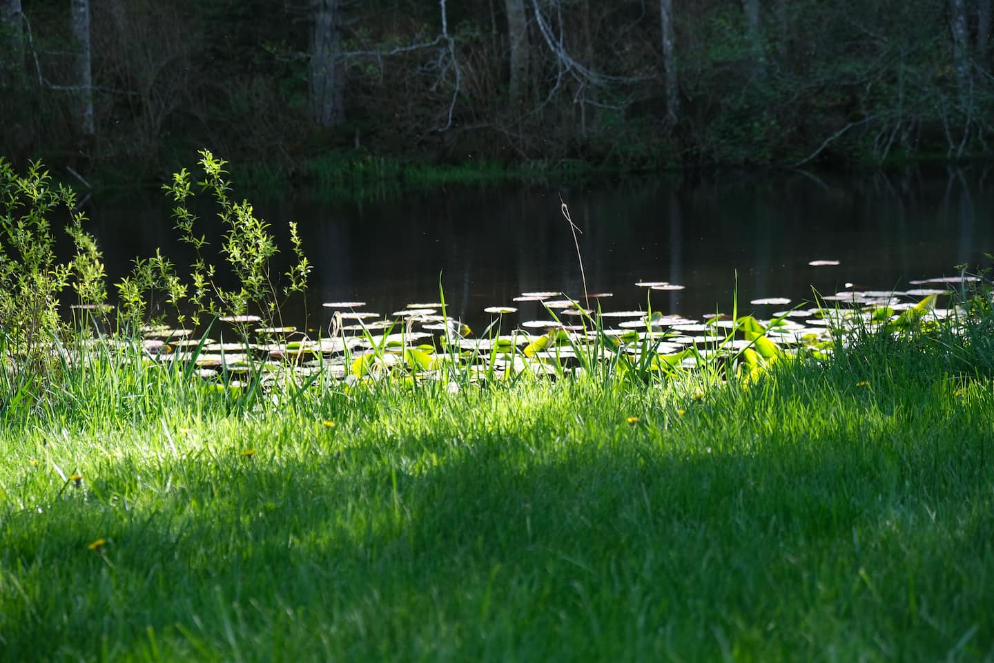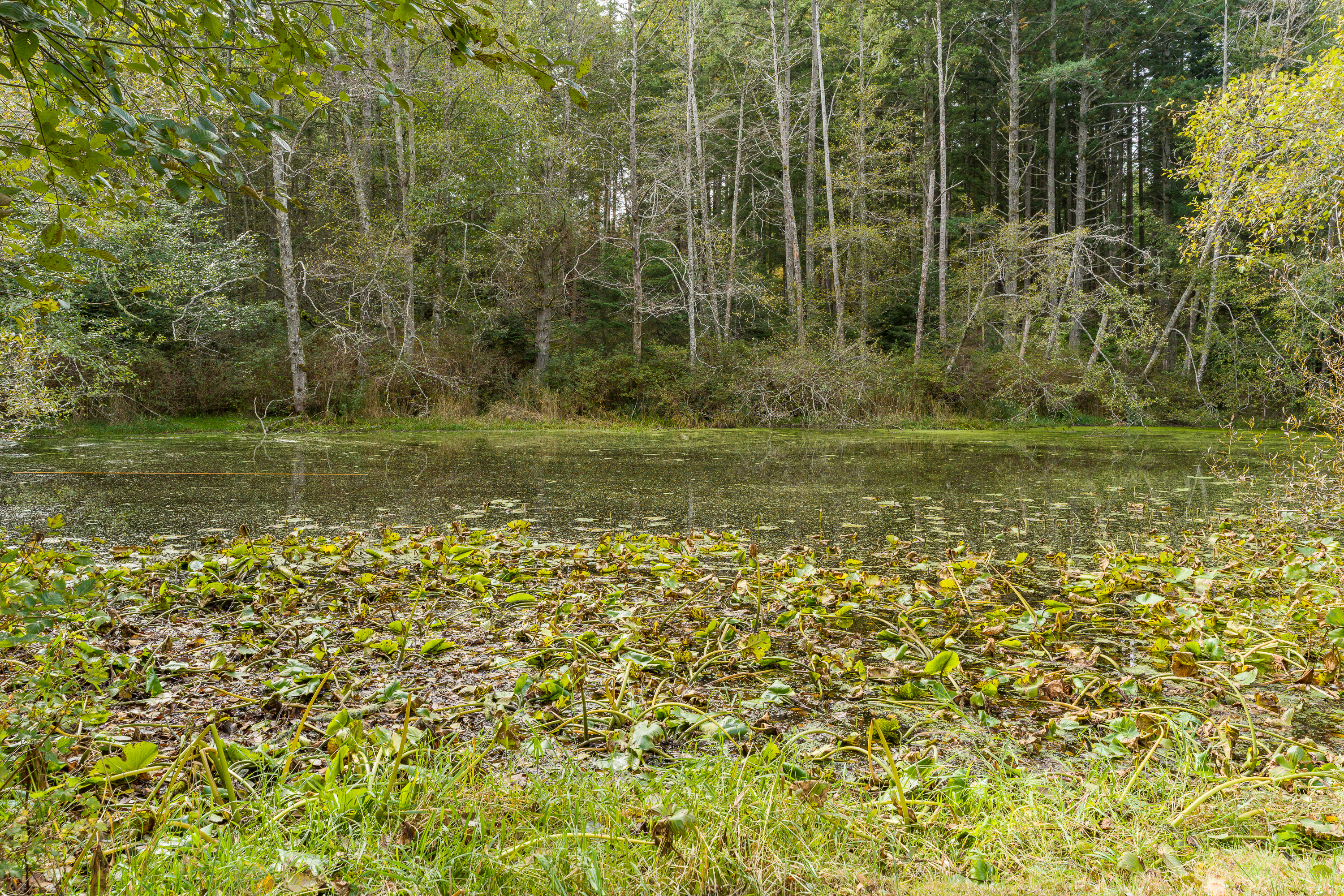The pond attracts wild ducks and other wildlife. Depending on the time of year, you might see baby ducks following their mother through the lily pads, a heron flying low over the water, or a family of deer coming down to drink.