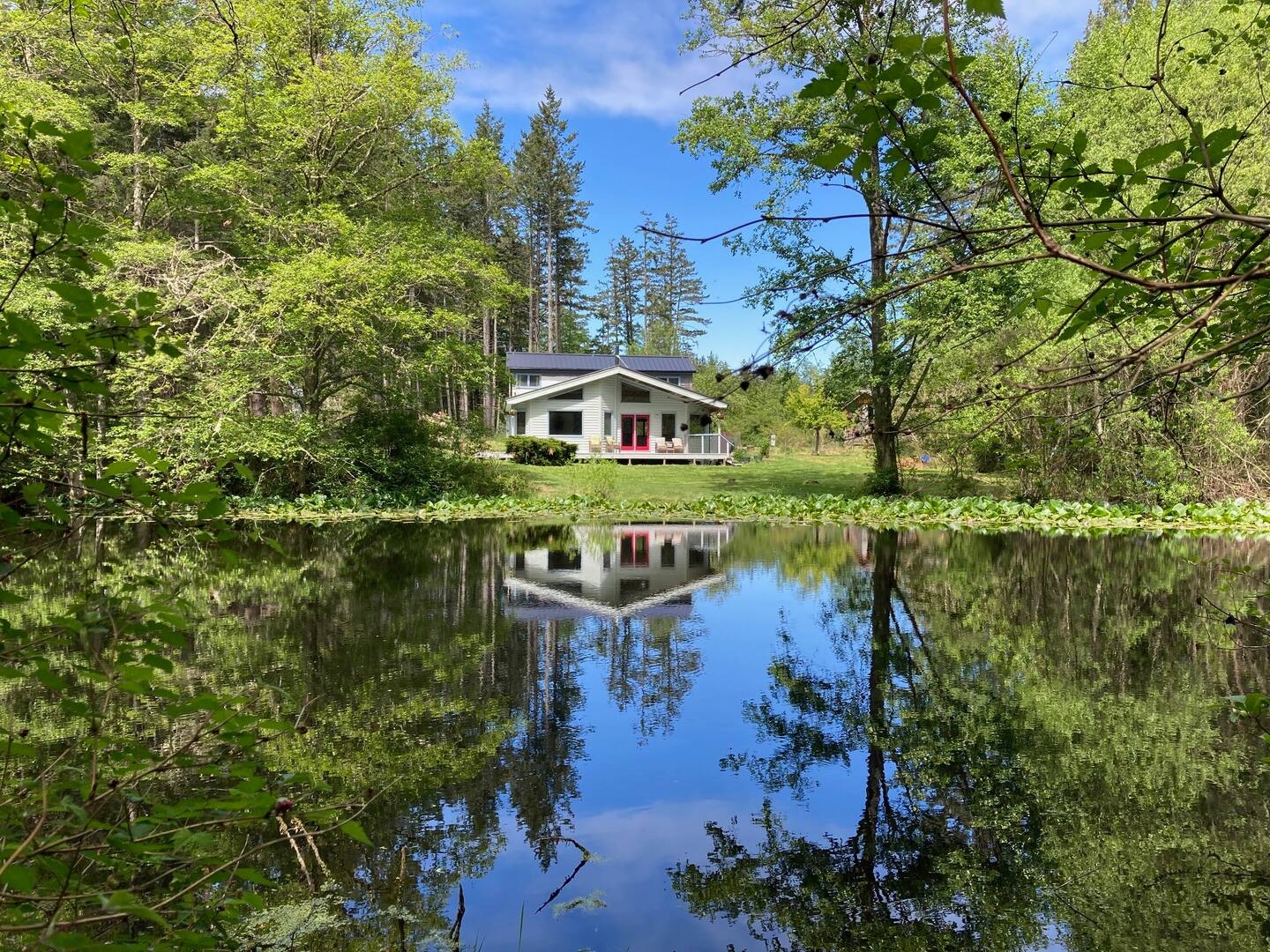 Dragonfly Pond house is a rustic, spacious, light-filled vacation rental home on Orcas Island with high ceilings overlooking a tranquil pond. Clean & comfy. Located in 7 acres of forest, it’s peaceful and secluded. Close to town and the ferry. High-speed Internet.