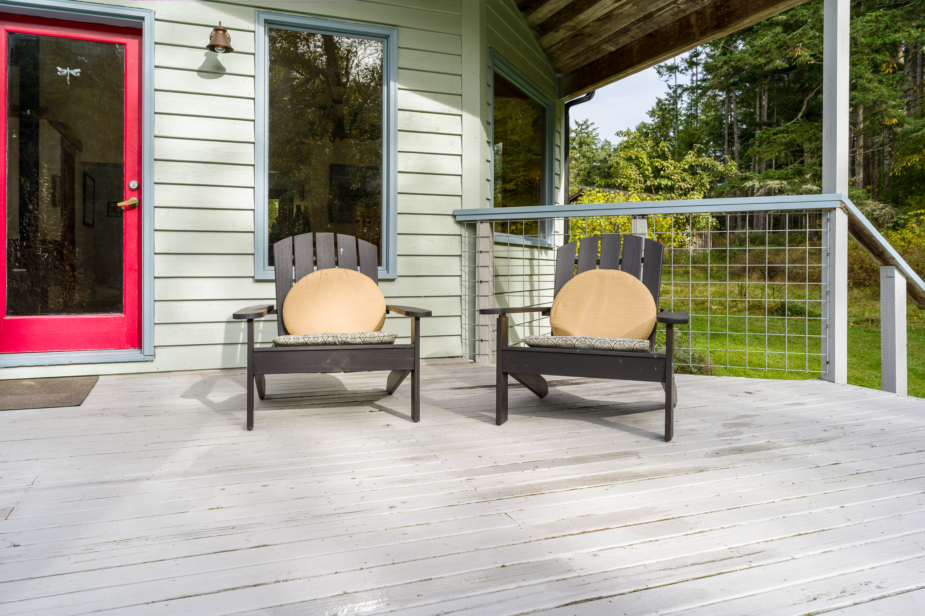 The front porch overlooks the pond and has wooden chairs and pillows. This is our favorite part of the home. Anytime of the day, rain or shine, we find nothing more relaxing than sitting on the deck and gazing at the pond. (A roof overhang keeps you dry even if it's raining.)