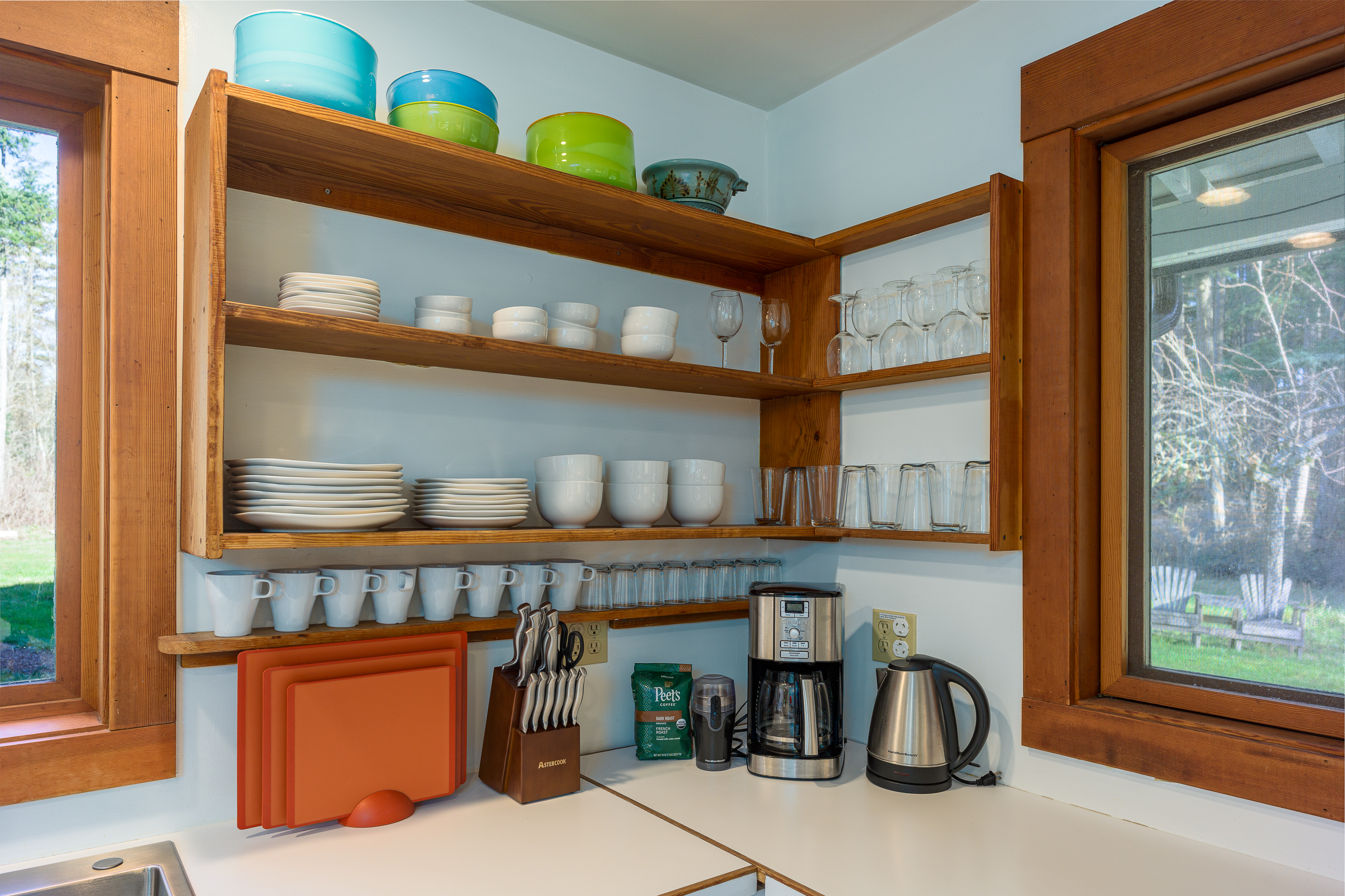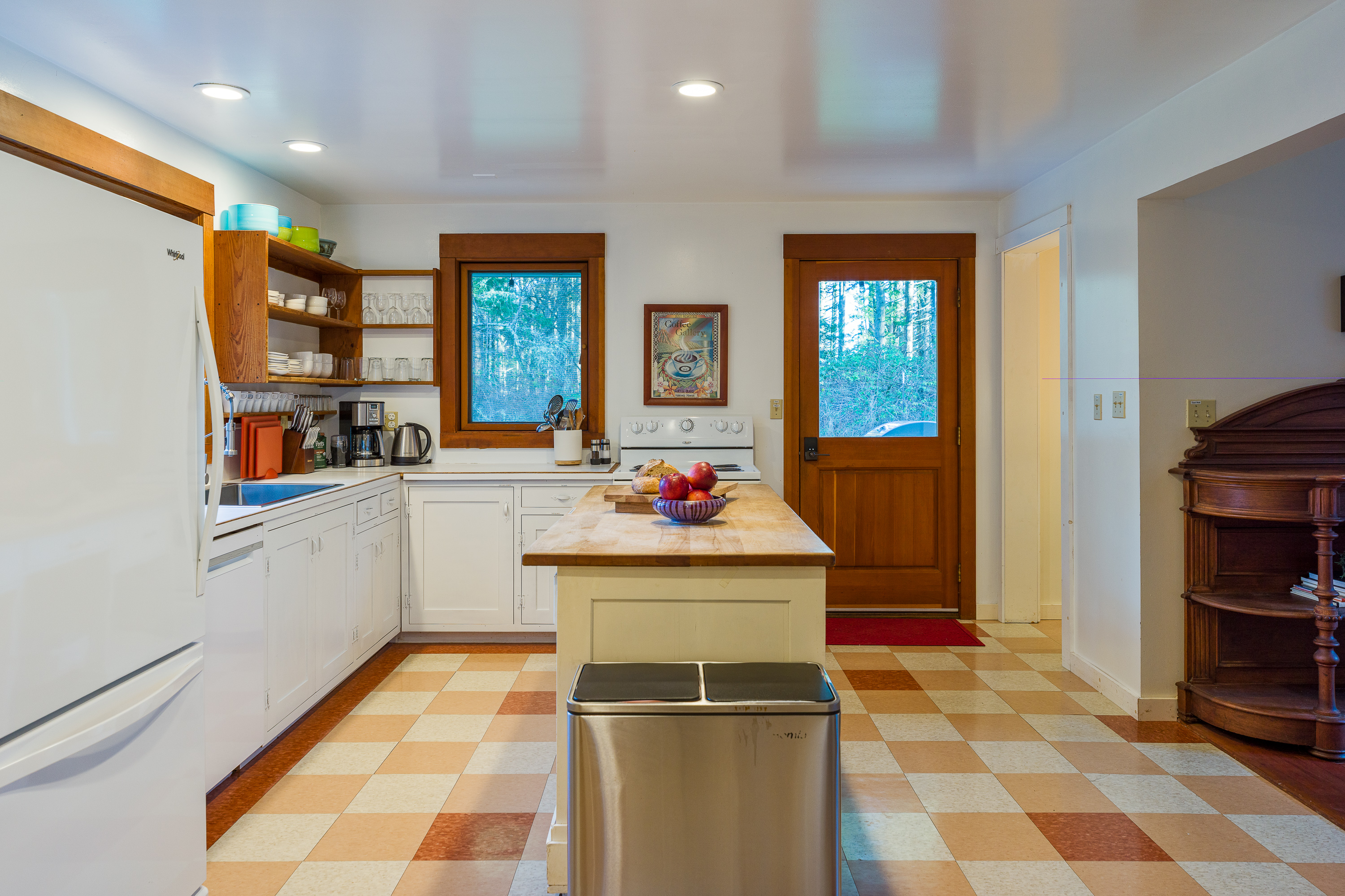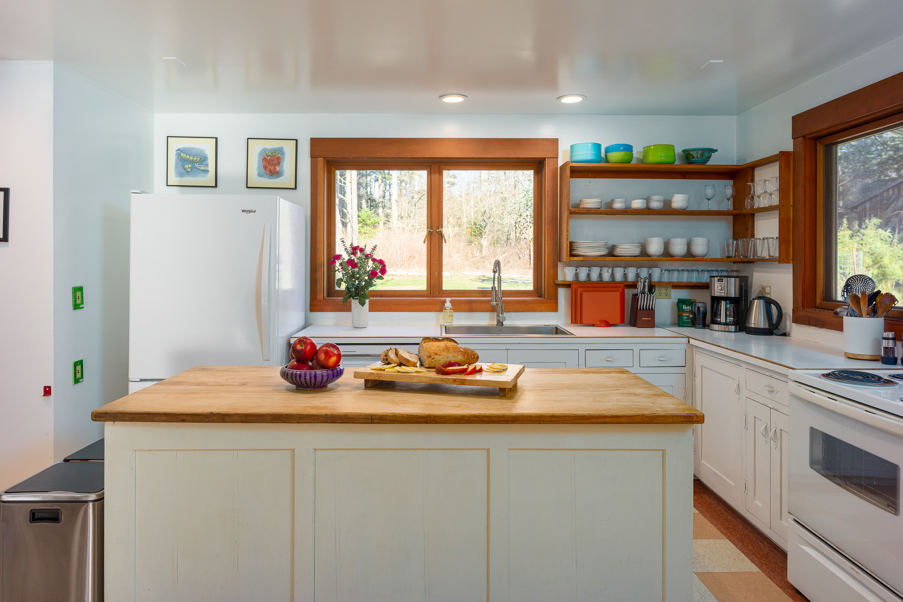 One of the joys of staying at Dragonfly Pond is cooking in a fully functional kitchen designed for real meals. You will find a full oven and range, microwave in the pantry, blender, toaster, French press, coffee grinder, and electric coffeemaker. Generous cookware, utensils, and pantry staples make preparing vacation meals easy and enjoyable. A gas grill sits just outside the kitchen door for outdoor cooking.