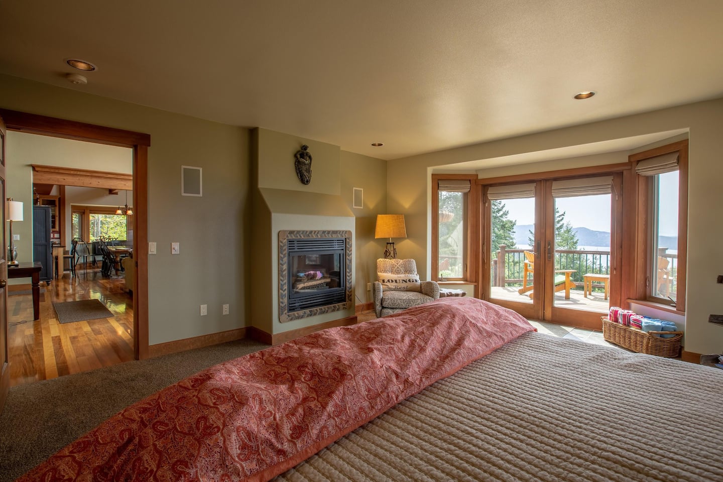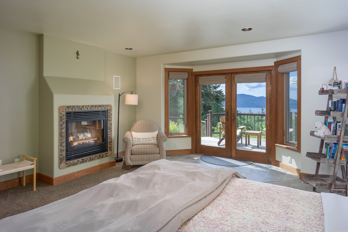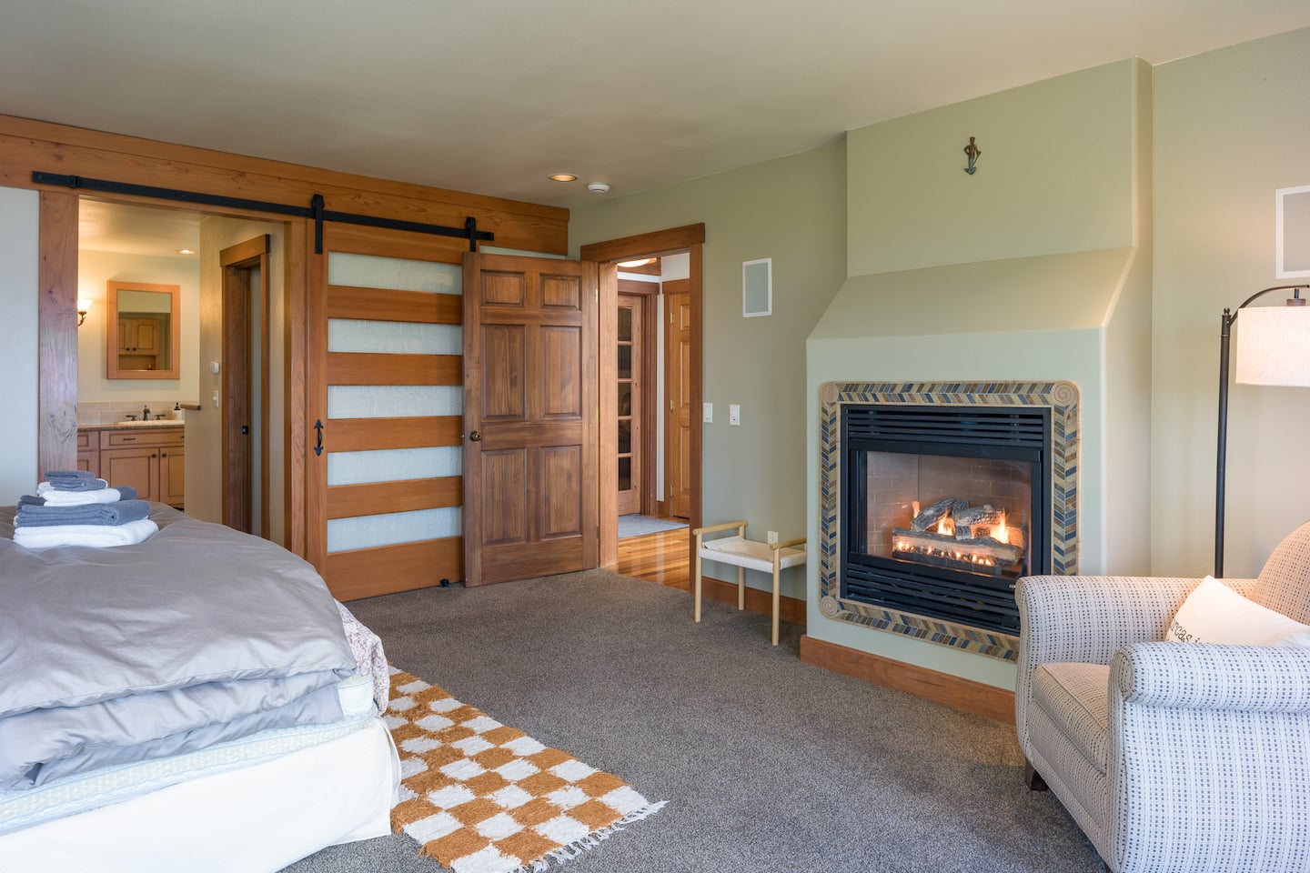 The master bedroom ensuite is on the main level, featuring a King bed, a gas fireplace, a reading chair, two walk-in closets, and a luxurious bathroom. Upstairs, there are two generous bedrooms with Queen beds, closets, and reading benches. We provide fine linens, towels, and quality furnishings in each bedroom for your comfort.
