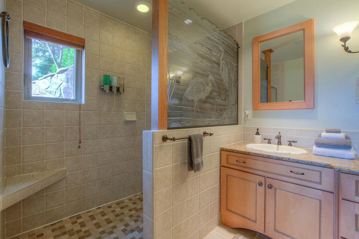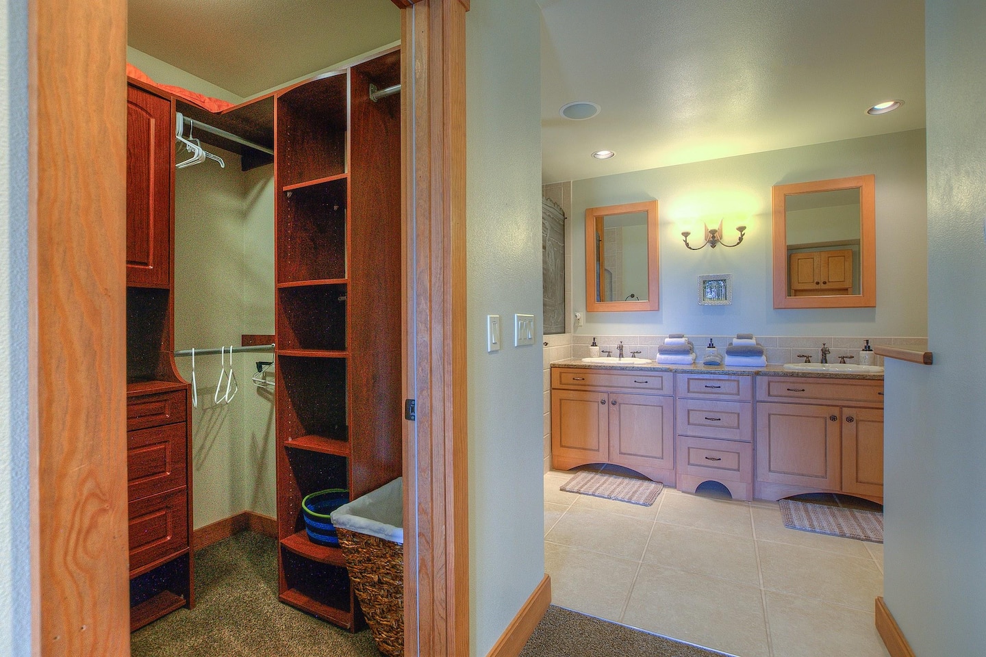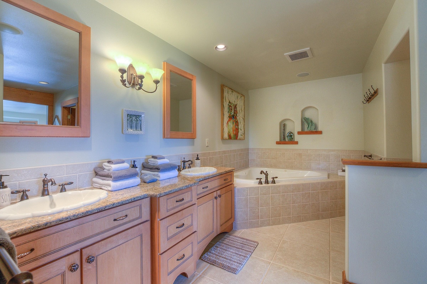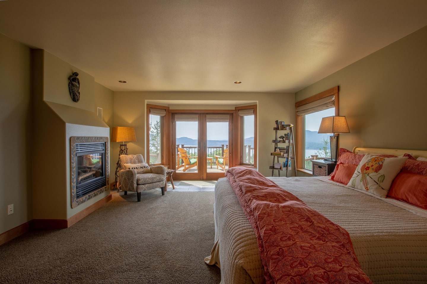 The master bedroom ensuite is on the main level, featuring a King bed, a gas fireplace, a reading chair, two walk-in closets, and a luxurious bathroom. Upstairs, there are two generous bedrooms with Queen beds, closets, and reading benches. We provide fine linens, towels, and quality furnishings in each bedroom for your comfort.