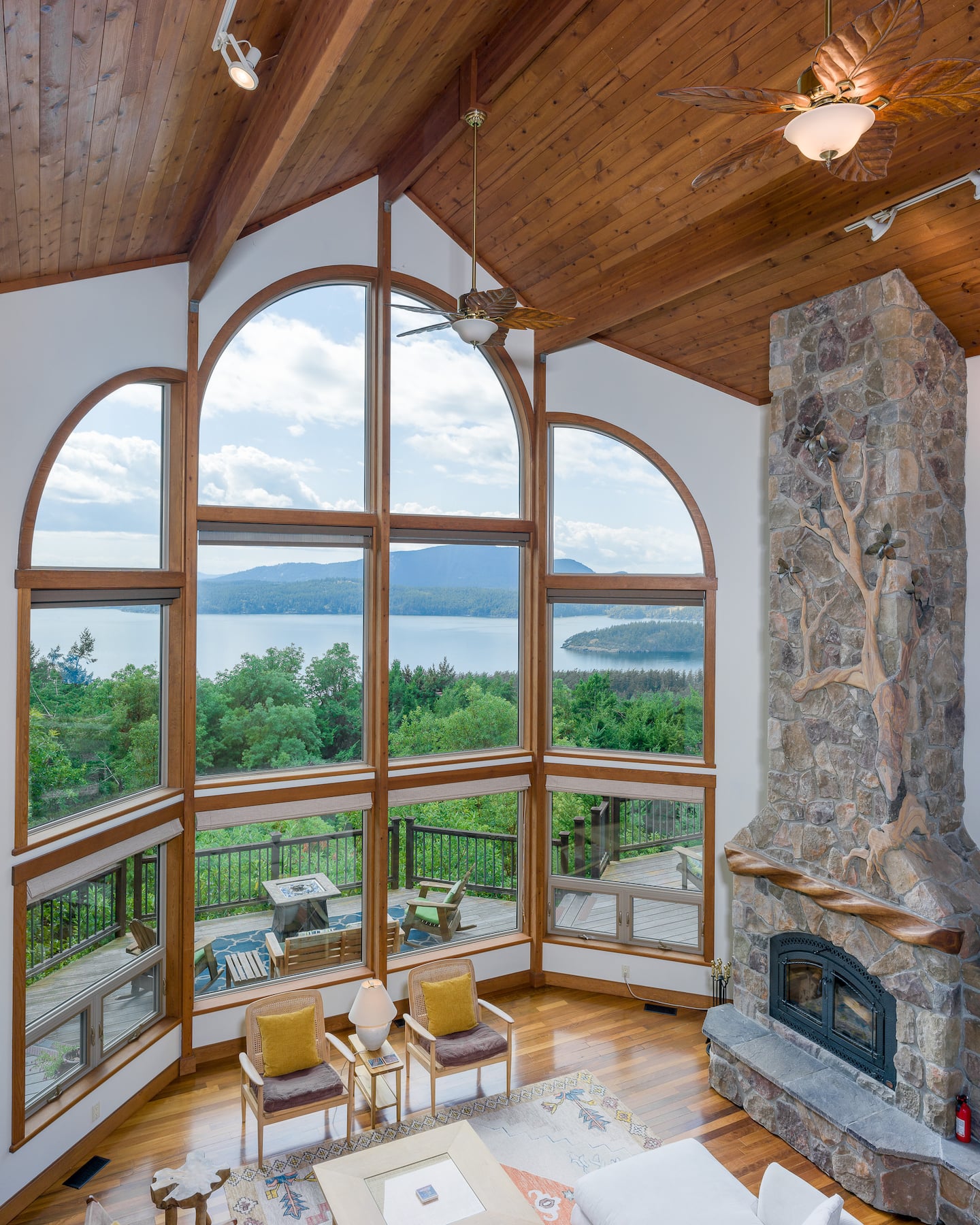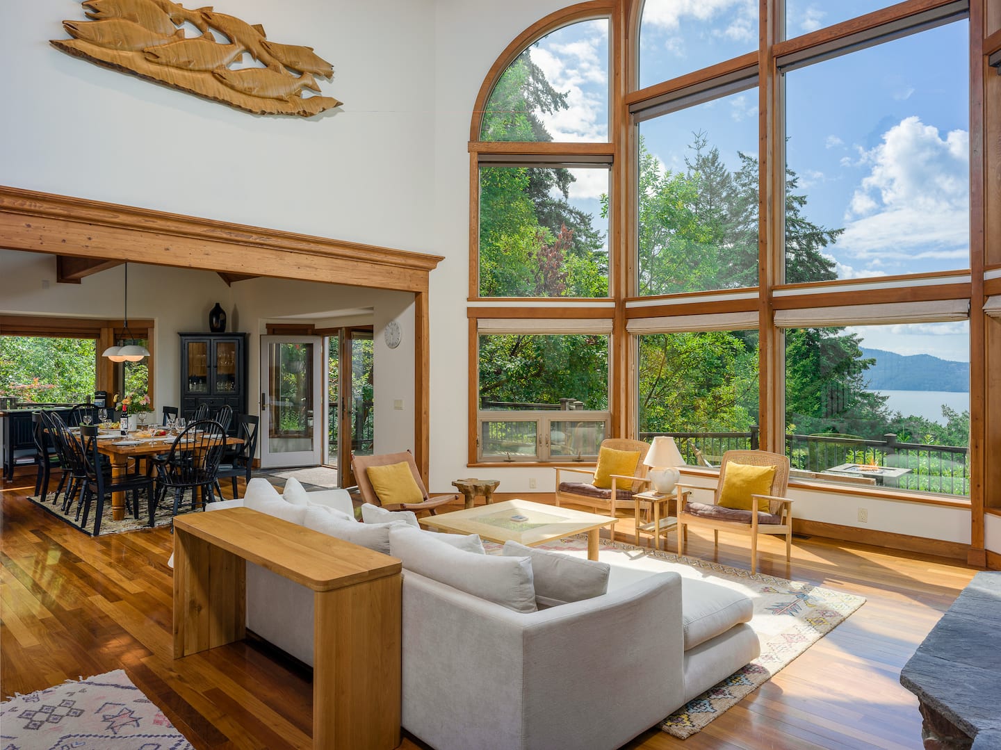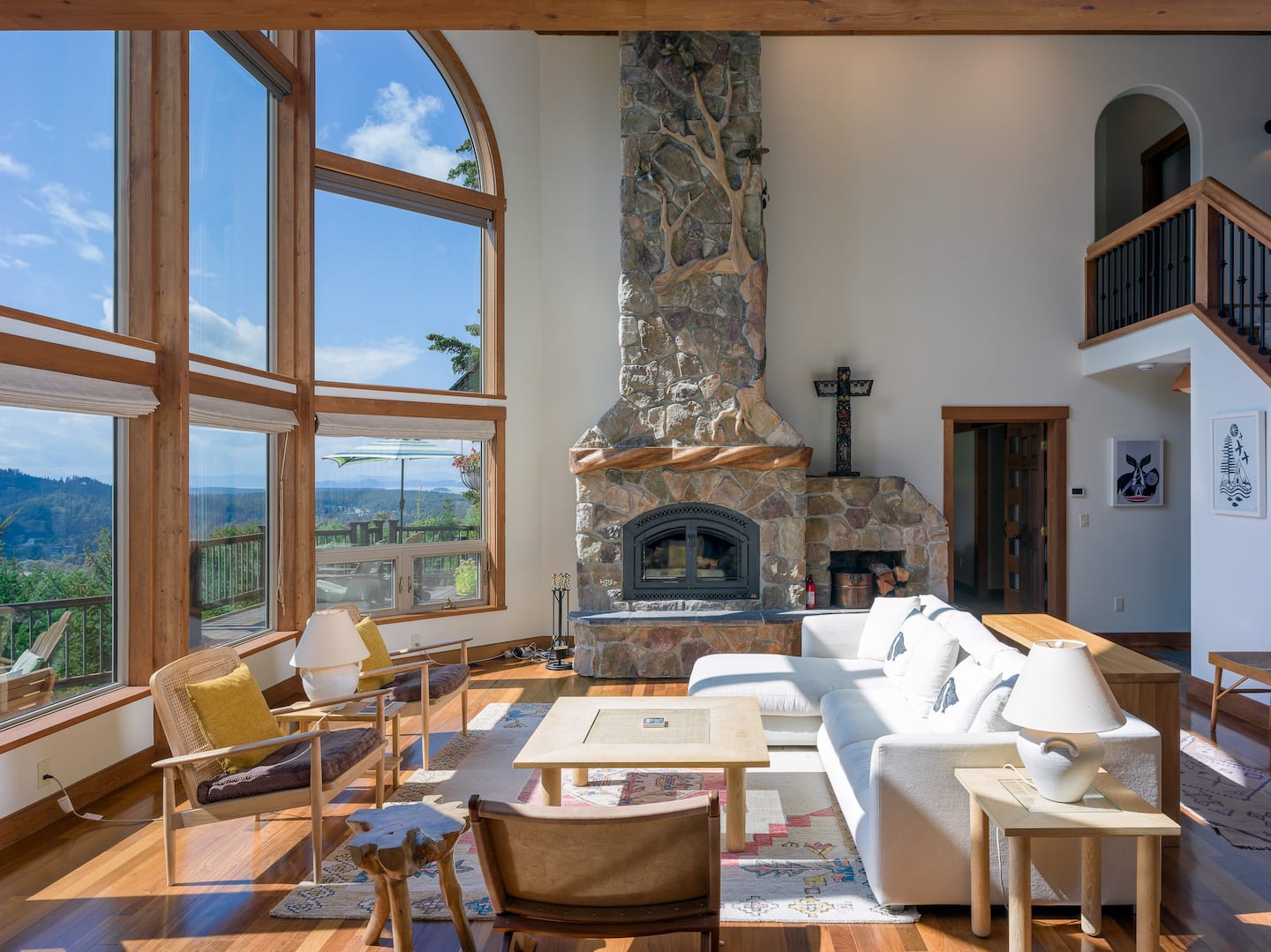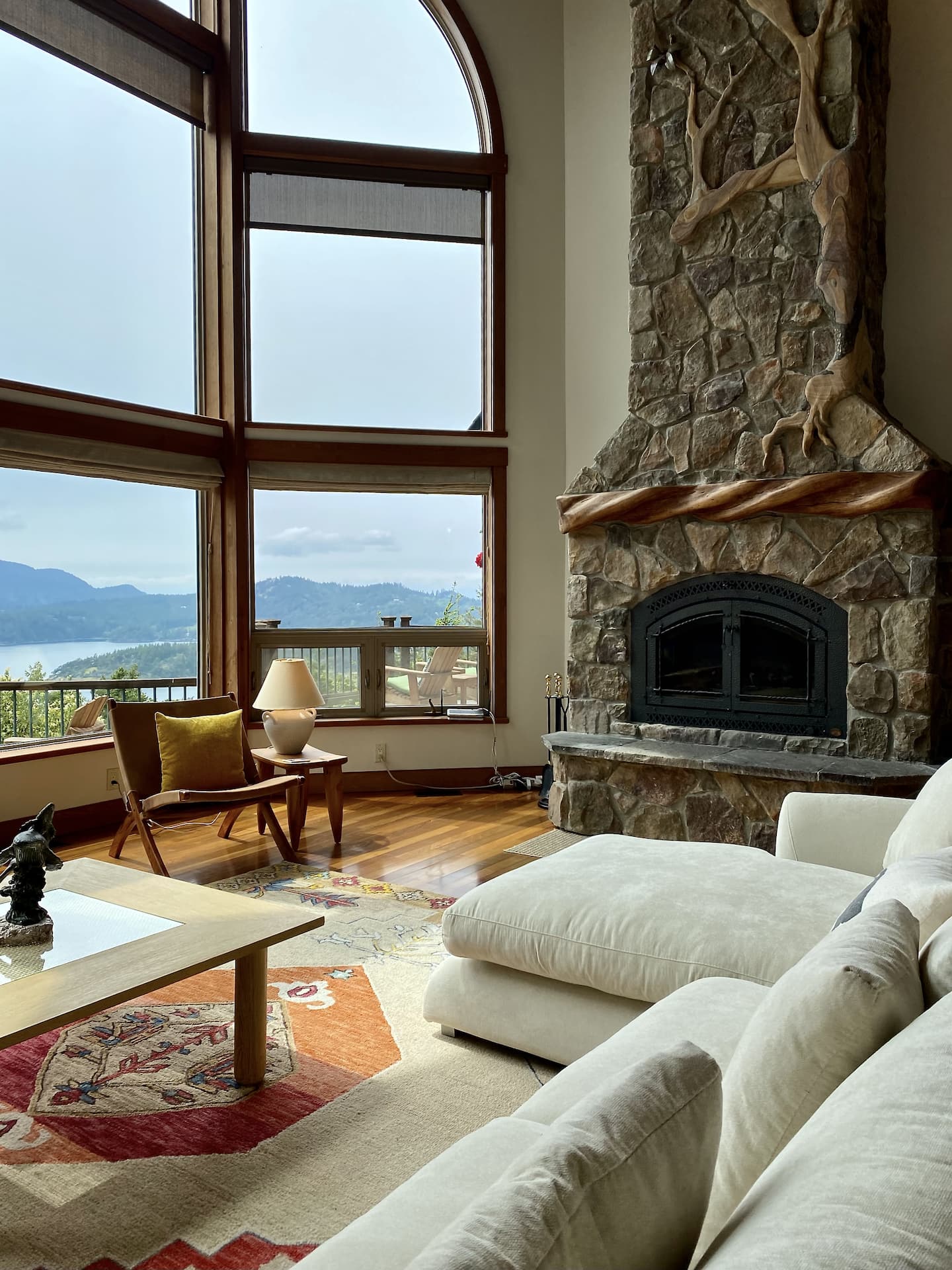 The Great Room is the heart of the home, featuring beautiful handcrafted woodwork and an impressive stone fireplace. The vaulted ceiling with three-story windows gives you breathtaking views of sunsets and the surrounding islands. Comfortable, Scandanavian-inspired couch and chairs create a cozy space to relax while taking in the magnificent views of the Puget Sound and warmth of a wood fire.