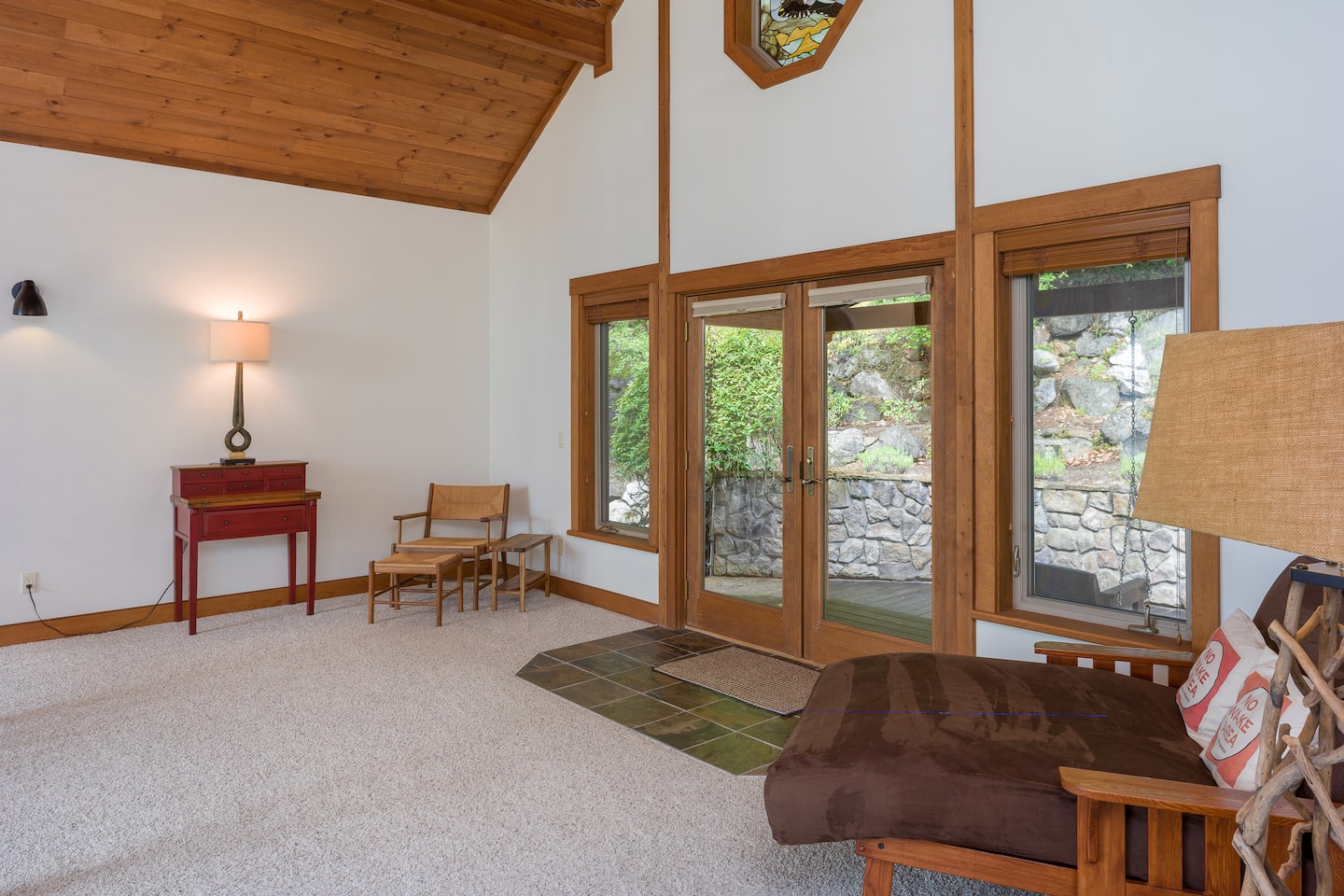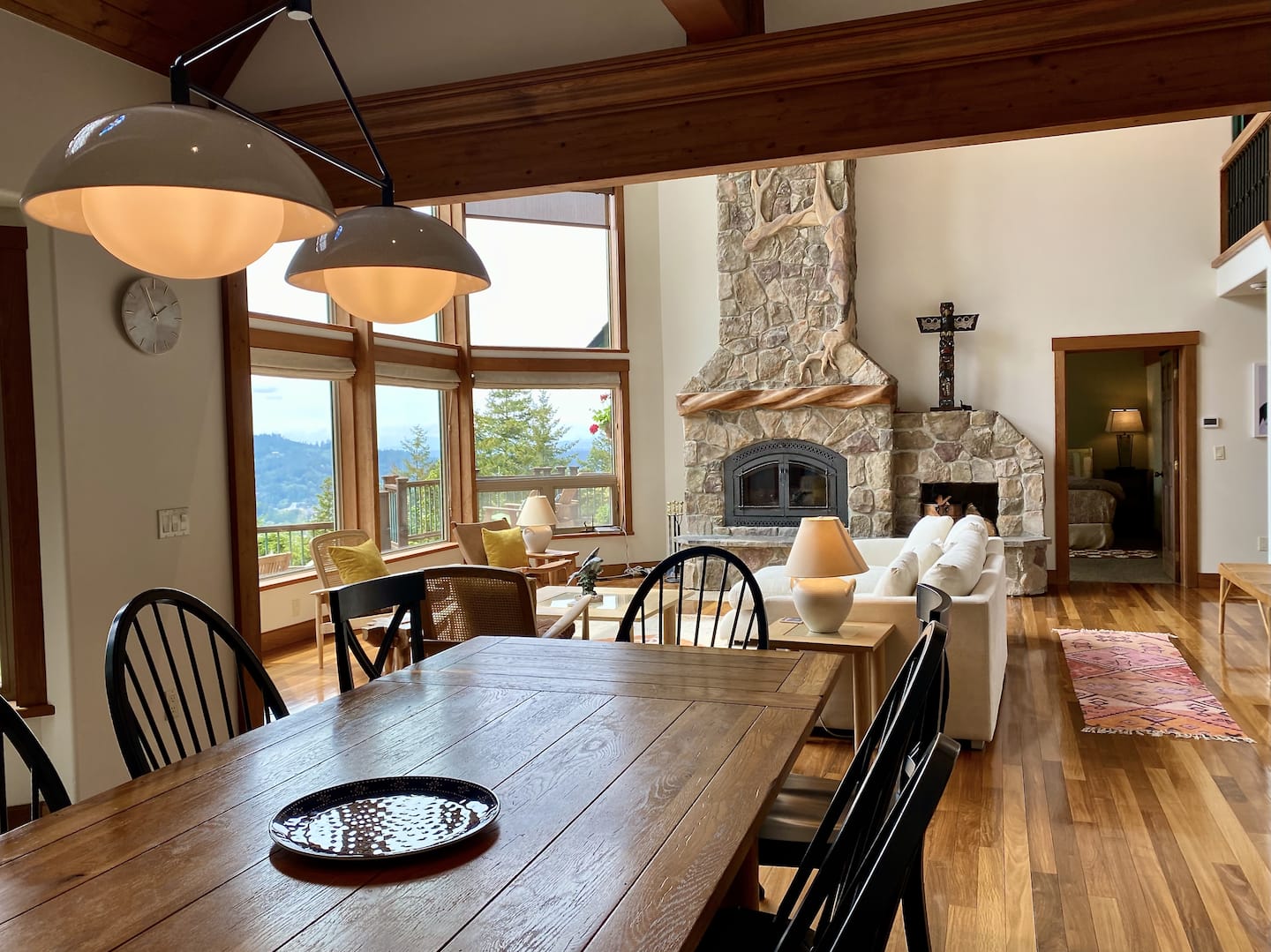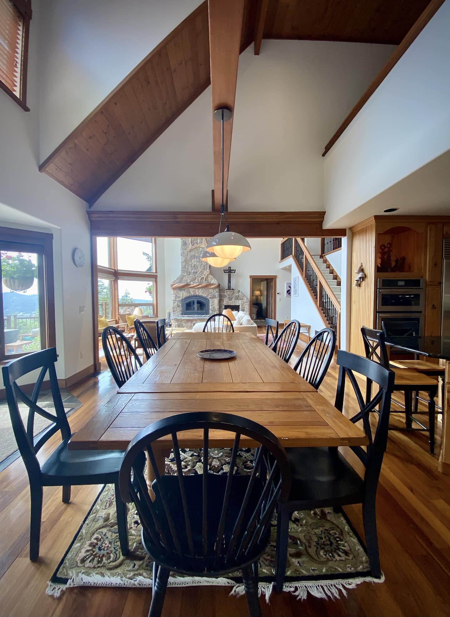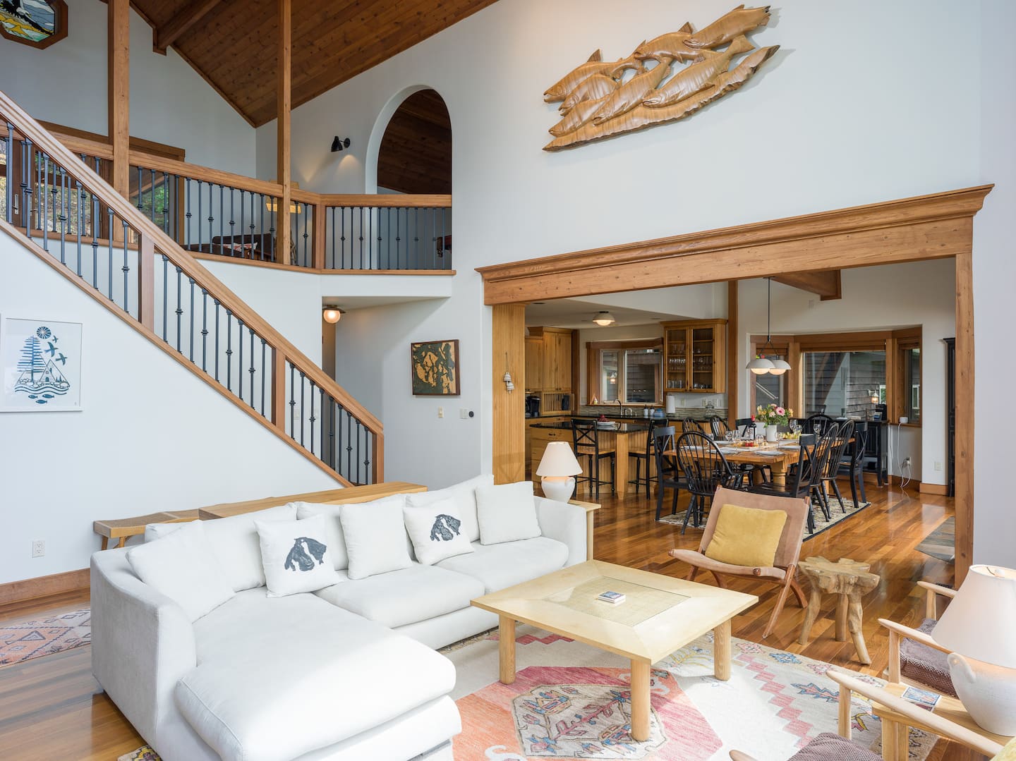 The Great Room is the heart of the home, featuring beautiful handcrafted woodwork and an impressive stone fireplace. The vaulted ceiling with three-story windows gives you breathtaking views of sunsets and the surrounding islands. Comfortable, Scandanavian-inspired couch and chairs create a cozy space to relax while taking in the magnificent views of the Puget Sound and warmth of a wood fire.
