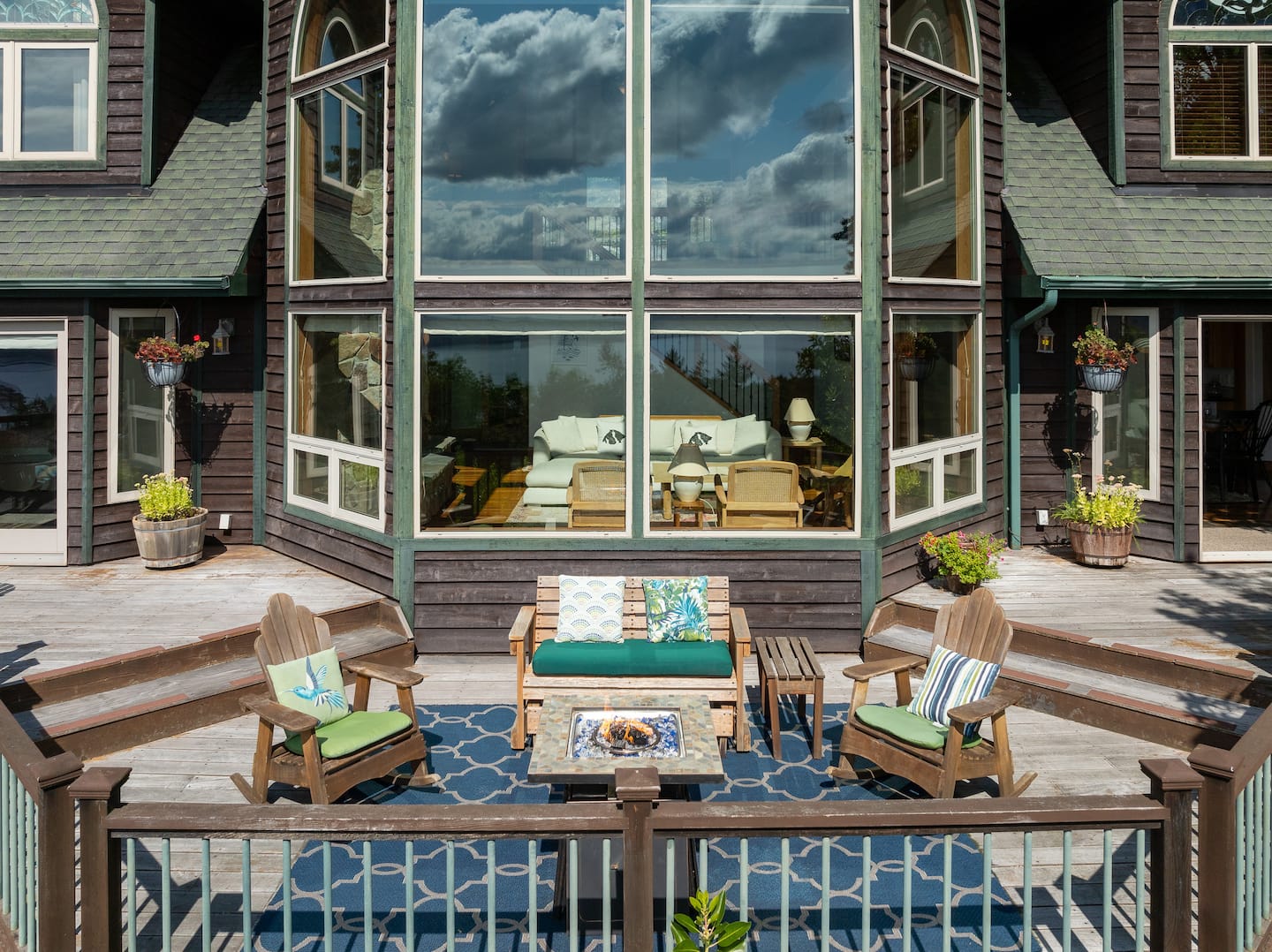 The outdoor deck is perfect for summer evenings, featuring comfortable Adirondack chairs, chaise lounges, and an outdoor gas fireplace. A dry sauna and hot tub offer a special treat, with a nearby gas fire pit for cozy gatherings.