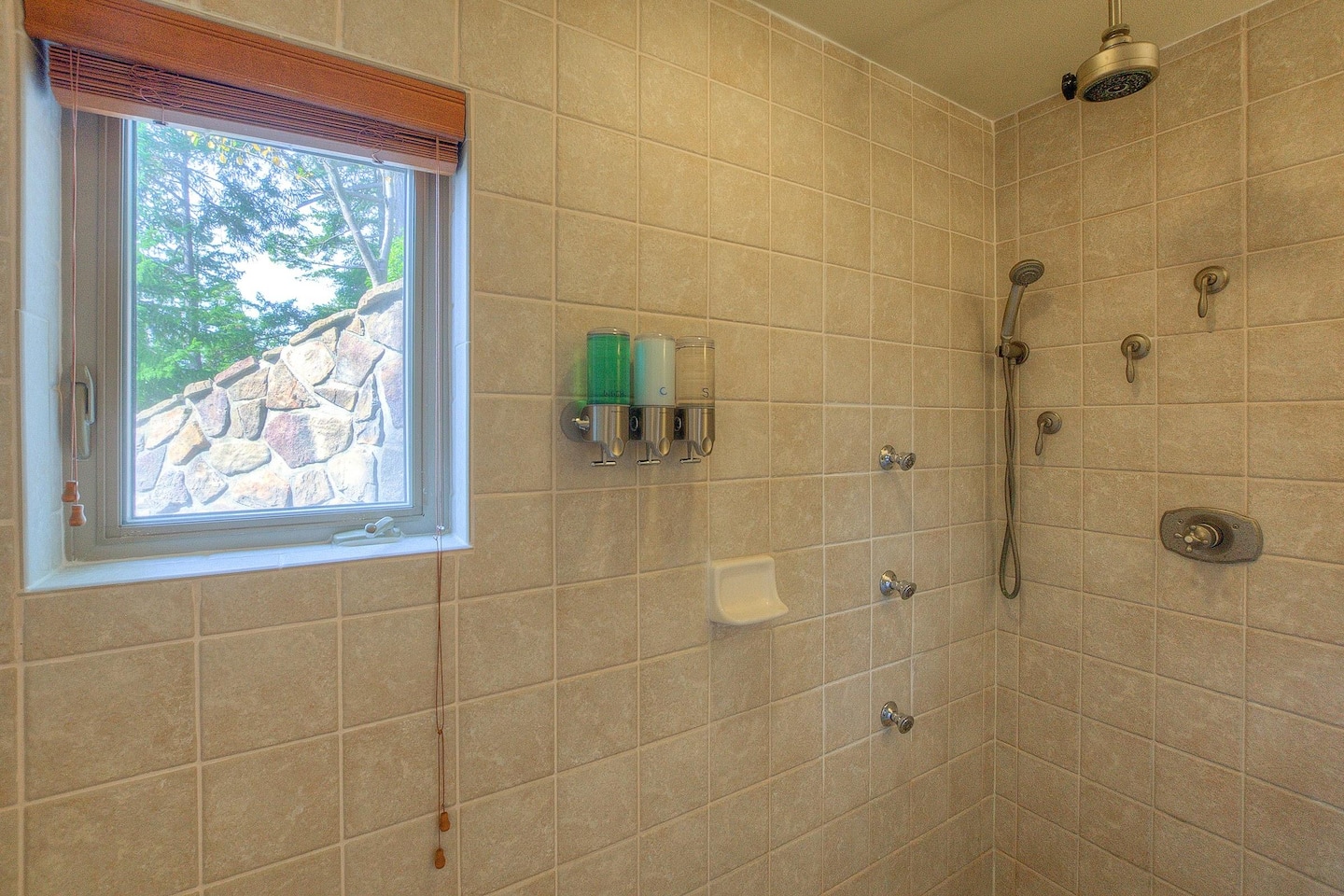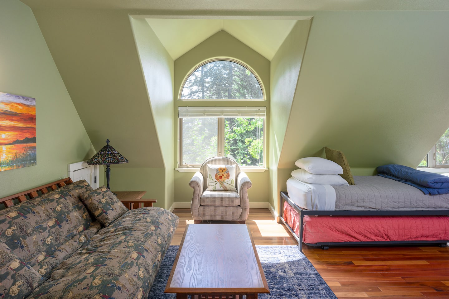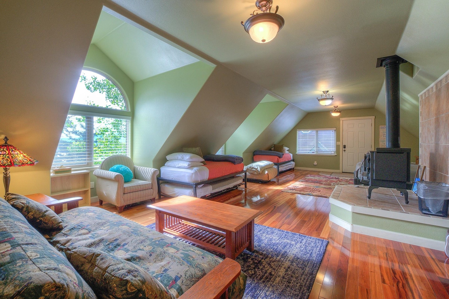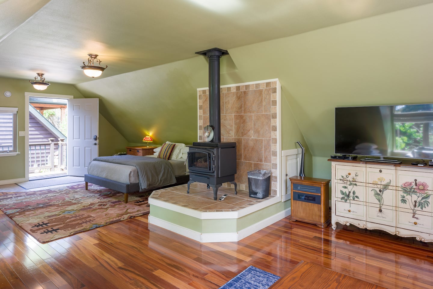 Separate from the main house and connected by an outdoor deck, the 500 sq. ft. sleeping studio features a comfortable Queen bed and two twin beds. The bunkhouse offers additional space with a Smart TV and seating area for relaxation and games and a custom- tiled shower with on-demand hot water, so everyone can shower without worry. With wood floors, comfortable beds, and a lounge area, it’s ideal for a second family or friends.