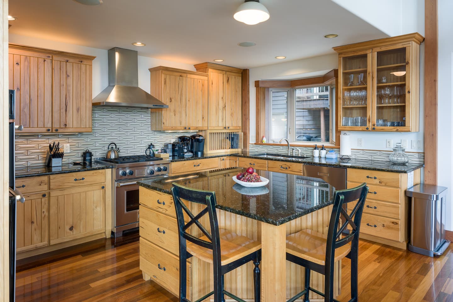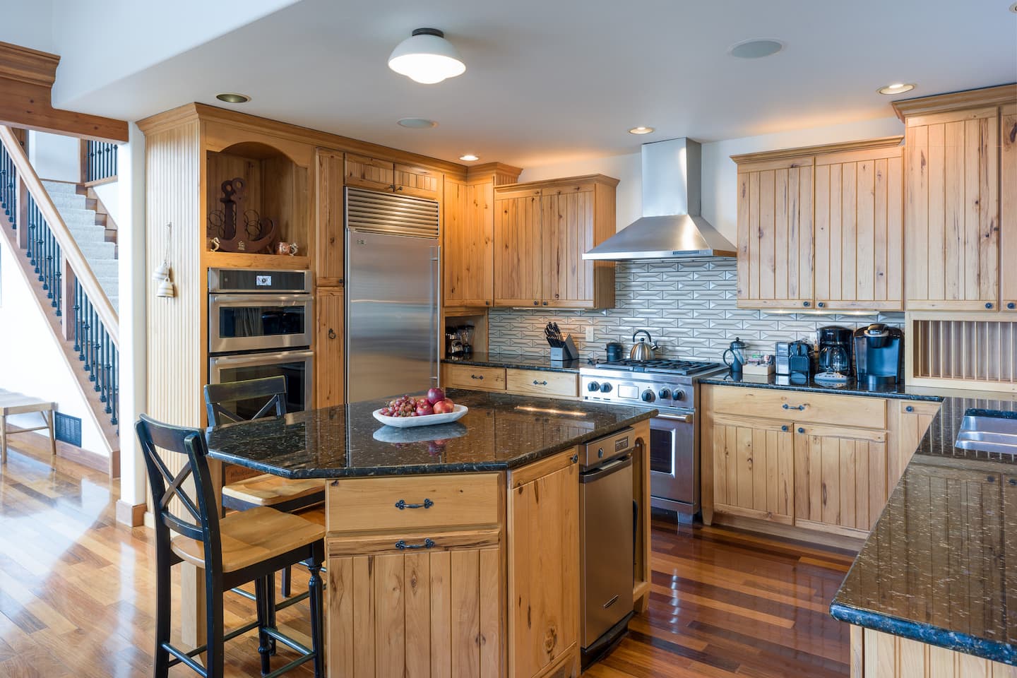 Our well-appointed kitchen features custom tile work and granite countertops with an island for preparing meals. This is a Chef's dream with quality stainless steel appliances, including a six-burner Wolf gas range, a second wall oven, a microwave, a Sub-Zero refrigerator, and Kitchen Aid dishwasher. We’ve equipped the coffee bar with a Keurig, Drip Coffee Maker, Nespresso, coffee grinder, and French press, and a selection of tea, beans and sweeteners. You find a full selection of bakeware, cookware, and plenty of kitchen gadgets for a fantastic cooking experience!
