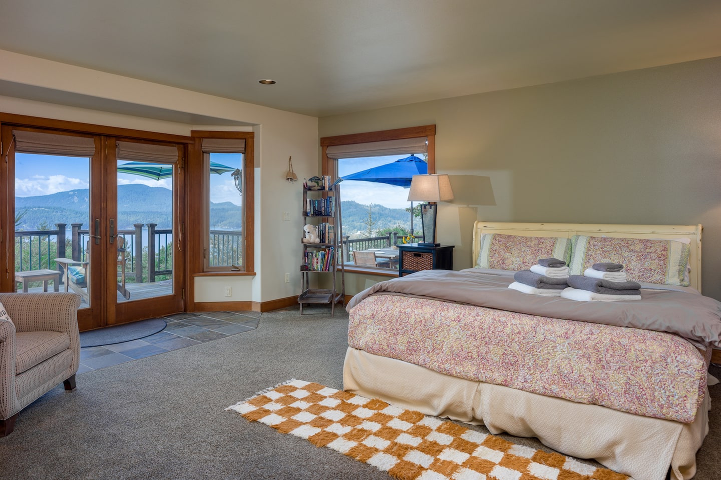 Adjacent and open to the kitchen is a large wooden dining table that seats nine. Step through the French doors to the deck, where you’ll find a large BBQ and teak tables and chairs for outdoor dining, accommodating ten guests. With incredible views and spacious decks, outdoor dining in the warmer months is a delight!