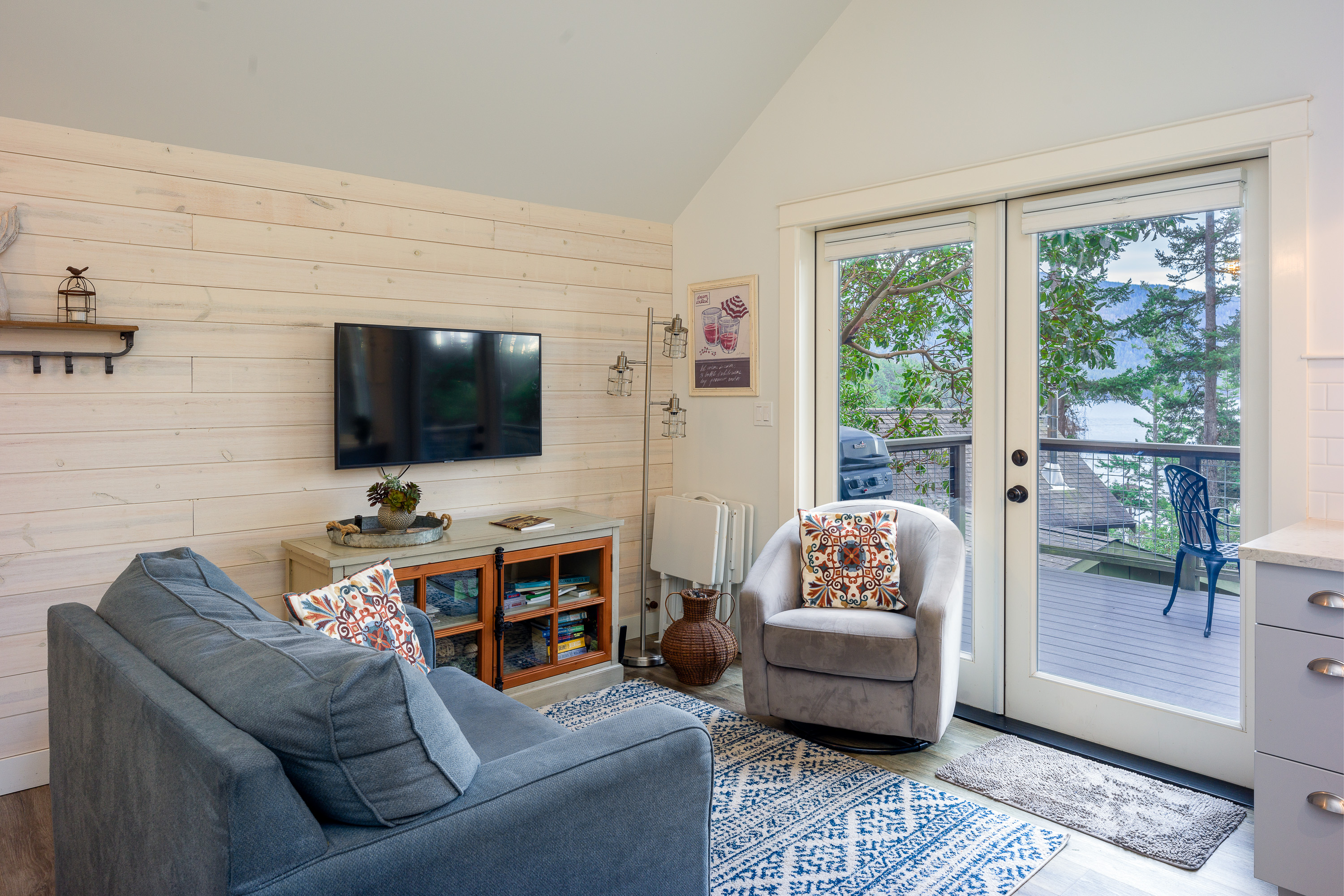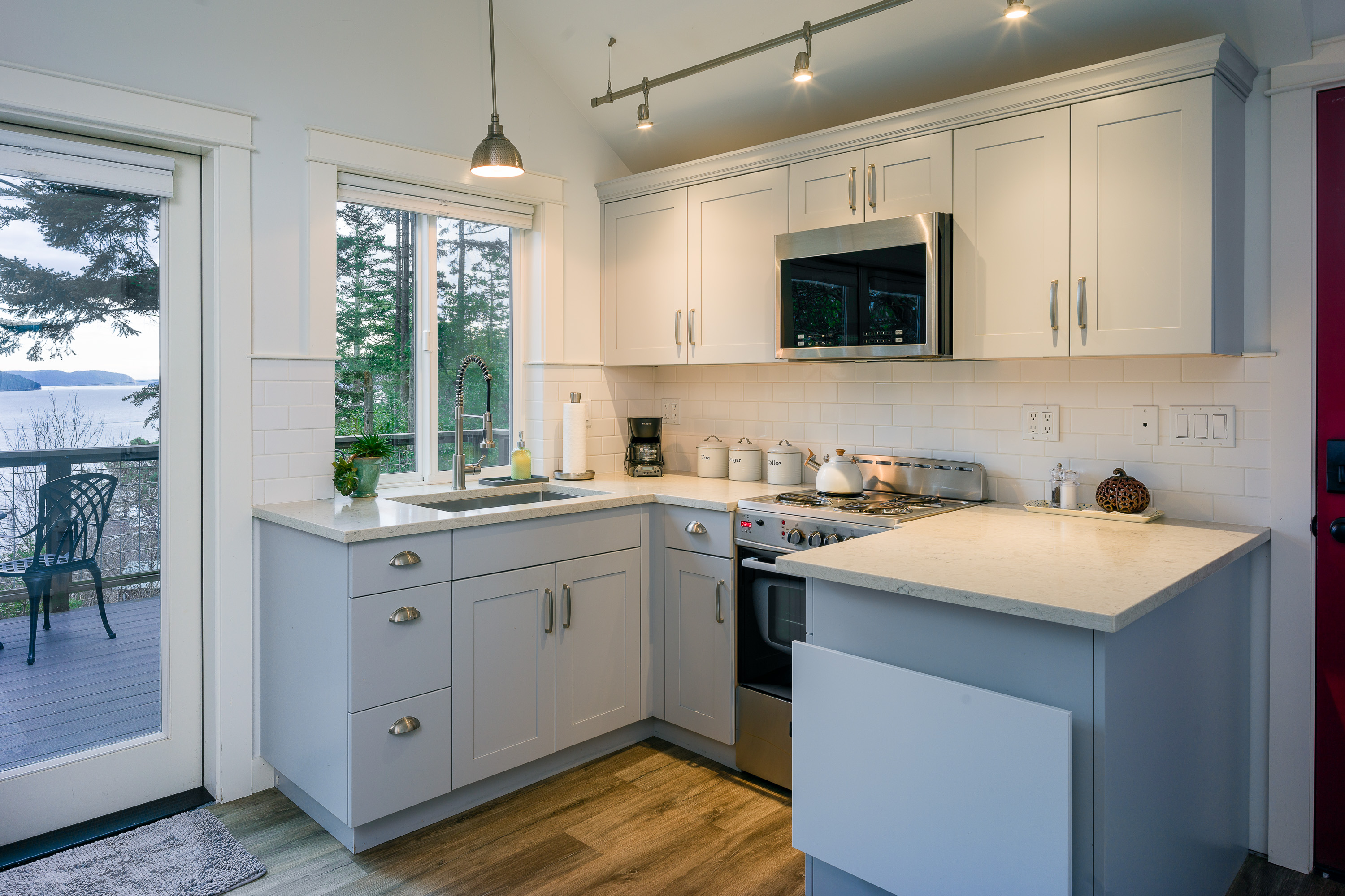 With beautiful views of East Sound on Orcas Island, this charming, studio cottage was fully updated in 2019. Walking distance to restaurants, shopping, and the Eastsound Waterfront Park. Enjoy the sunrise and East Sound views from the deck, the sofa, and even the comfortable queen size bed in this lovely 300 sq. ft. cottage. This is the perfect solo or couple’s ‘getaway’ cottage with all new appliances, quartz countertops, tile bathroom, comfy bedding and new flooring.