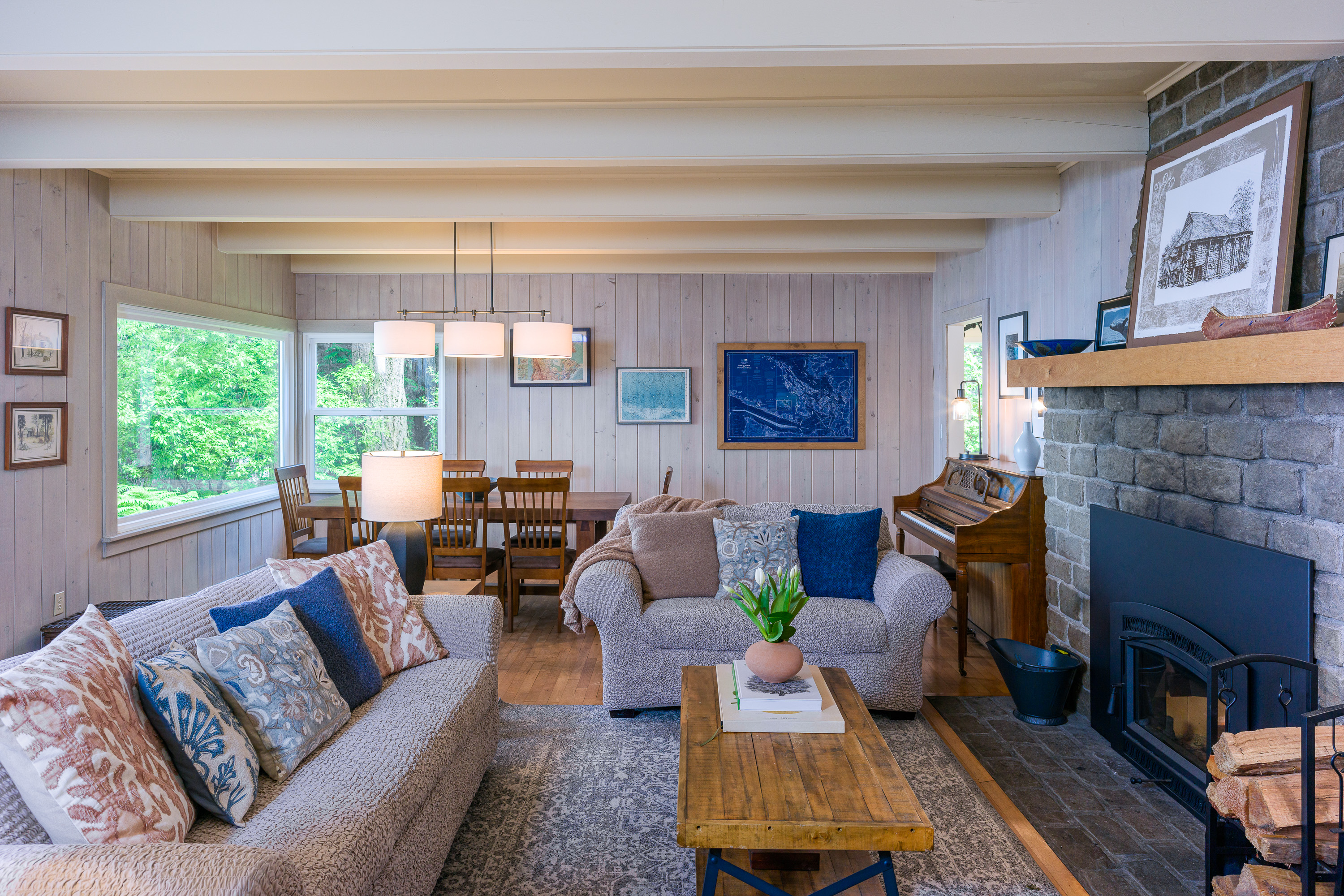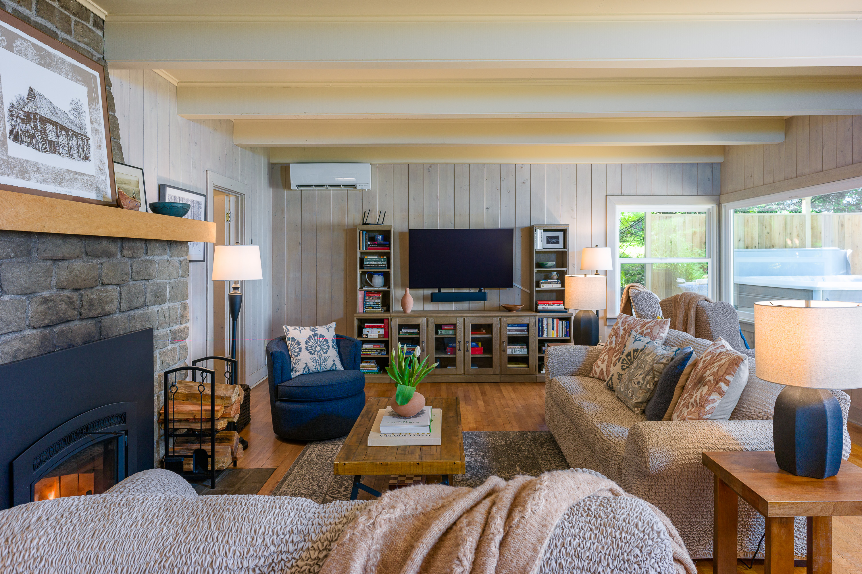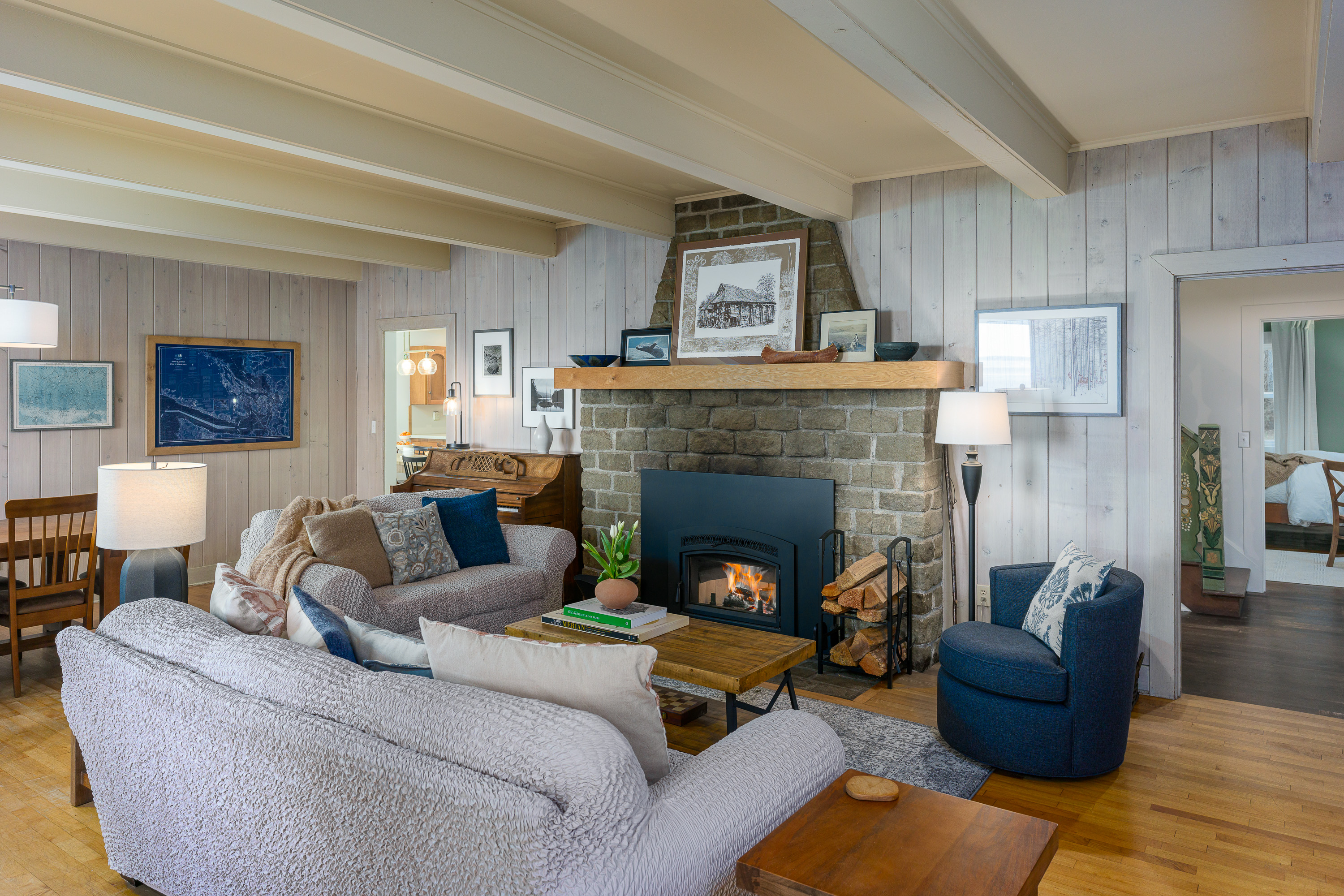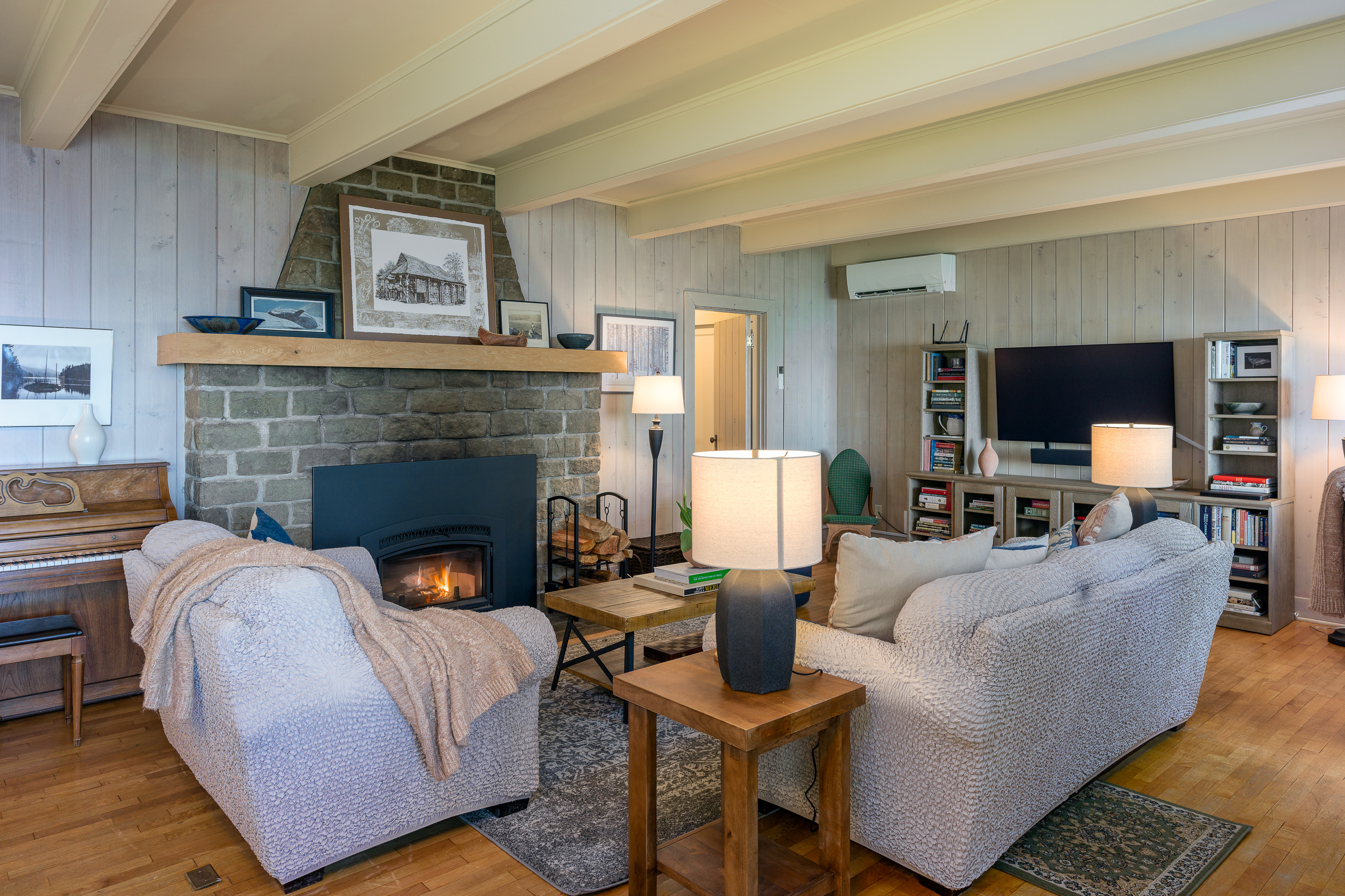 Our home offers a wood fireplace, plus the efficiency of a heat pump for both heating and air conditioning throughout the home. With the hand-built rock and doug fir mantle, you can imagine the stories told around the fireplace for the past 85 years. One family owned this beachfront farm from 1940 until 2017, when the current owners lovingly took on the care of this amazing home. Its now blessed with both modern amenities like a Smart TV and WIFI, plus a piano and full library of books to enjoy.