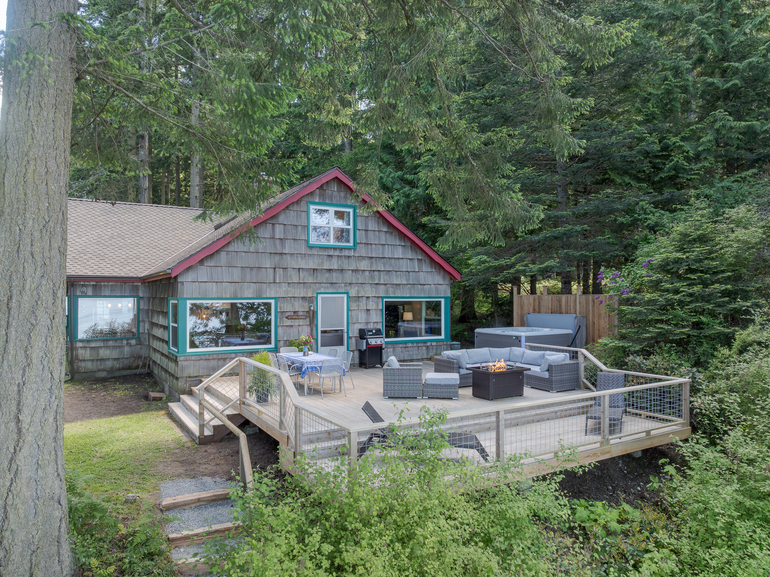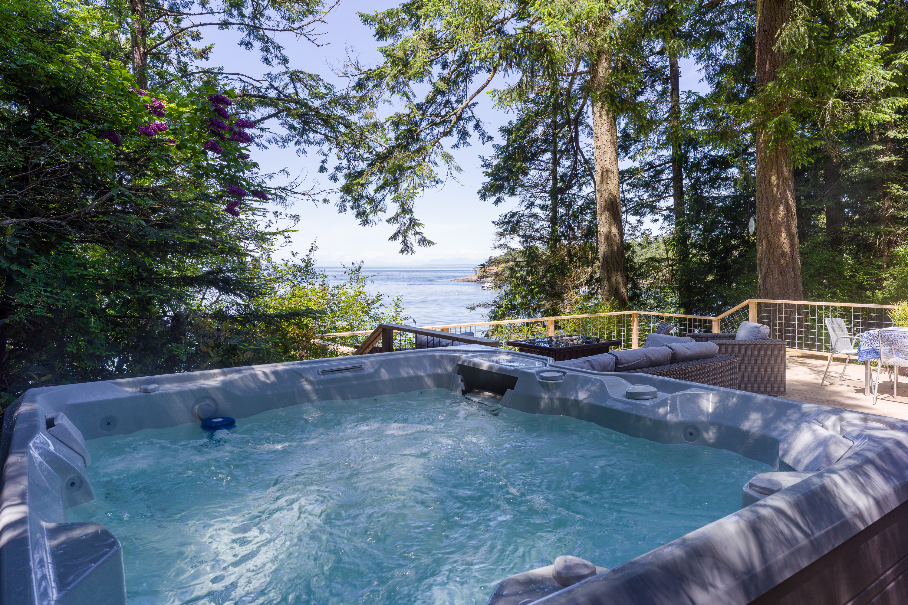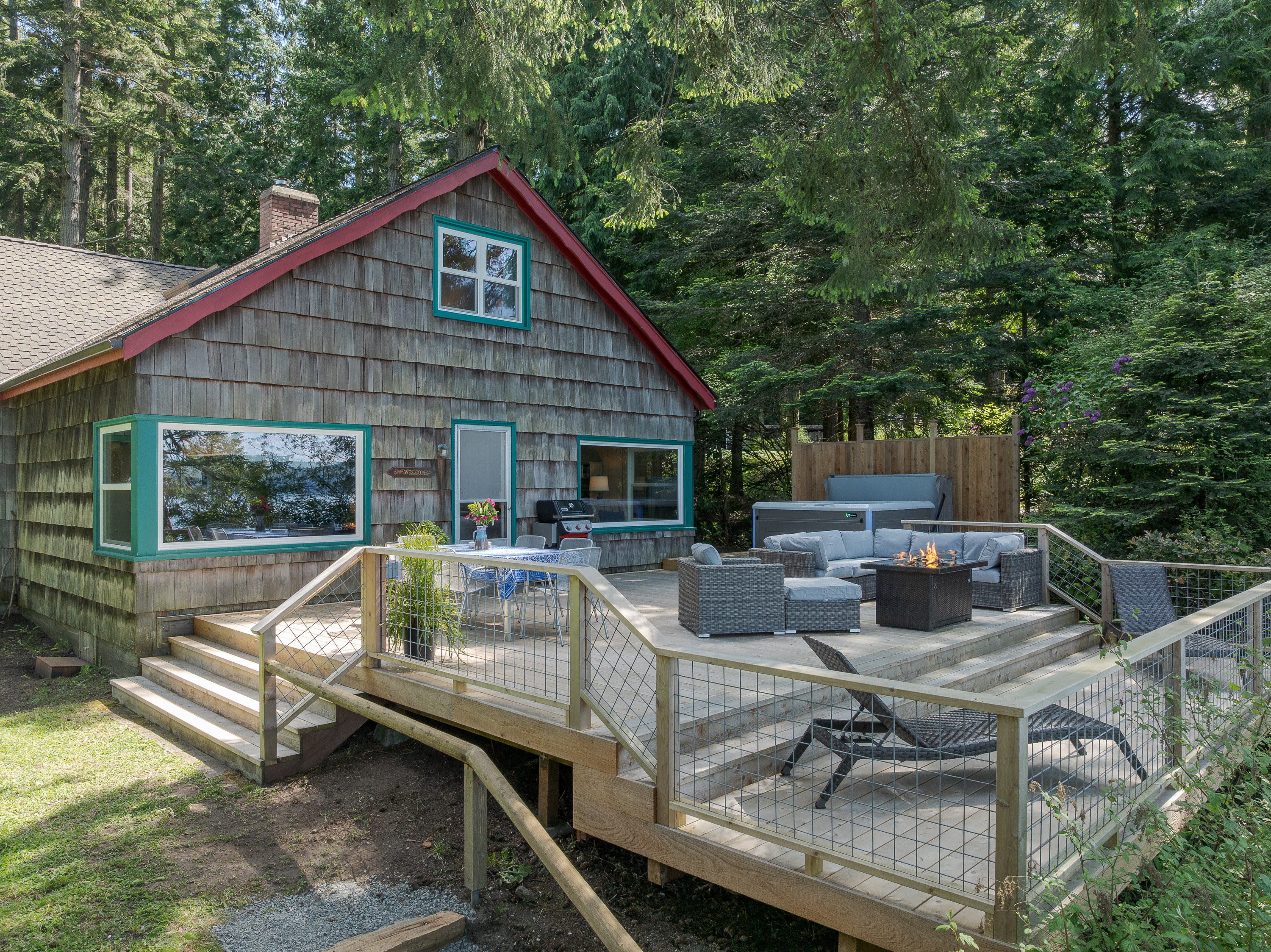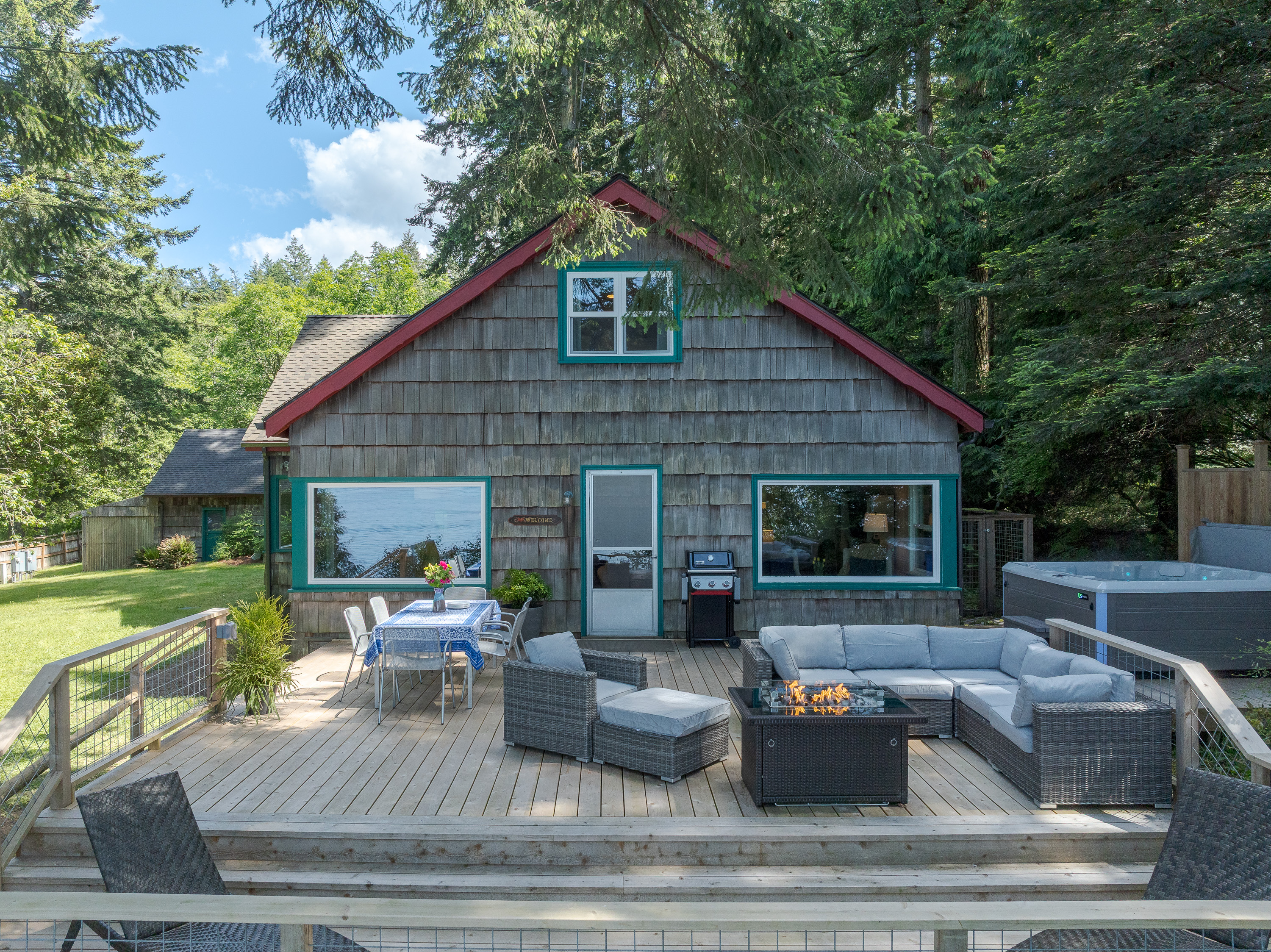 The custom cedar deck expands your living space to include a comfy lounge and firepit, a dining area and BBQ. Plus there is an infinity deck with chaise lounges for cooling down after soaking in the hot tub. With privacy and towering trees above, you'll hear the eagles whistling in the trees and be able to spot seal bobbing in the waters below. The deck is an amazing extension that is just outside the cottage yet brings you directly in touch with the natural world around you. With outdoor lighting in the hot tub area and dining space, you'll be able to enjoy your time well into the evening.