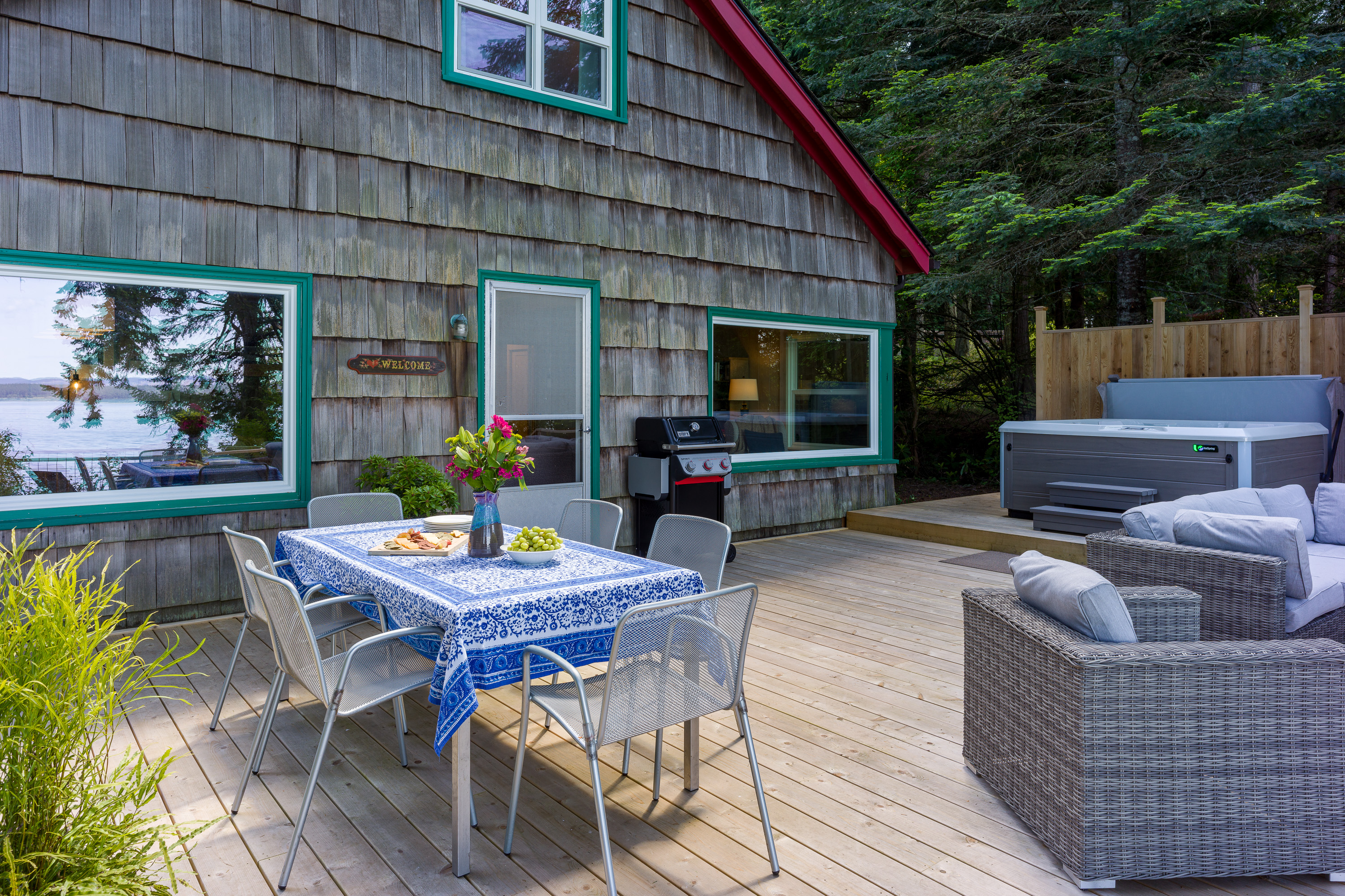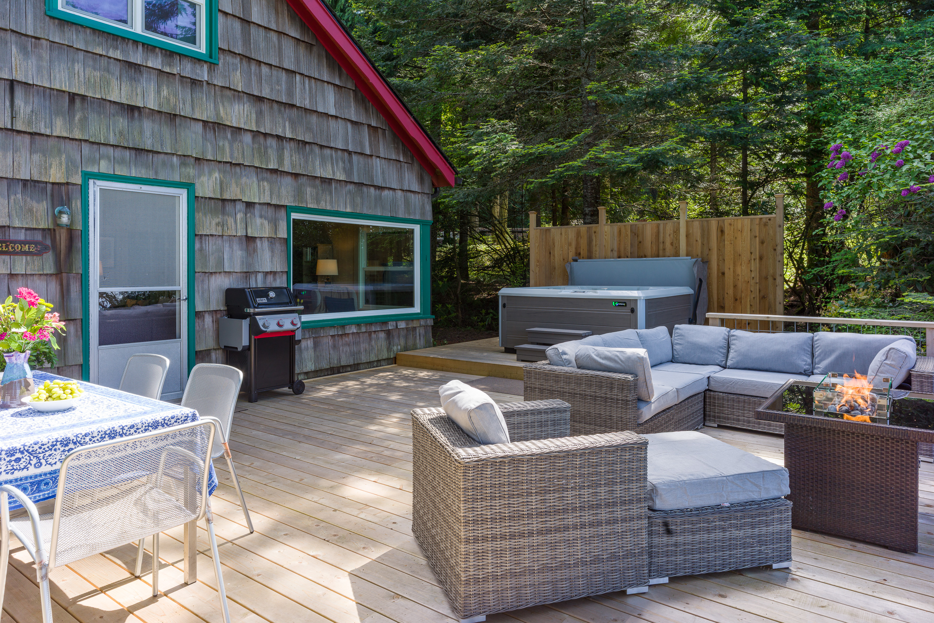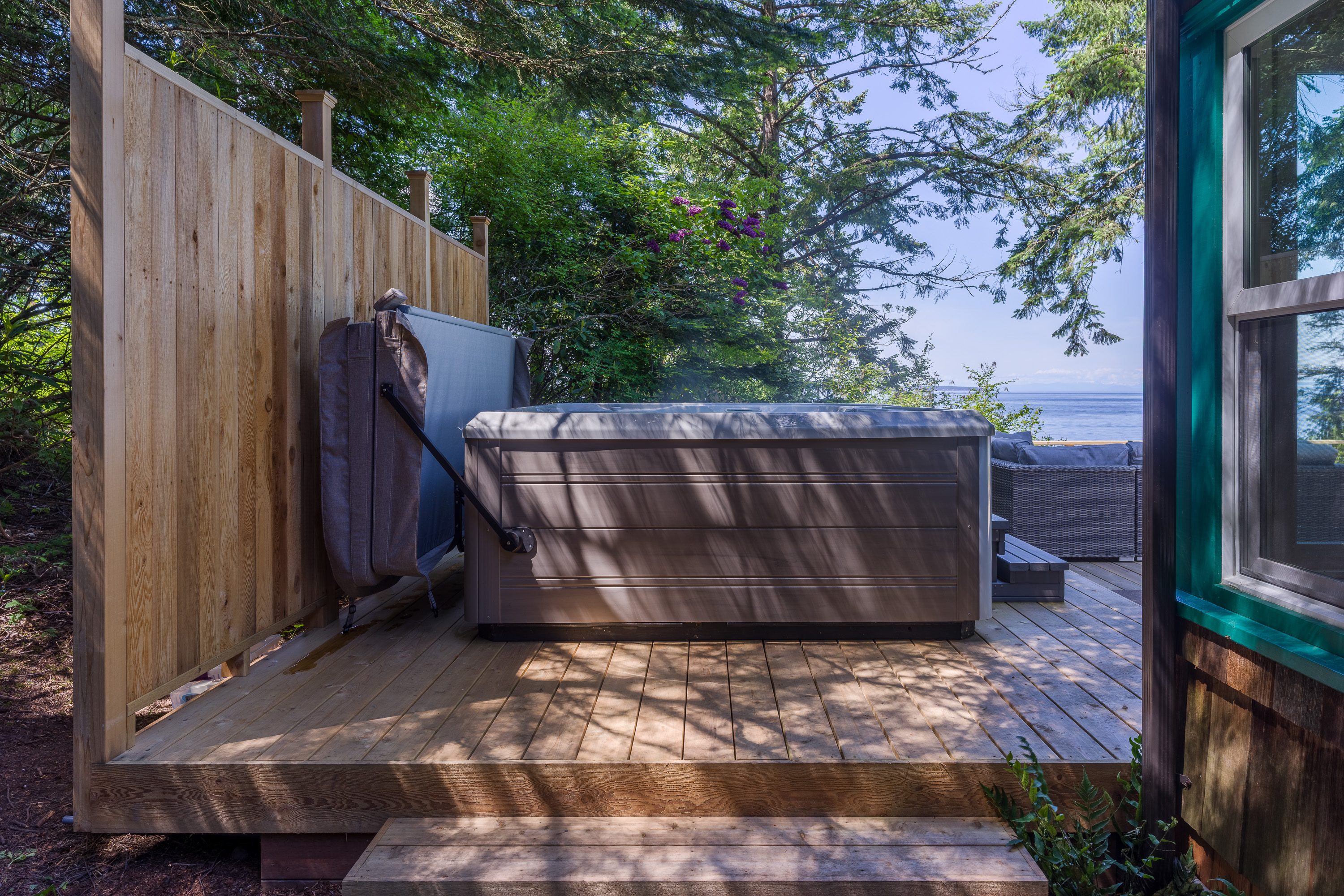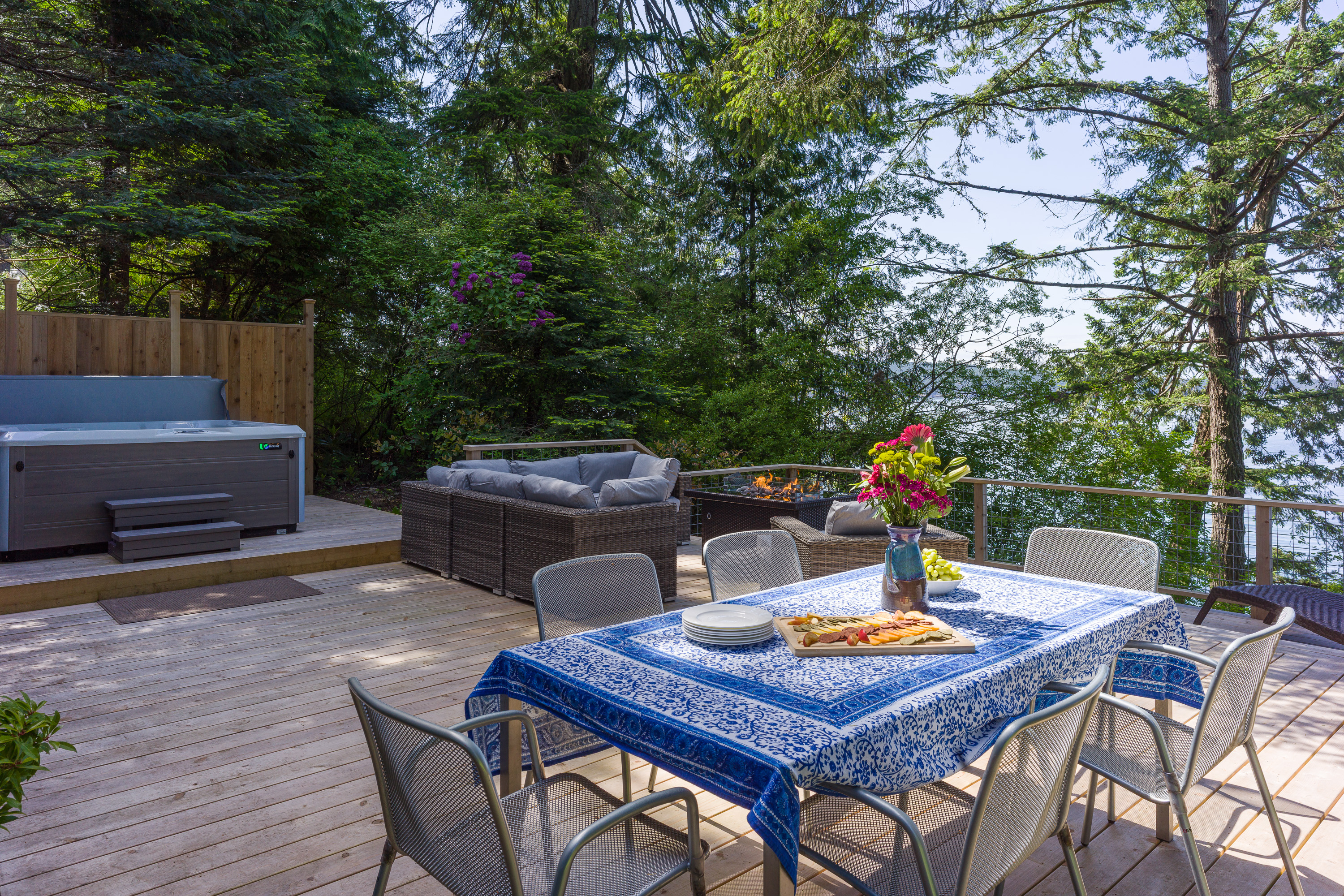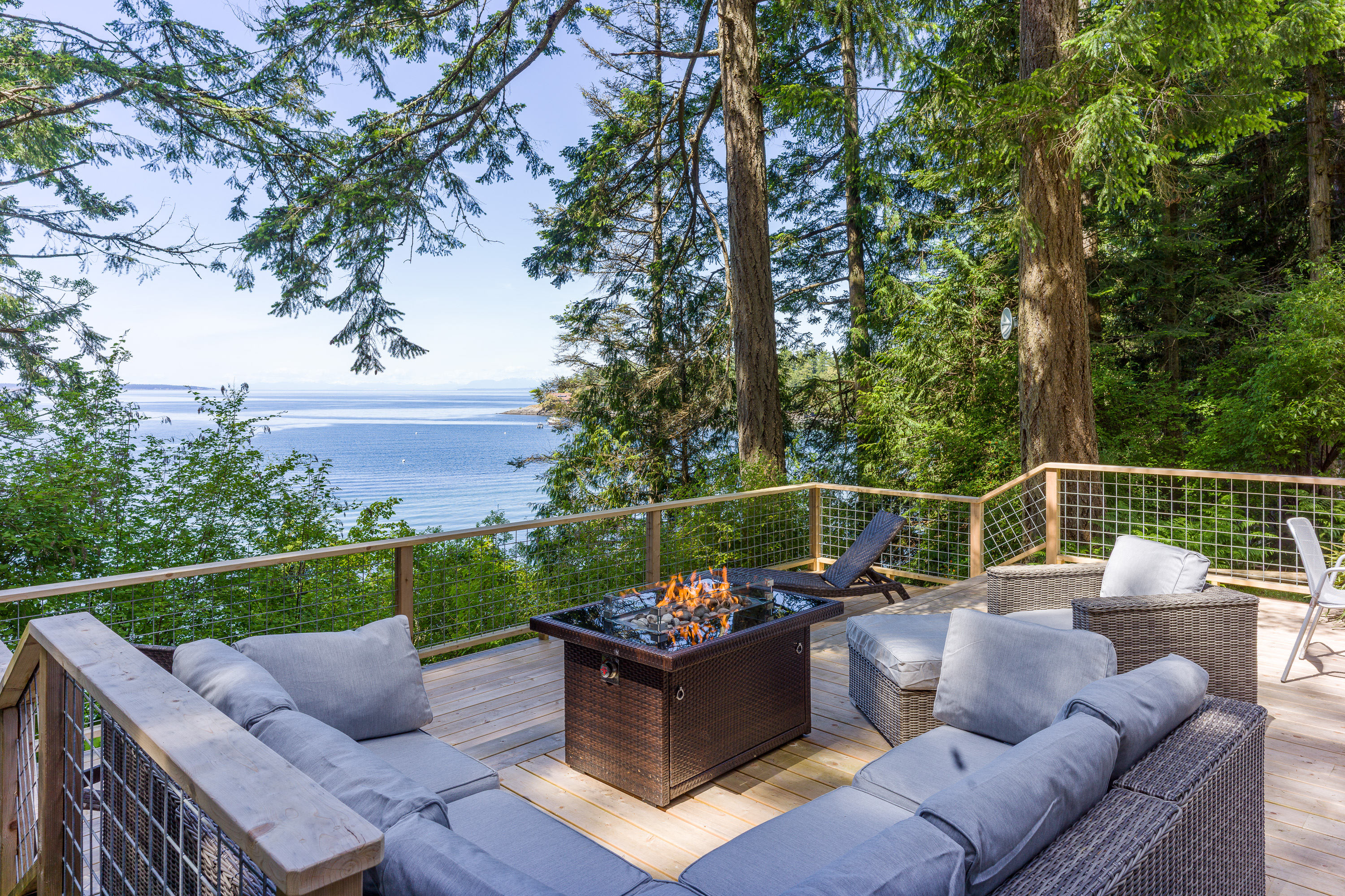 The custom cedar deck expands your living space to include a comfy lounge and firepit, a dining area and BBQ. Plus there is an infinity deck with chaise lounges for cooling down after soaking in the hot tub. With privacy and towering trees above, you'll hear the eagles whistling in the trees and be able to spot seal bobbing in the waters below. The deck is an amazing extension that is just outside the cottage yet brings you directly in touch with the natural world around you. With outdoor lighting in the hot tub area and dining space, you'll be able to enjoy your time well into the evening.