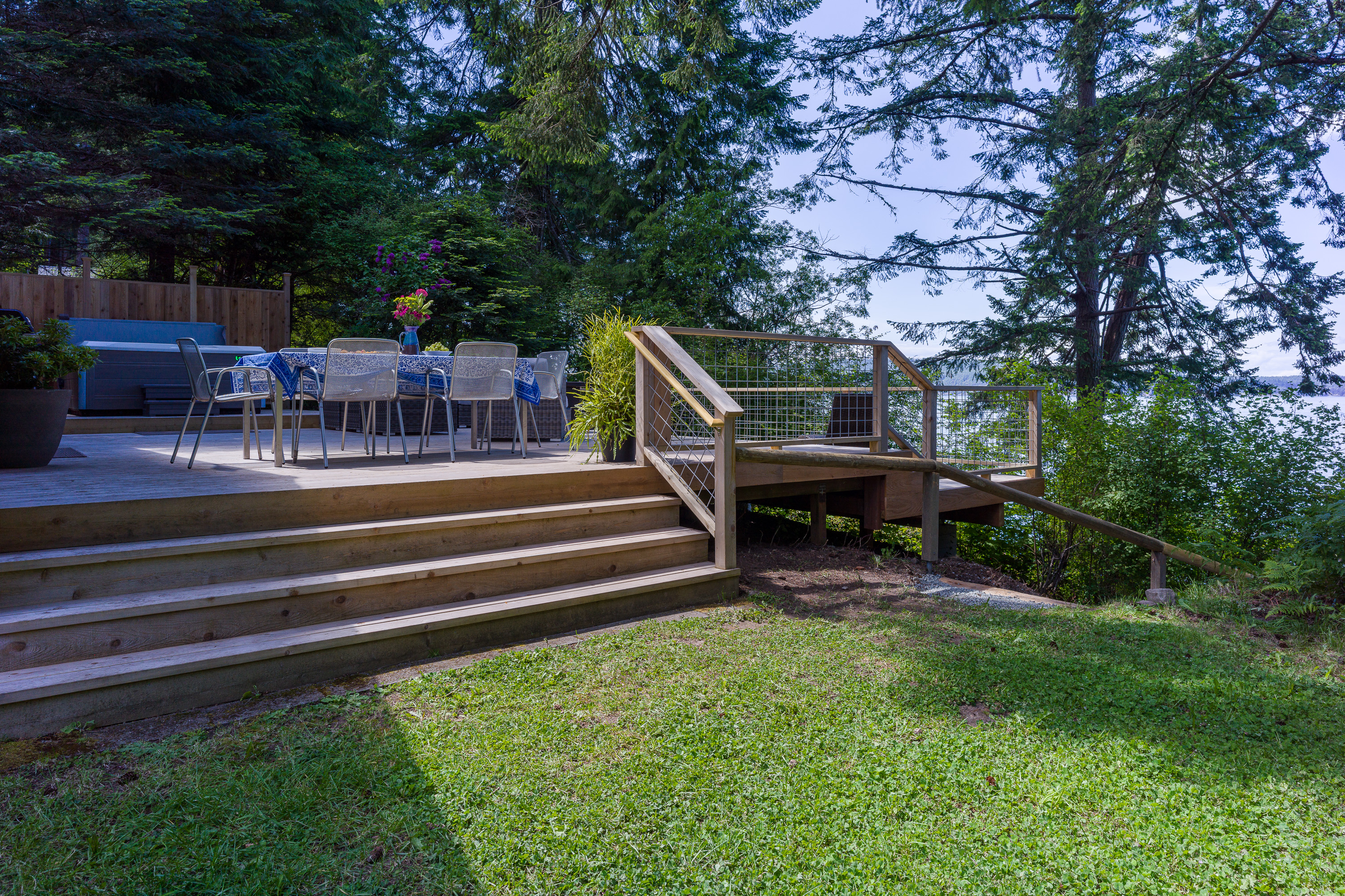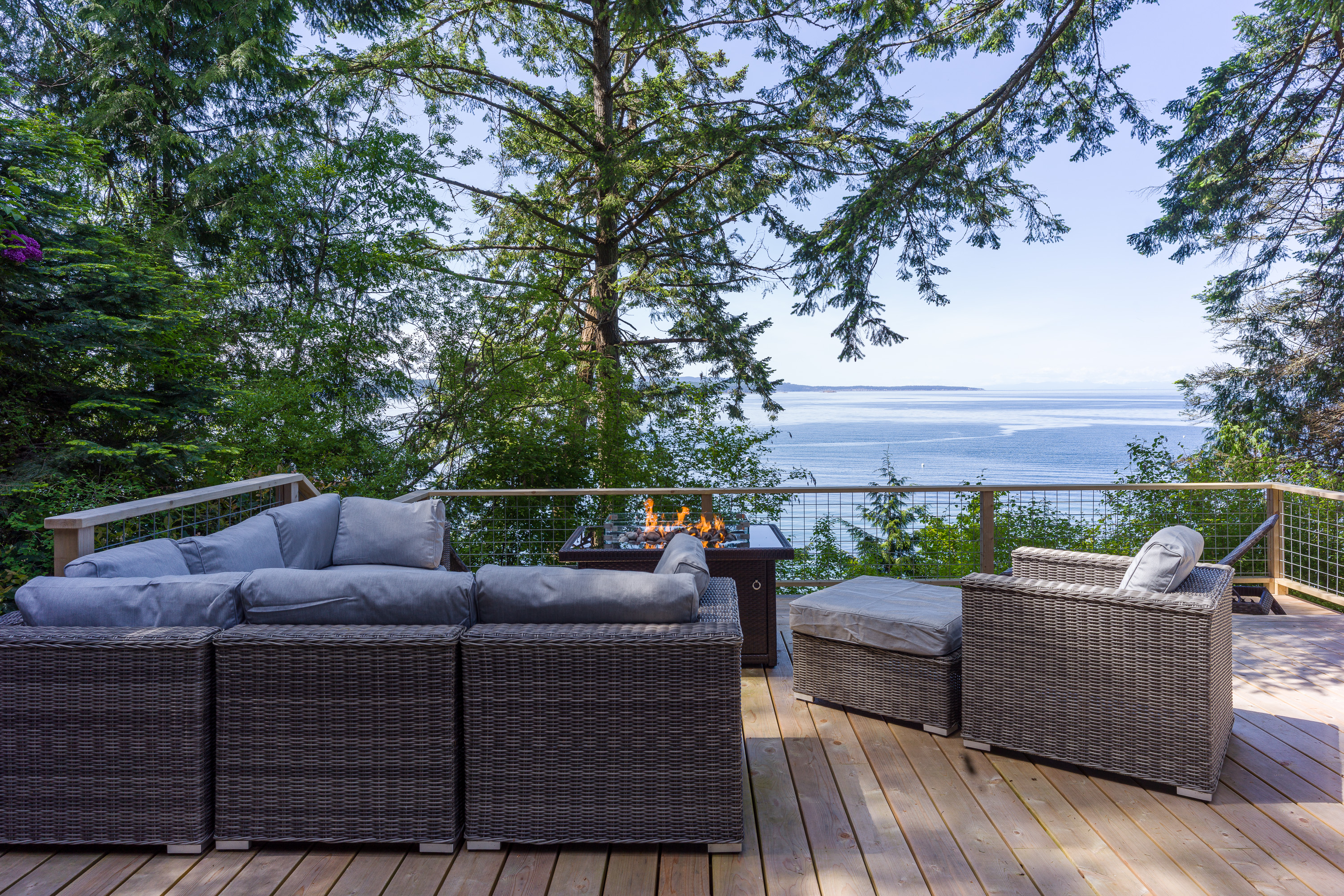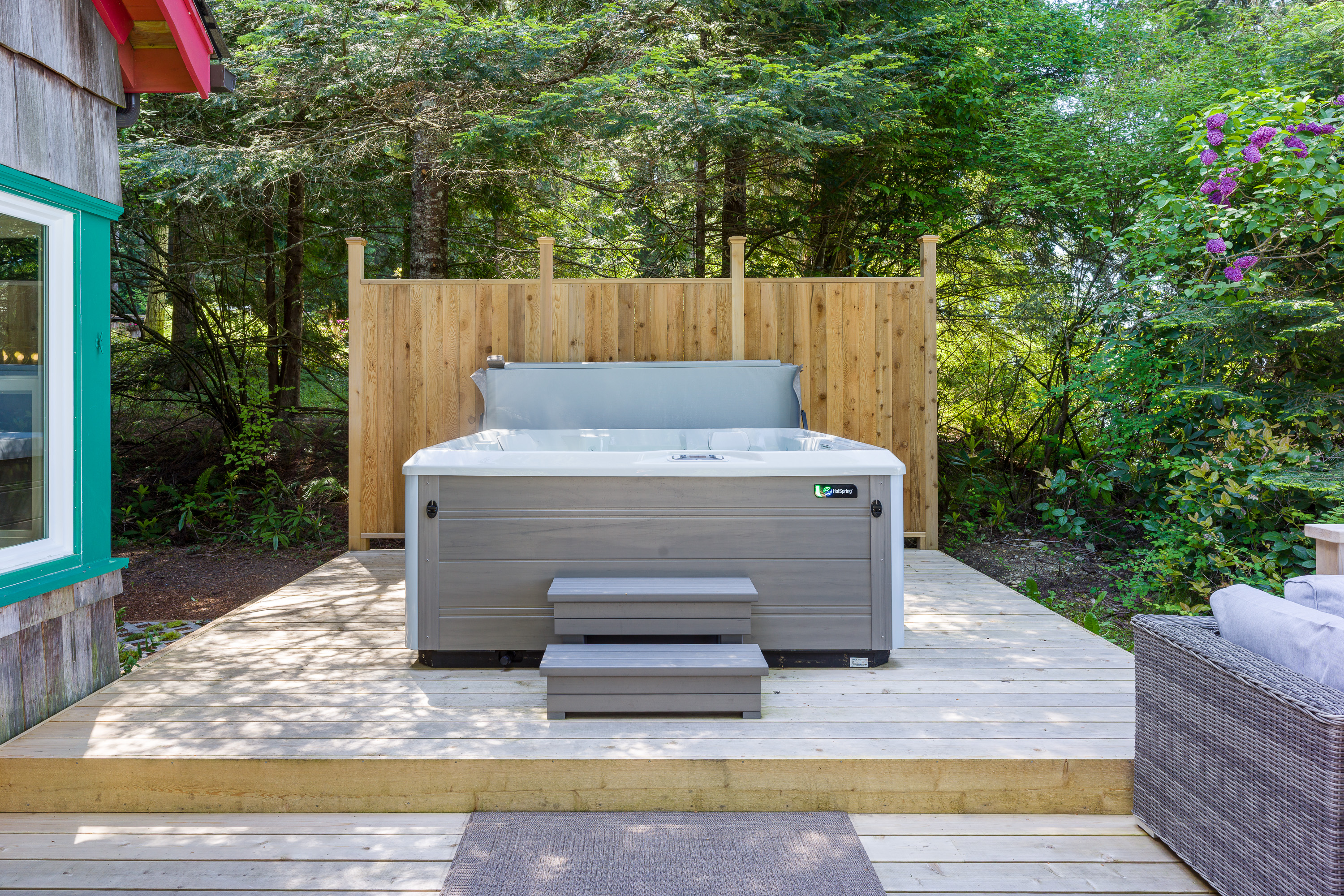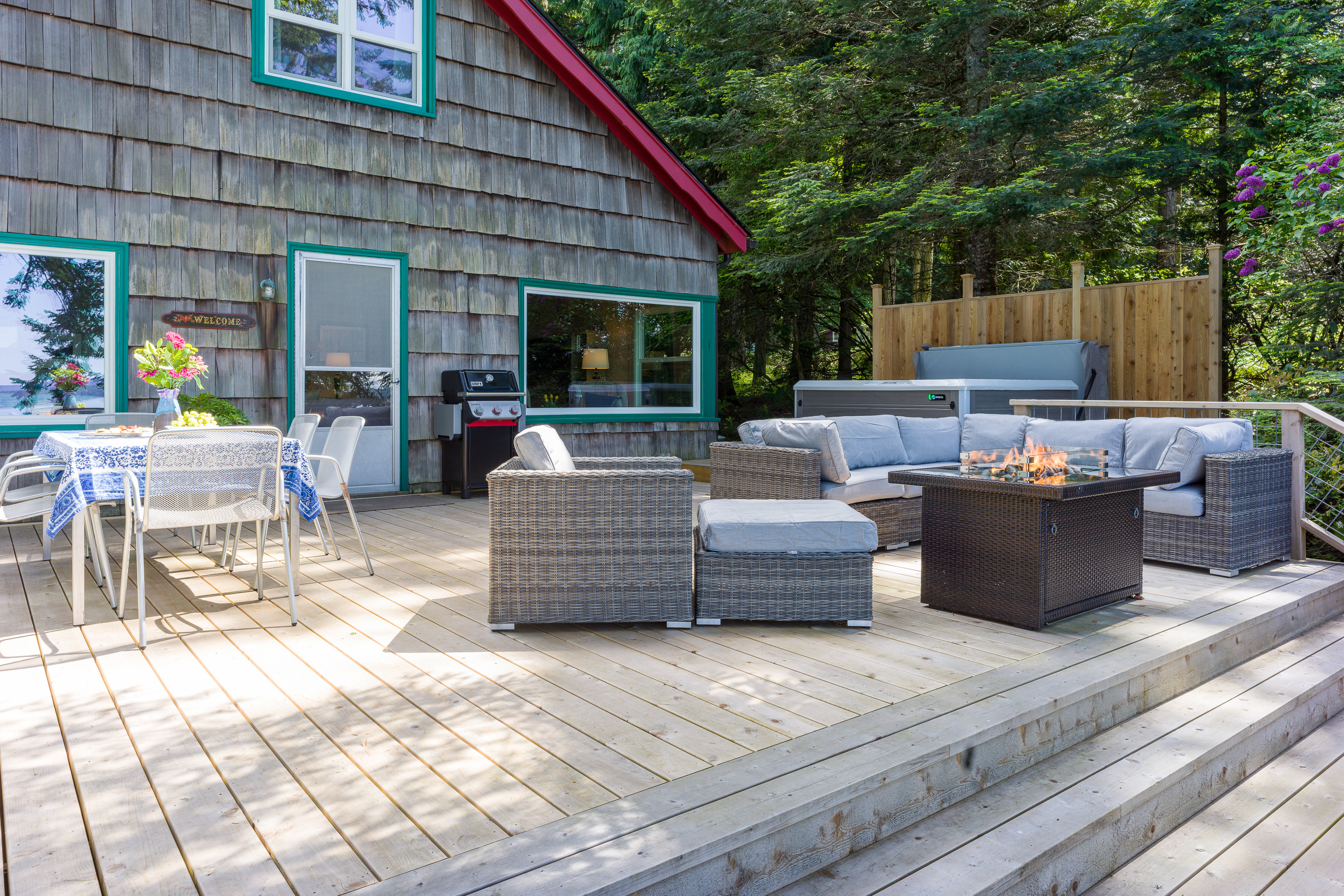 The custom cedar deck expands your living space to include a comfy lounge and firepit, a dining area and BBQ. Plus there is an infinity deck with chaise lounges for cooling down after soaking in the hot tub. With privacy and towering trees above, you'll hear the eagles whistling in the trees and be able to spot seal bobbing in the waters below. The deck is an amazing extension that is just outside the cottage yet brings you directly in touch with the natural world around you. With outdoor lighting in the hot tub area and dining space, you'll be able to enjoy your time well into the evening.