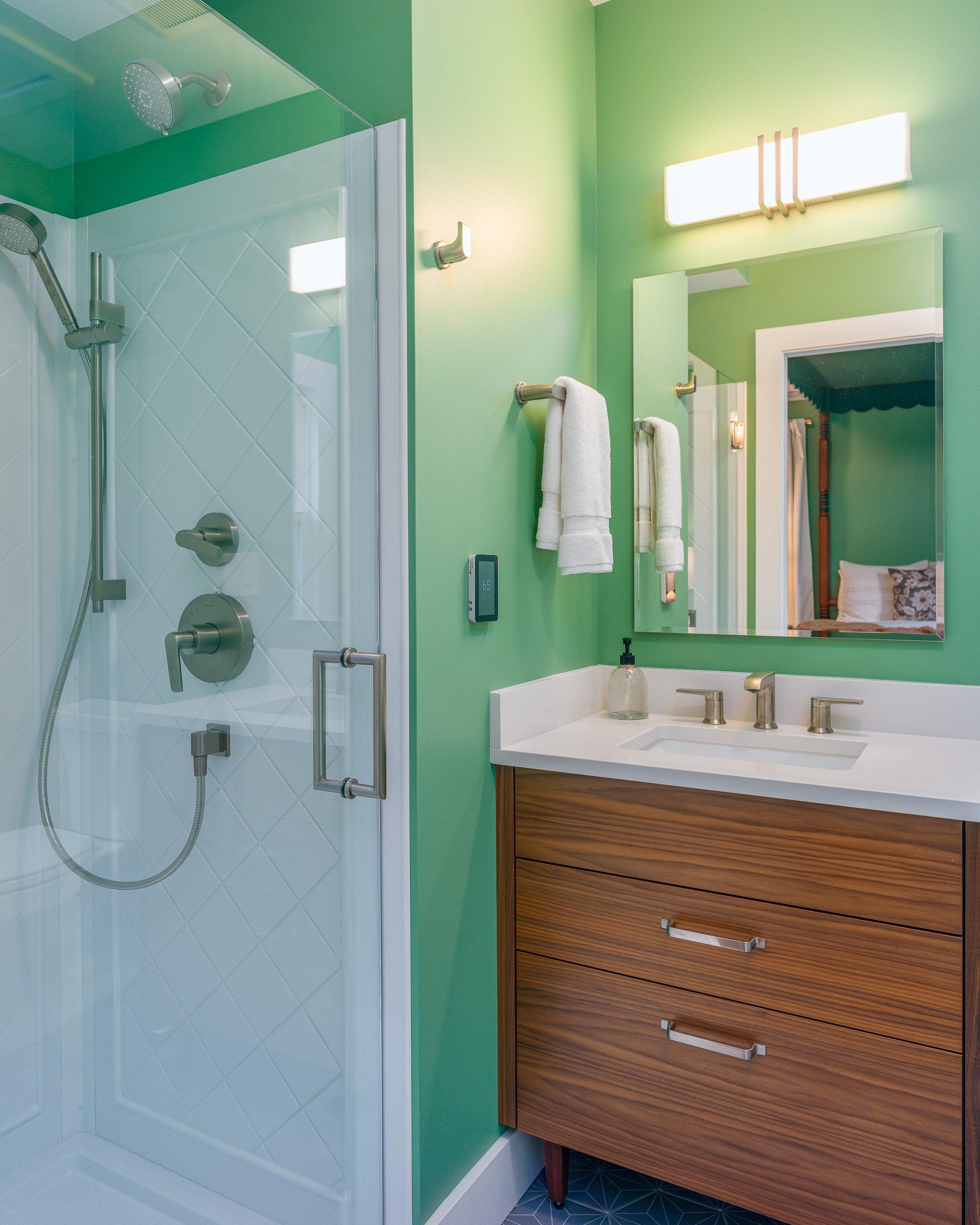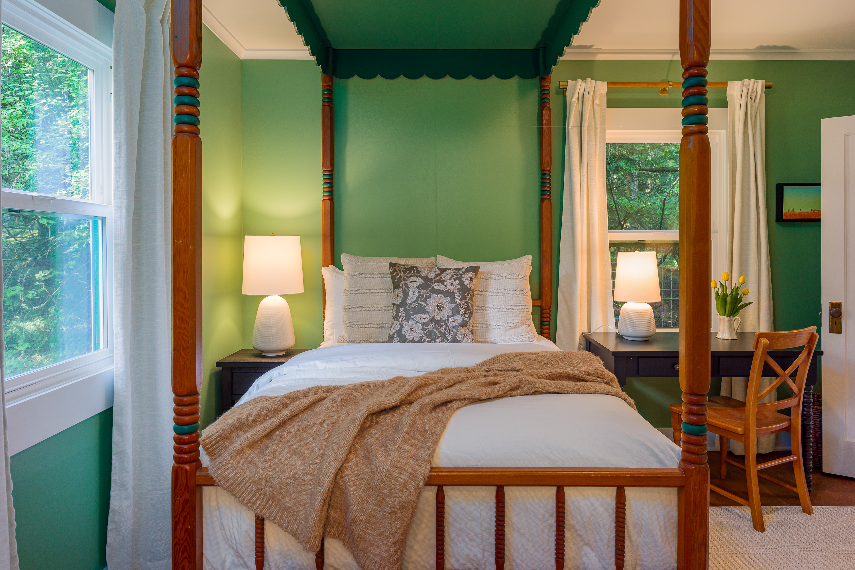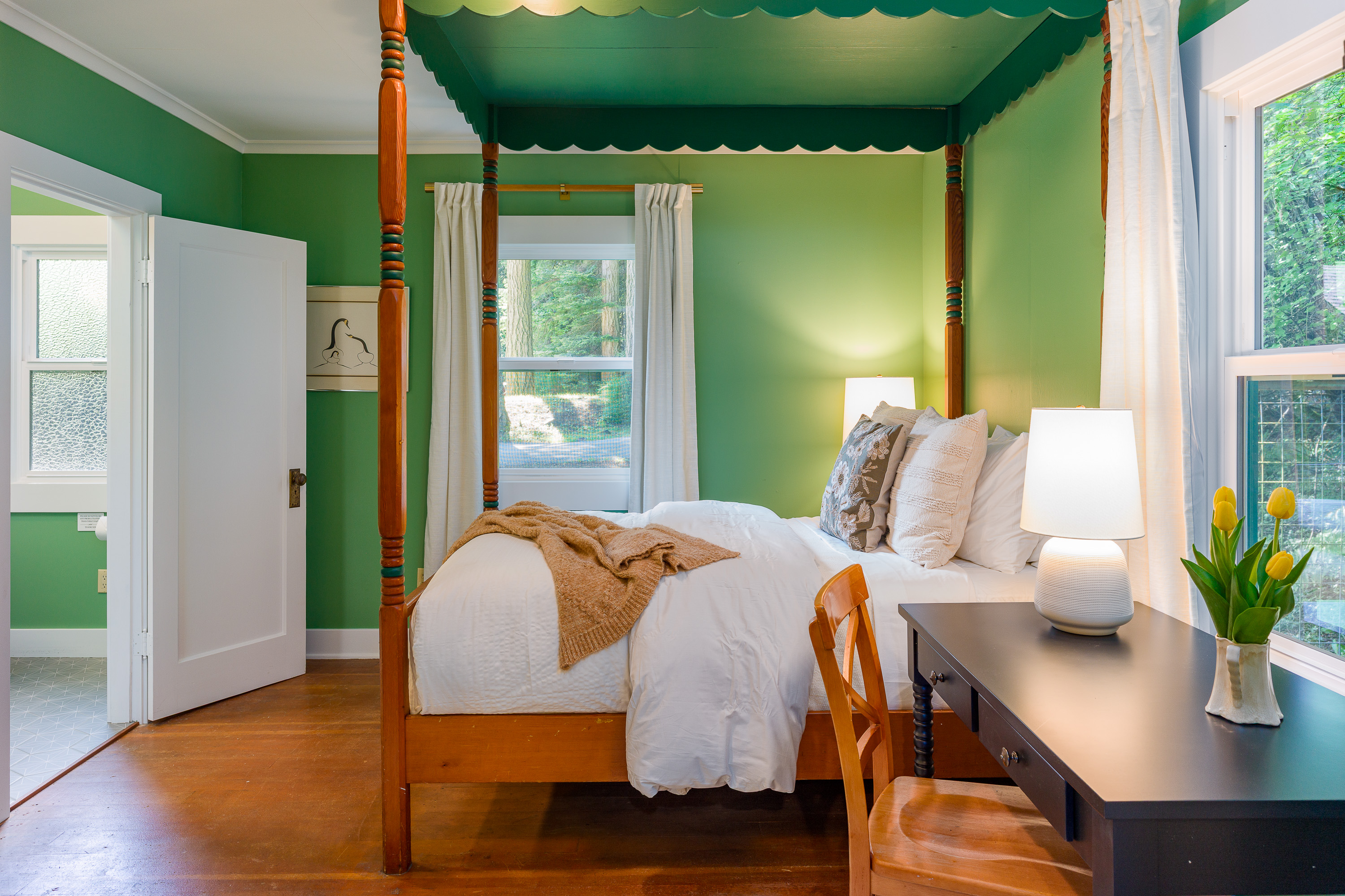 The downstairs fourth bedroom, The Green Room, has an ensuite bathroom with a shower and vanity, walk-in closet and writers desk. With easy accessibility, this bedroom is a guest favorite!