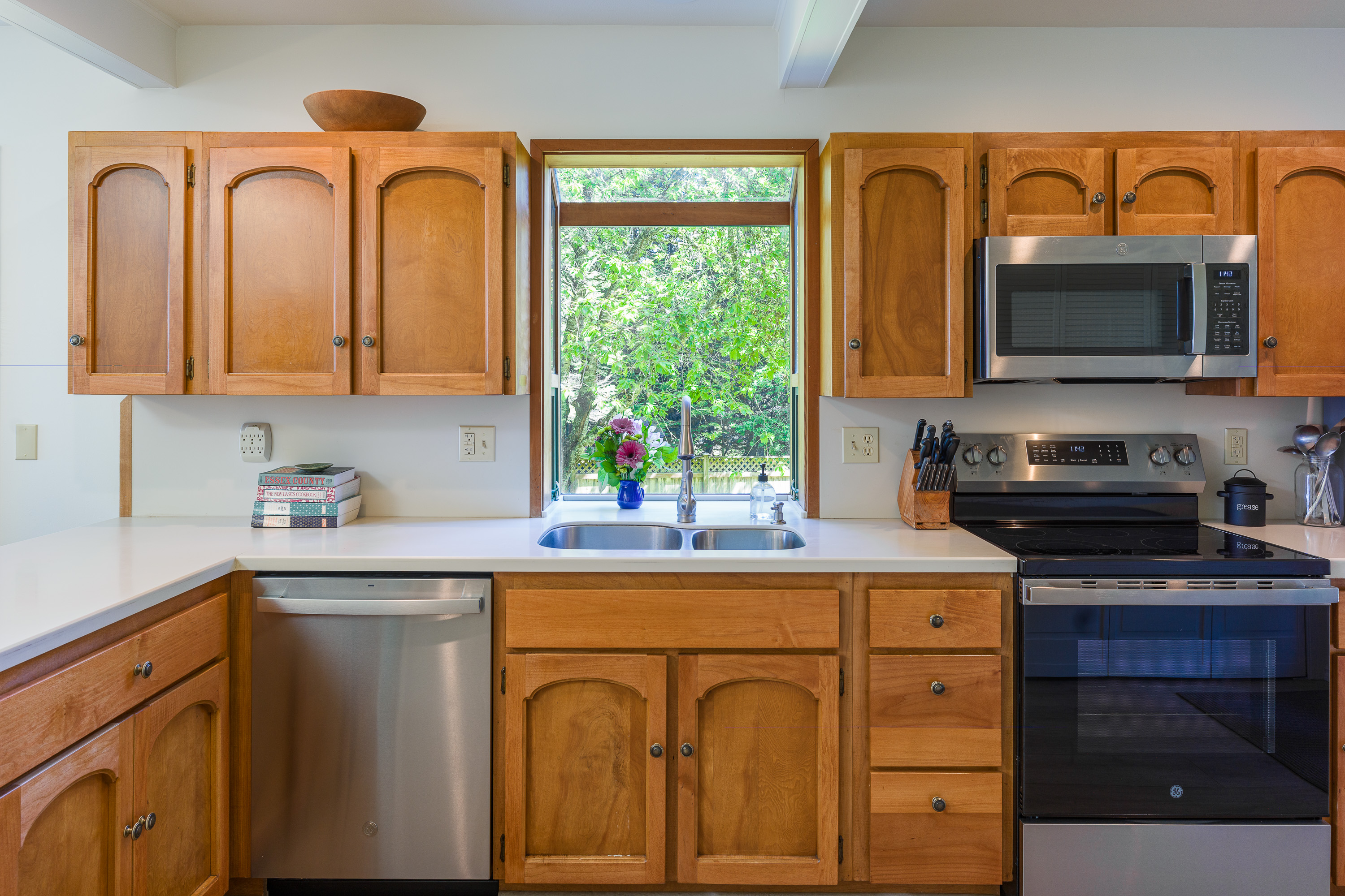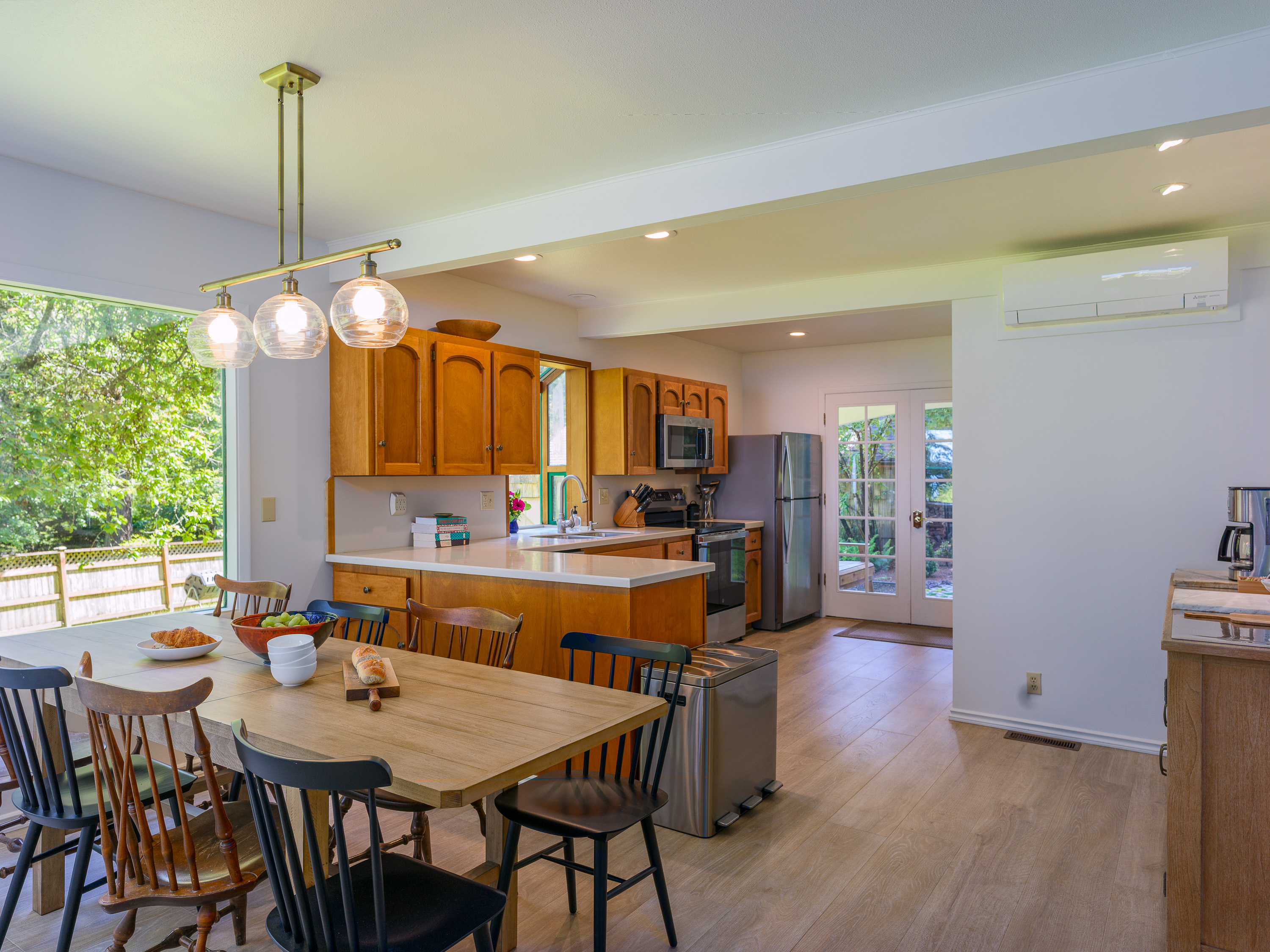 New stainless steel appliances and a fully equipped kitchen makes cooking at home a pleasure. The large country kitchen has vintage cabinets refinished with a beautiful selection of dinnerware, serve ware, and glasssware for every day and happy hour. Our large William-Sonoma table and chairs add to the charm with contemporary touches throughout. Our dedicated coffee bar proves to be popular each morning with a selection of teas, beans and sweeteners.
