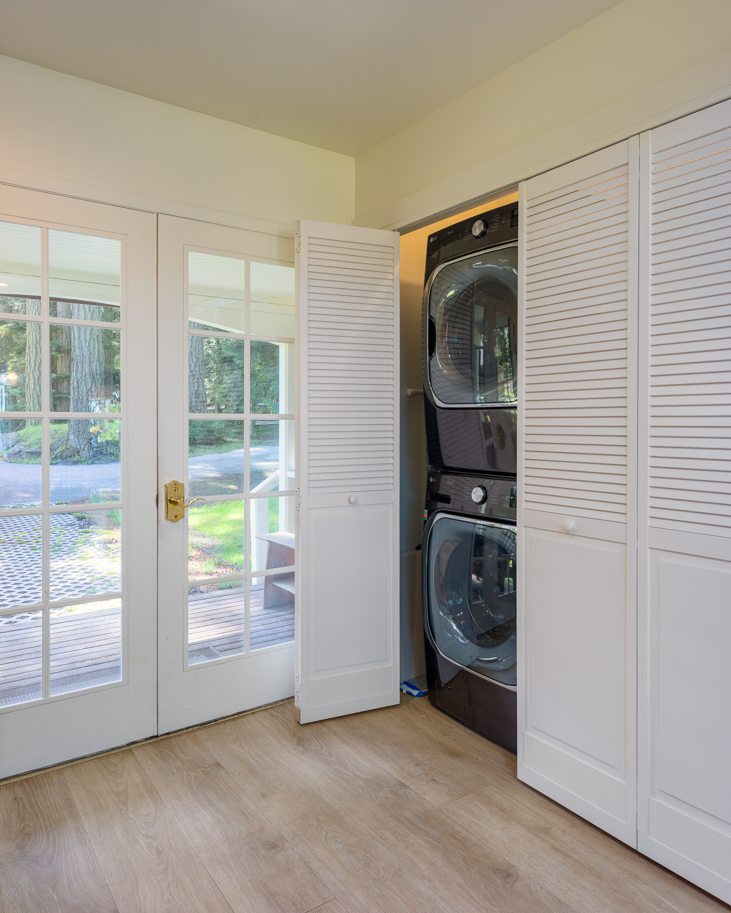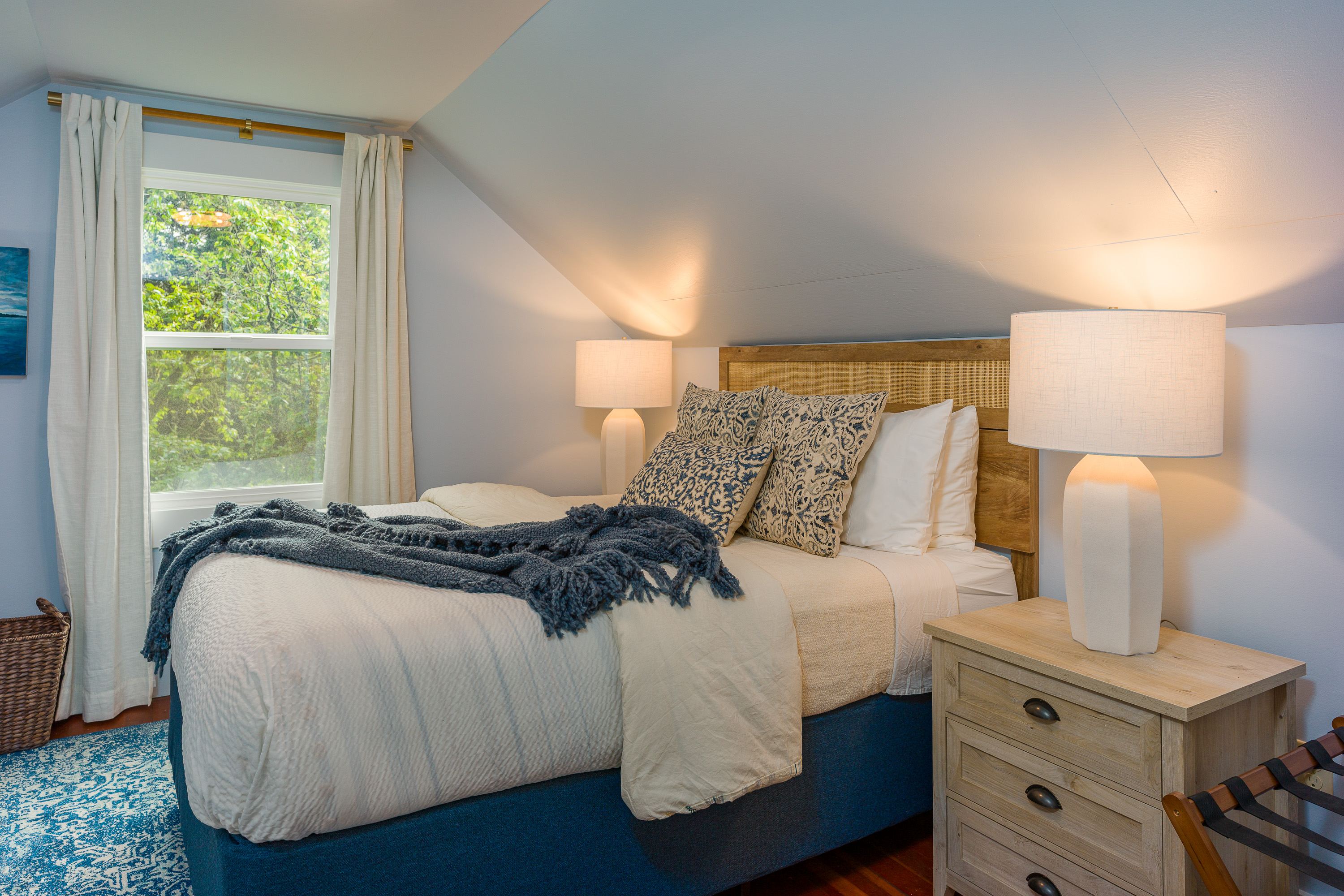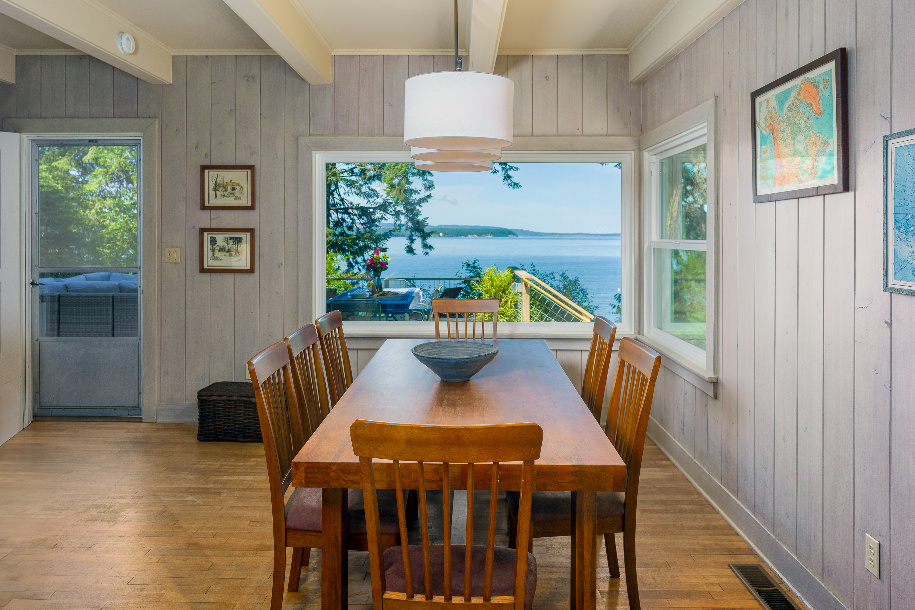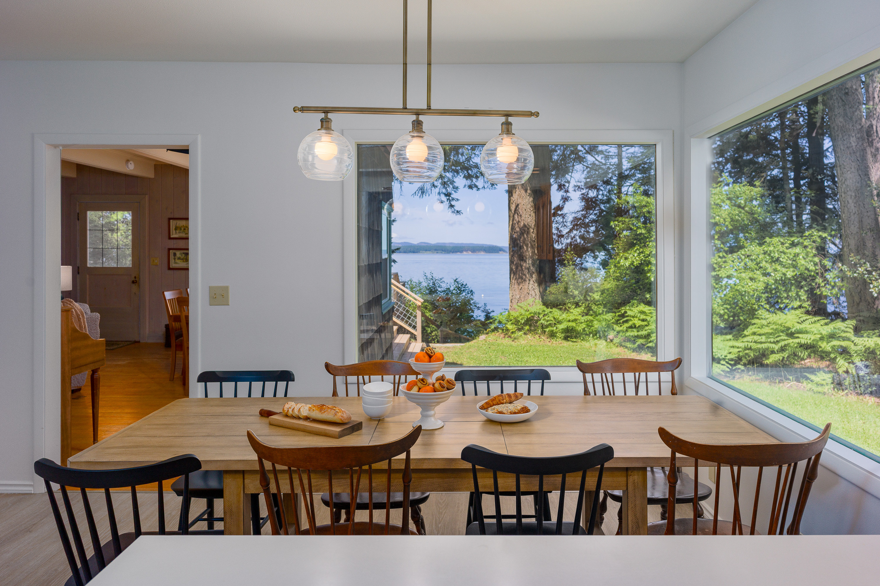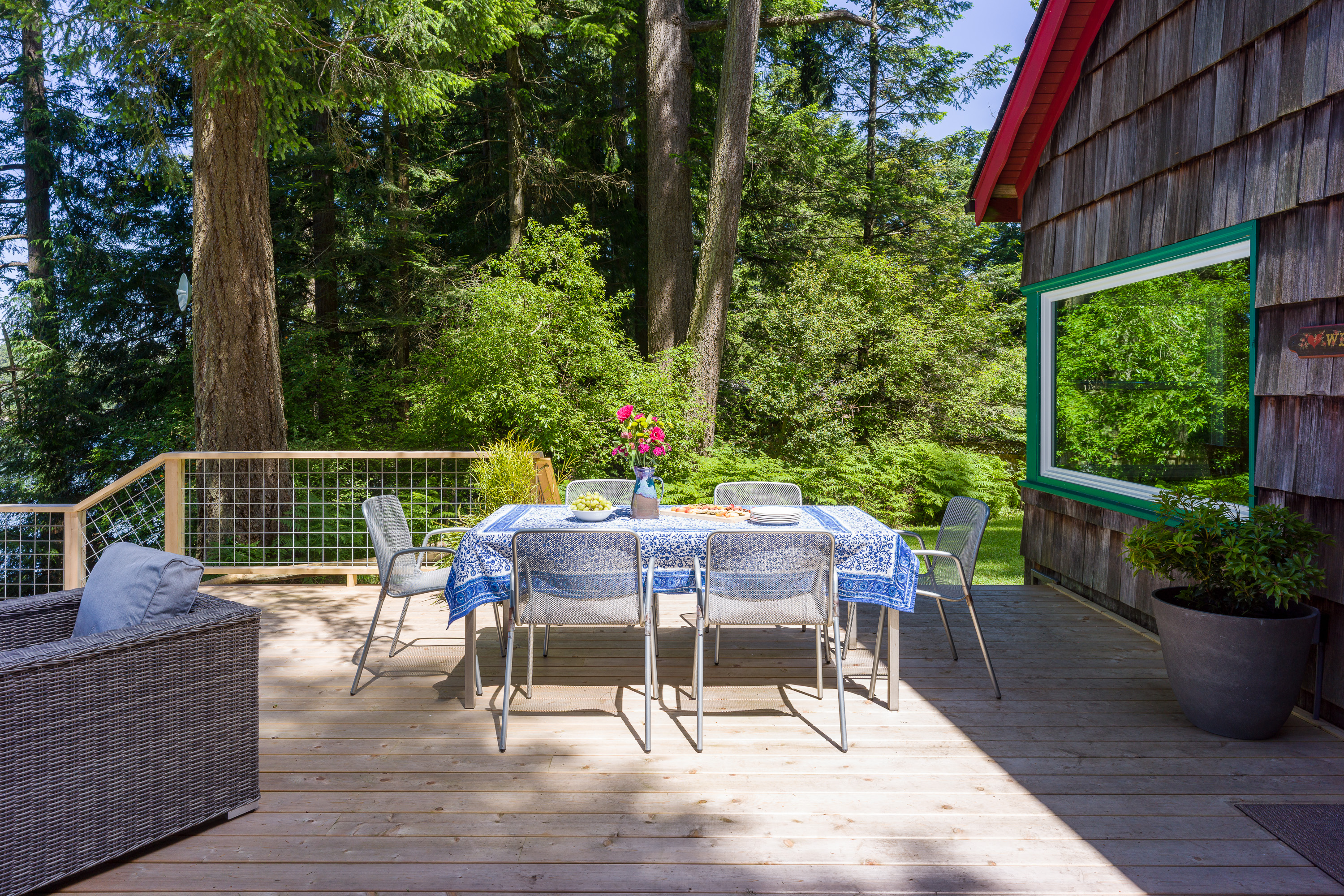 There are two new William-Sonoma dining tables to choose from. In the kitchen, there is seating for eight for breakfast and meal prep time. In the dining room, there is seating for eight to ten guests. Both rooms enjoy oversized windows with views to the water and old-growth trees. Outside there is a dining table for meals alfresco. The simple, white china and table cloth options create a refined yet casual table setting for any occasion.